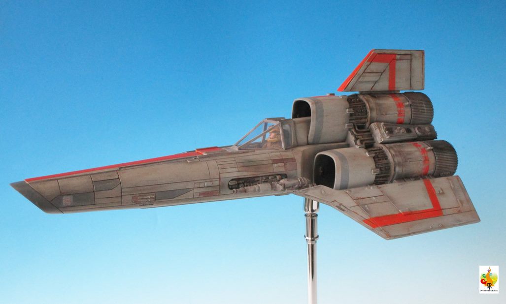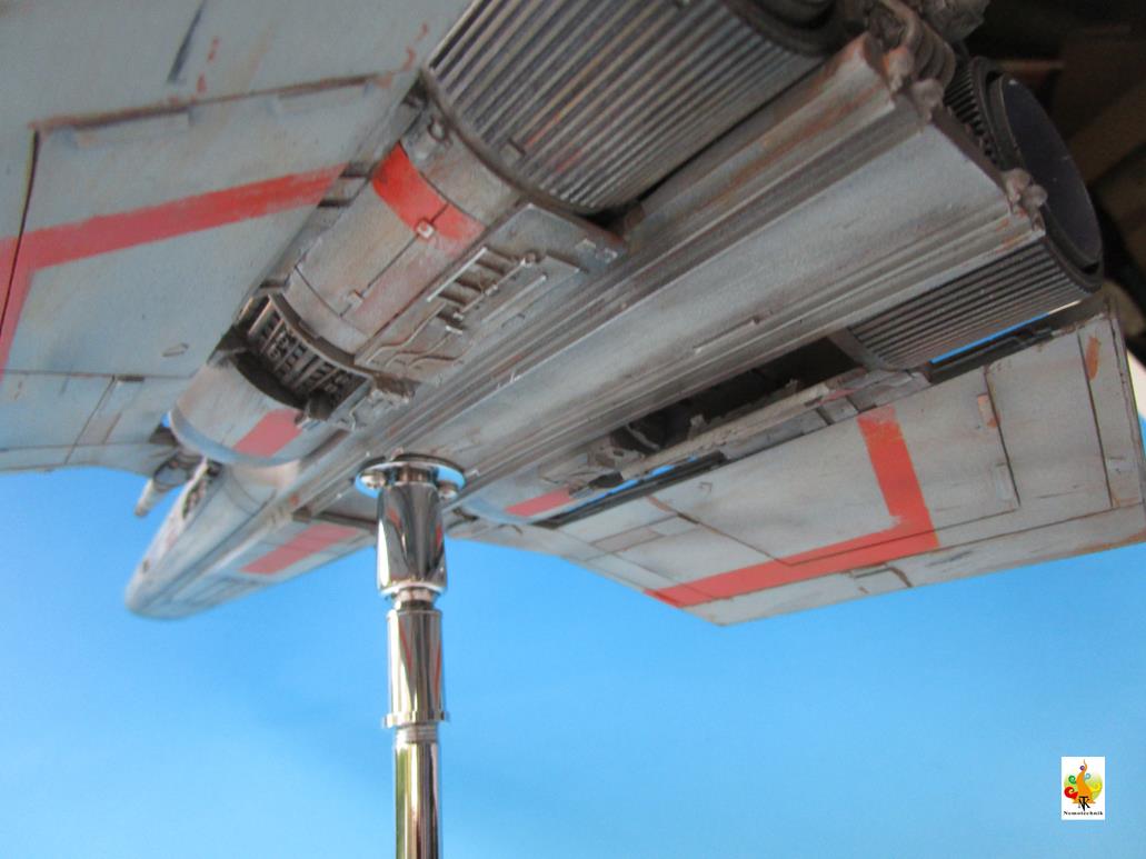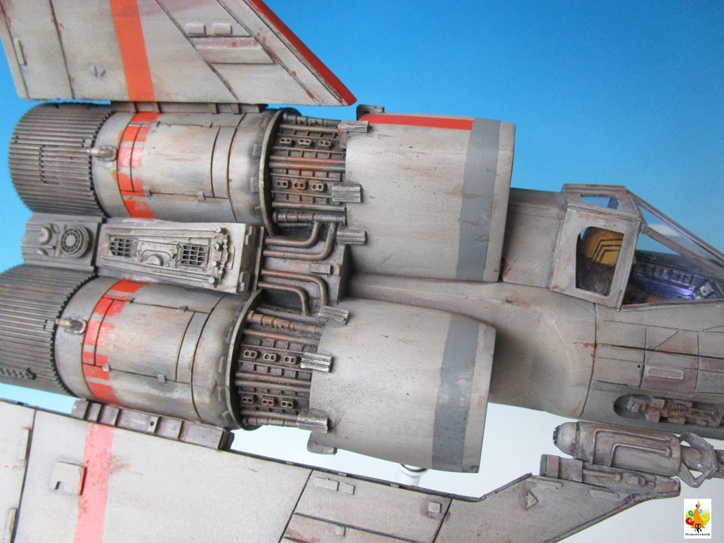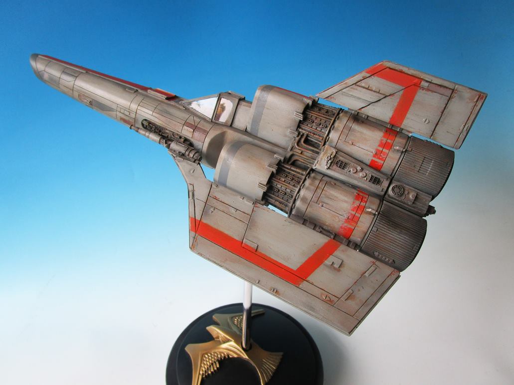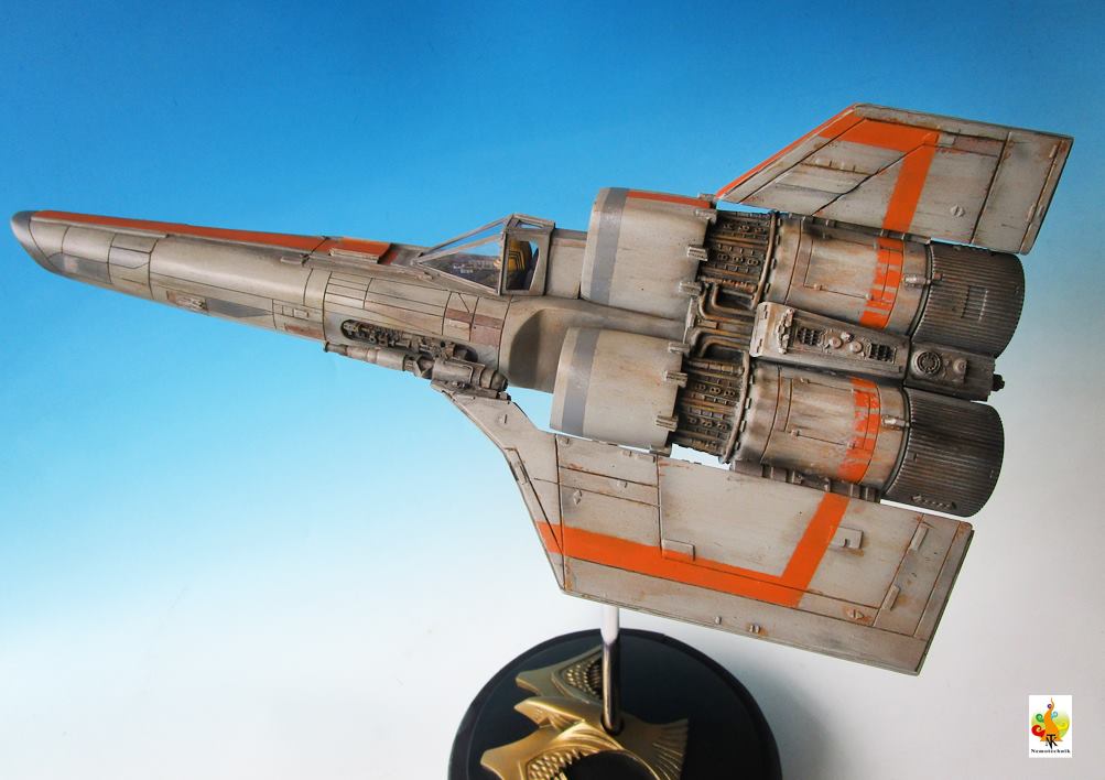 I’ve chosen to represent the Viper in the flight mode, with lights (LED’s) in the cockpit and the engine bells. The wires pass through the rod (with swinging head) to the base that hides the battery. It is a not so easy kit to assemble but the molding, especially the engine housing, is nice.