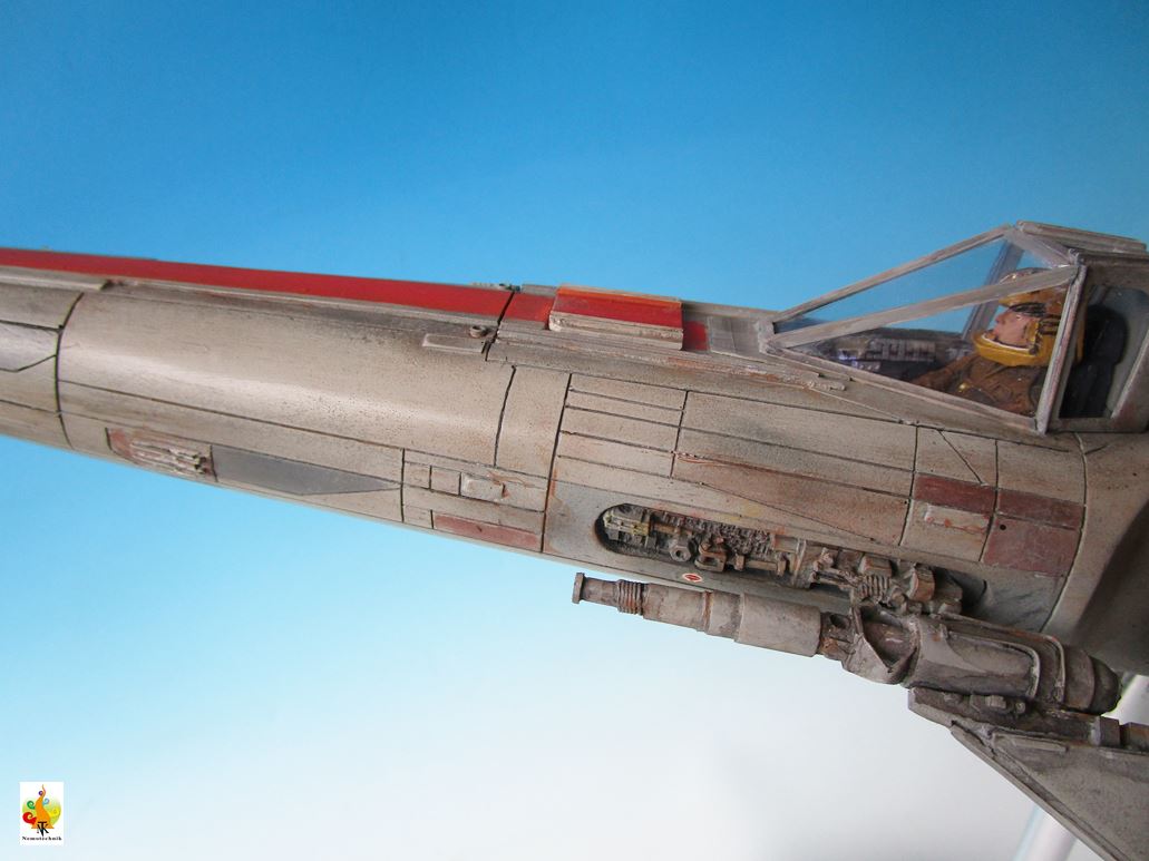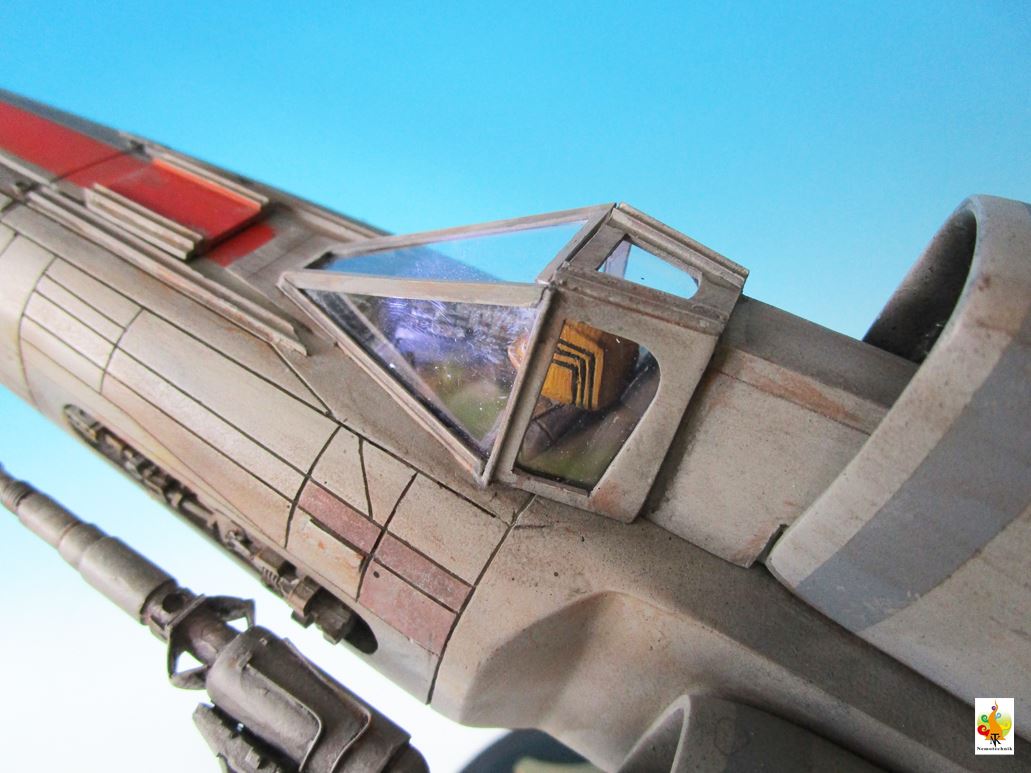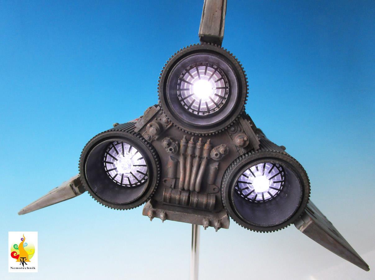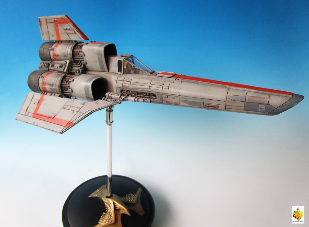 I’ve chosen to represent the Viper in the flight mode, with lights (LED’s) in the cockpit and the engine bells. The wires pass through the rod (with swinging head) to the base that hides the battery. It is a not so easy kit to assemble but the molding, especially the engine housing, is nice.