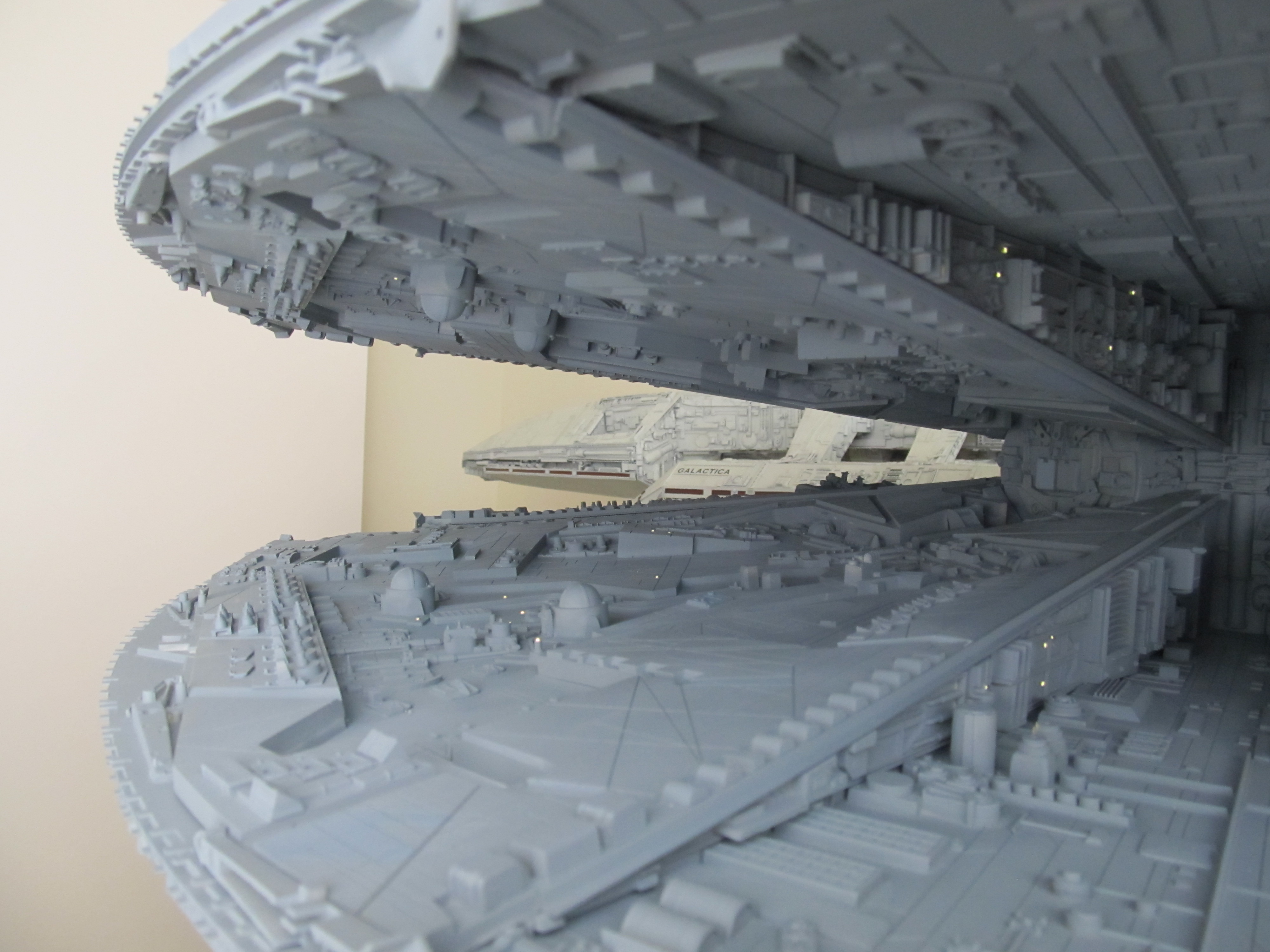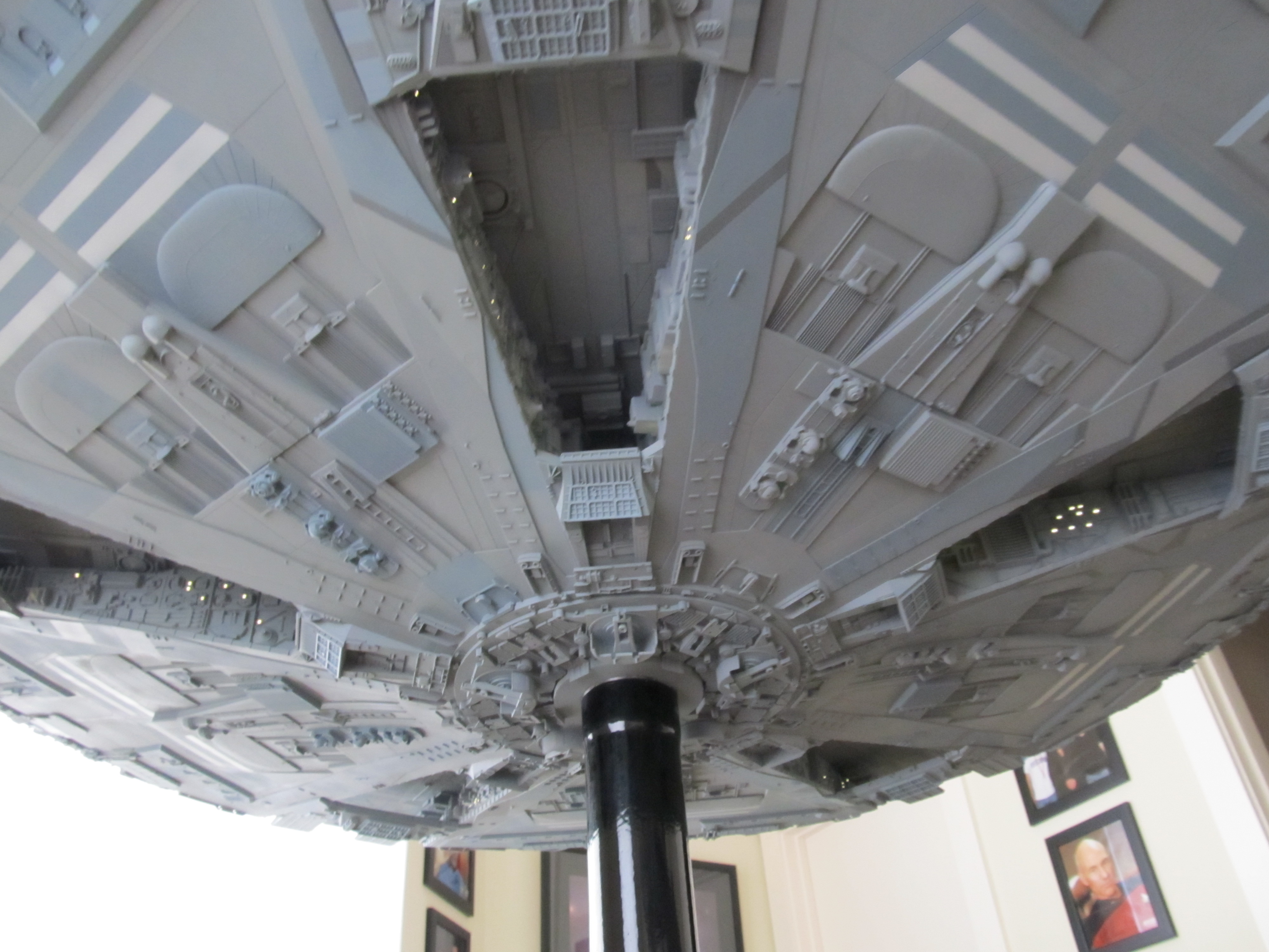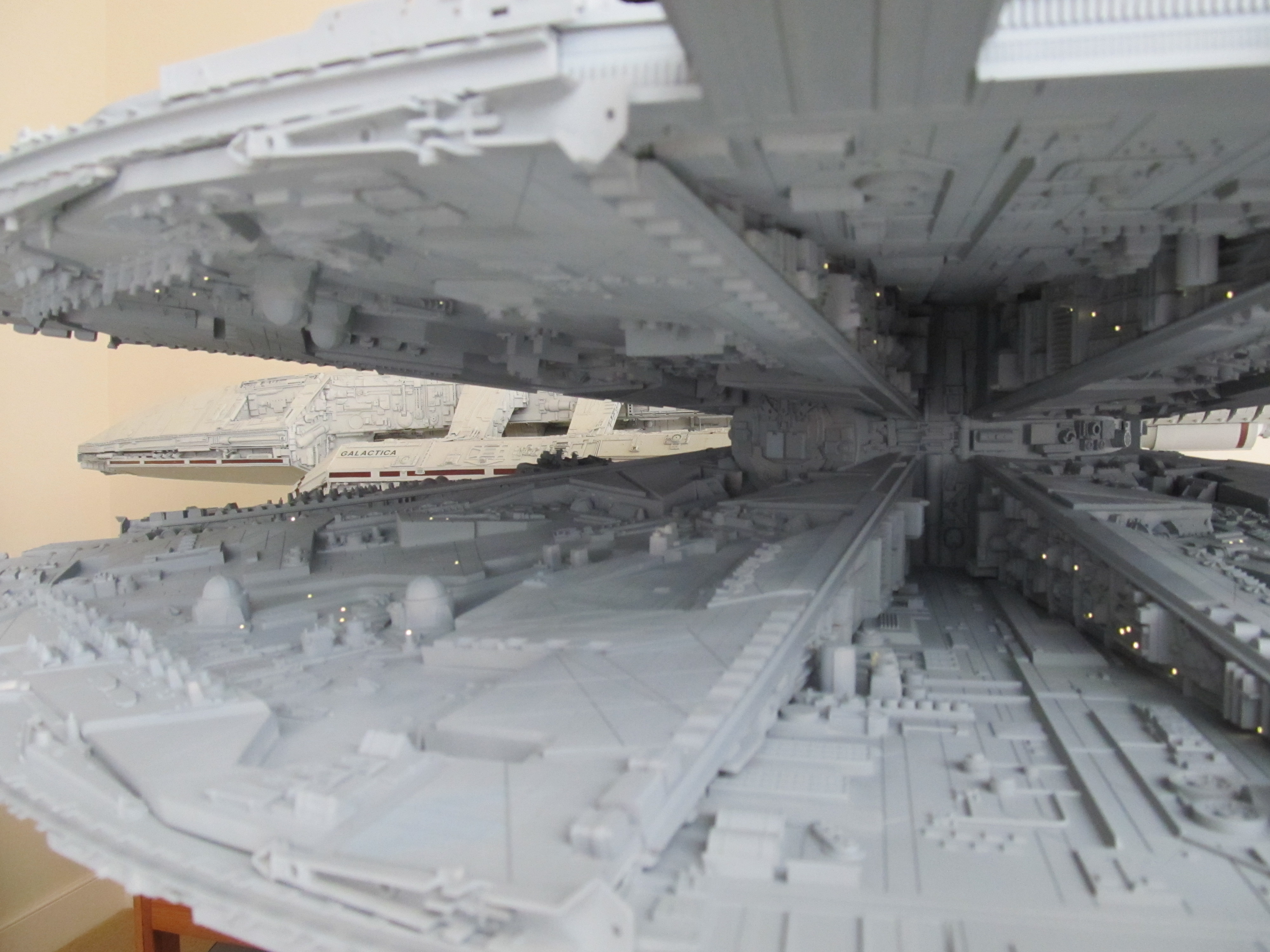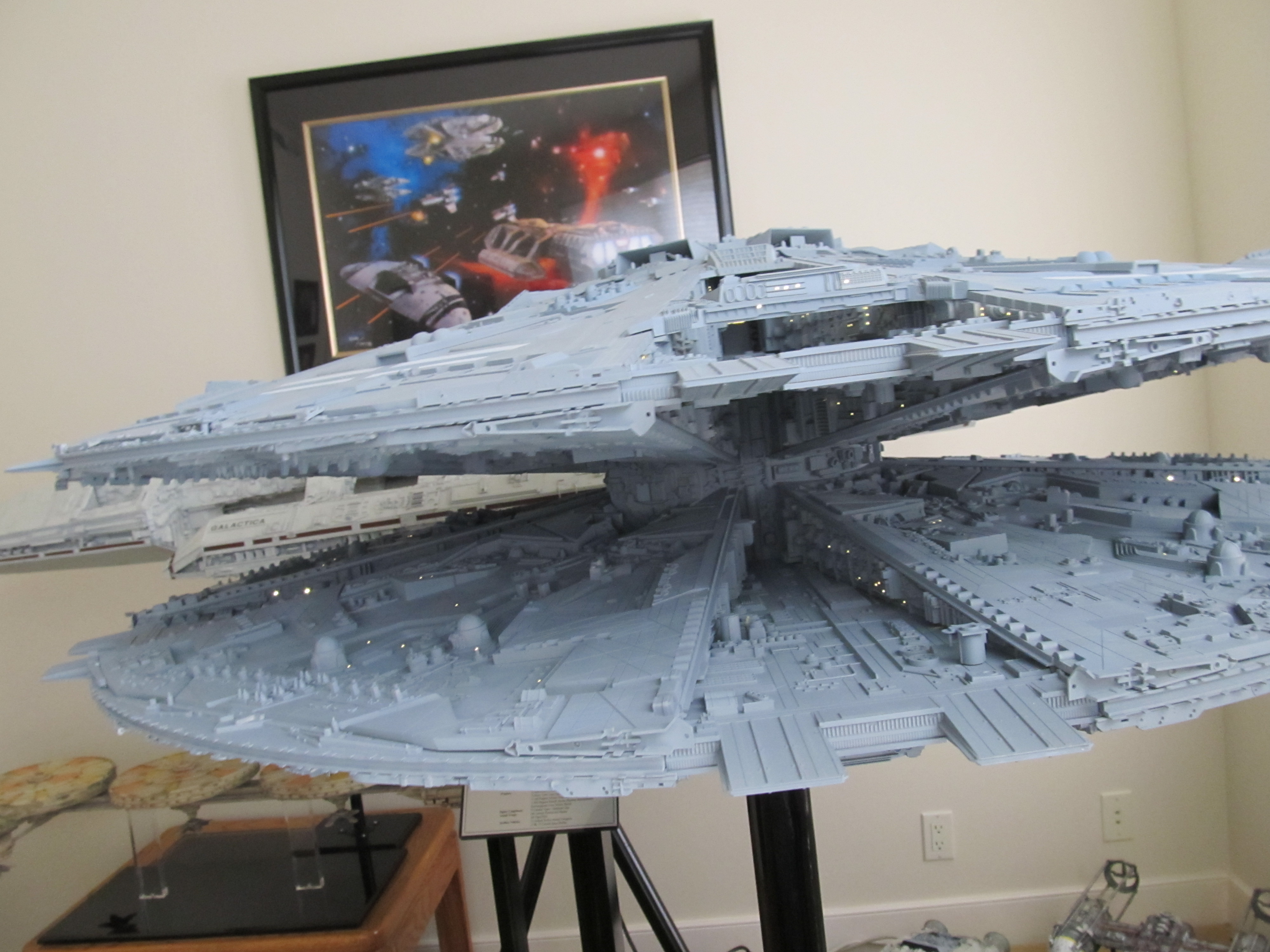 Collector and friend Michael Plante emailed me the photos of his recently delivered Cylon Base Ship replica from the 1978 film Battlestar Galactica! Canadian artist Sean Corsini (of Northern Shipyards) crafted this piece from top to bottom, even the middle interior has a squadron of Cylon Raiders inside that can be seen if one looks closely enough. Michael is thrilled with this piece as I know I too would be if it were in the collection here. Beautiful!!