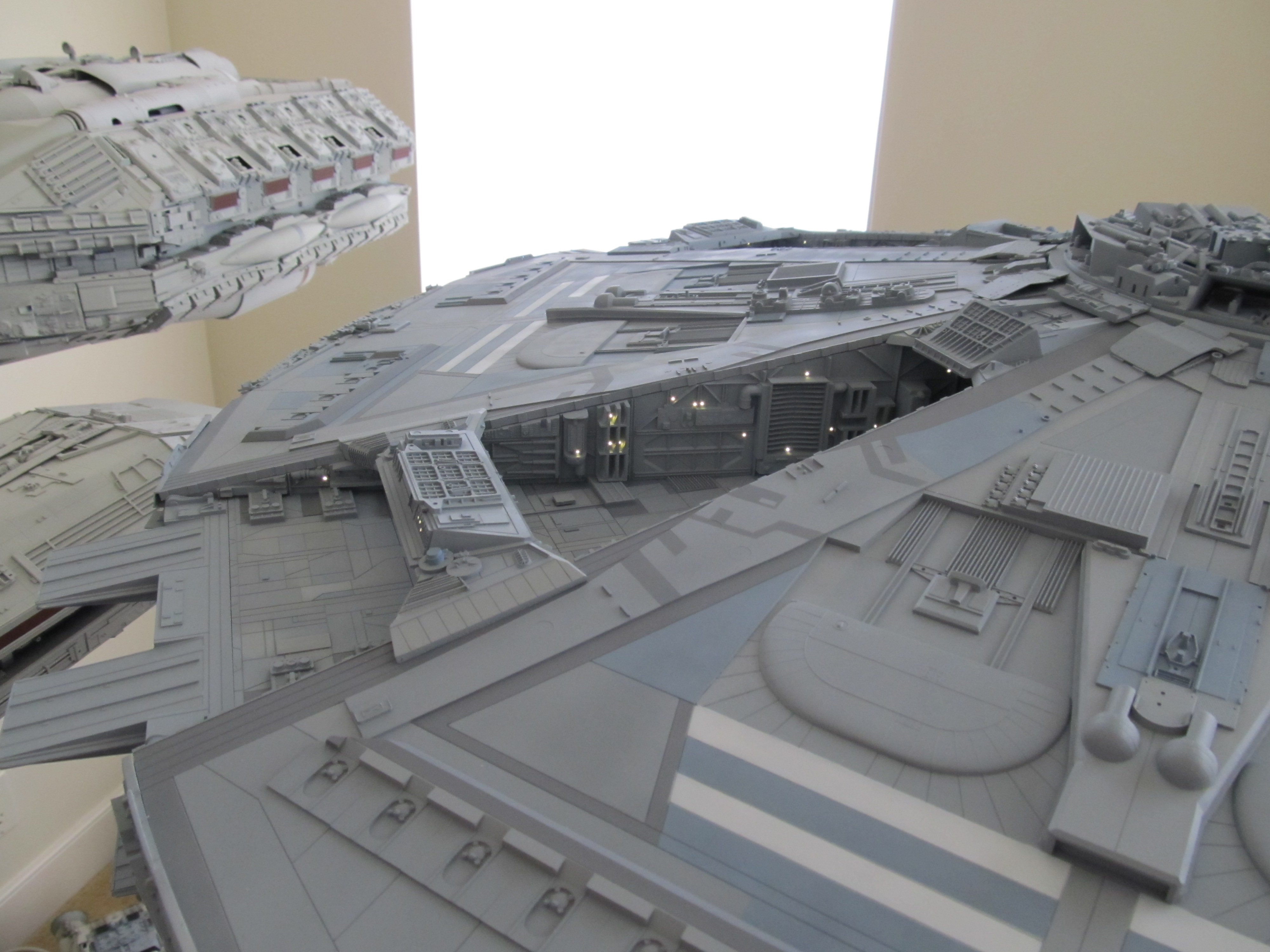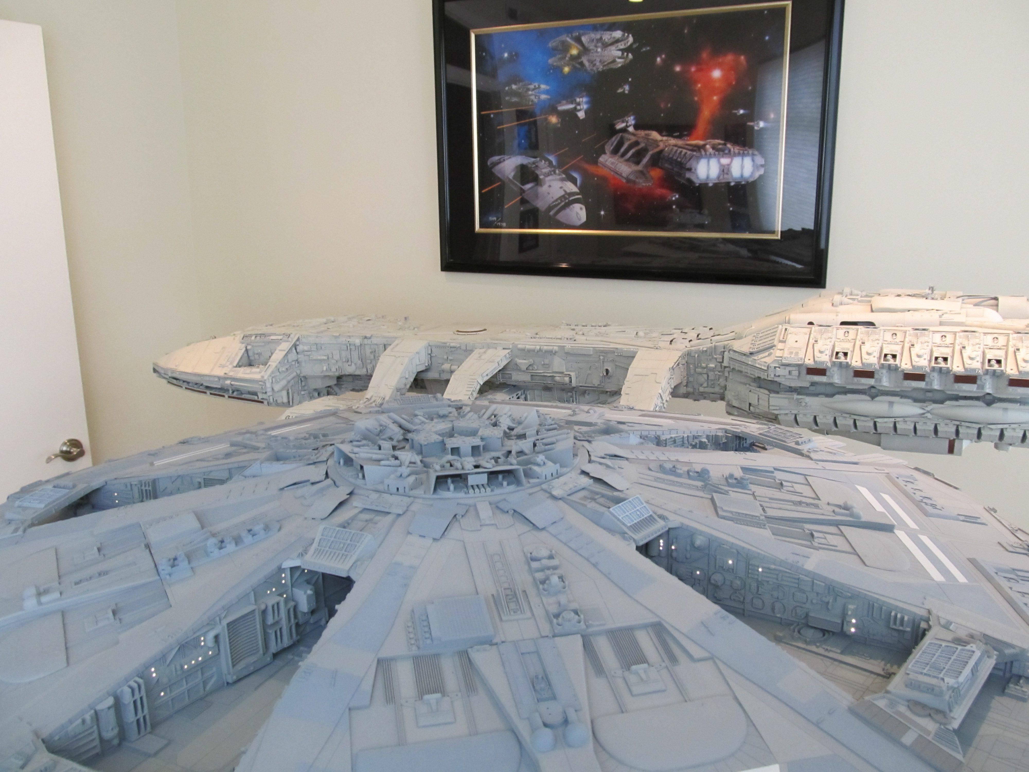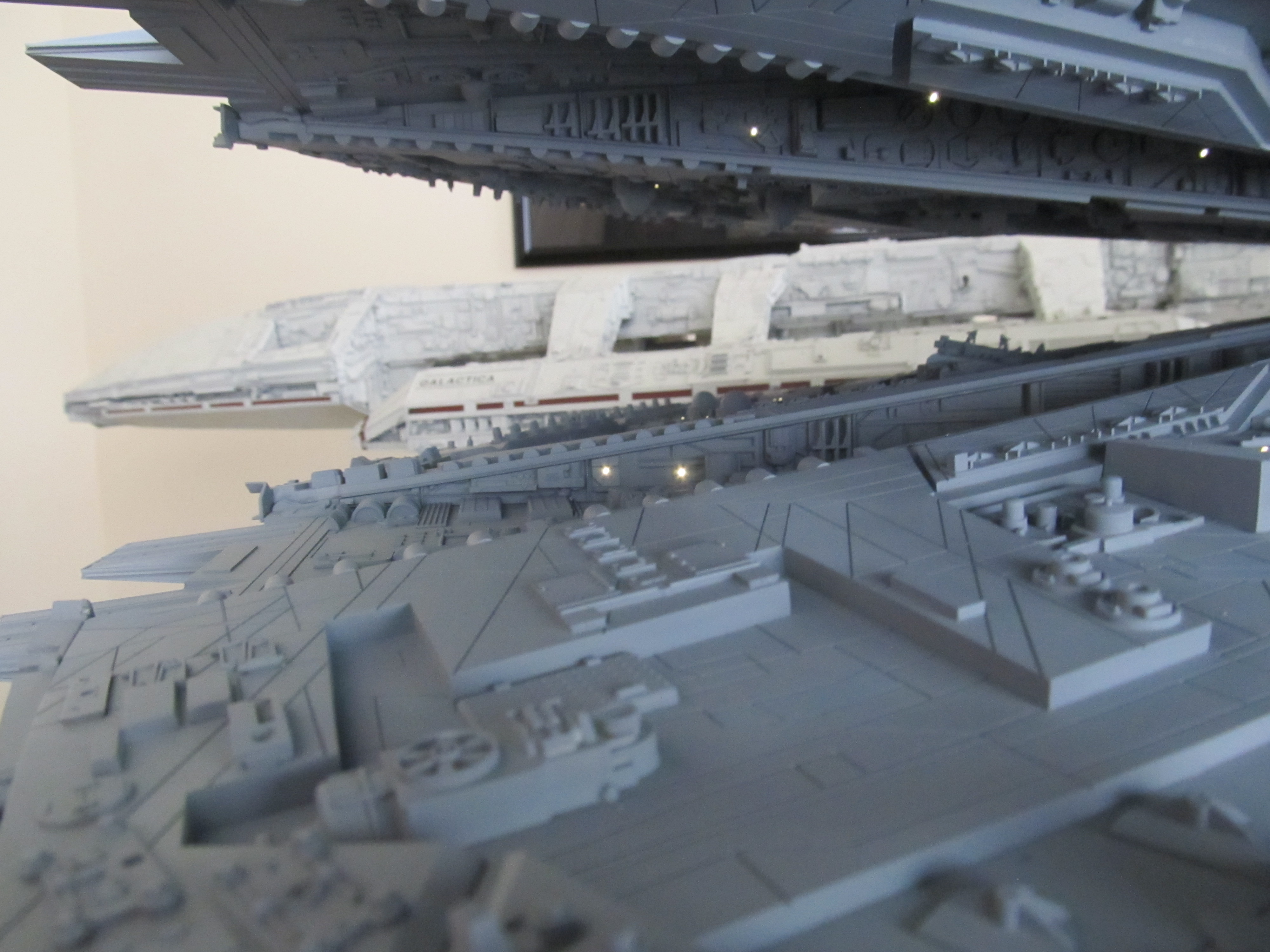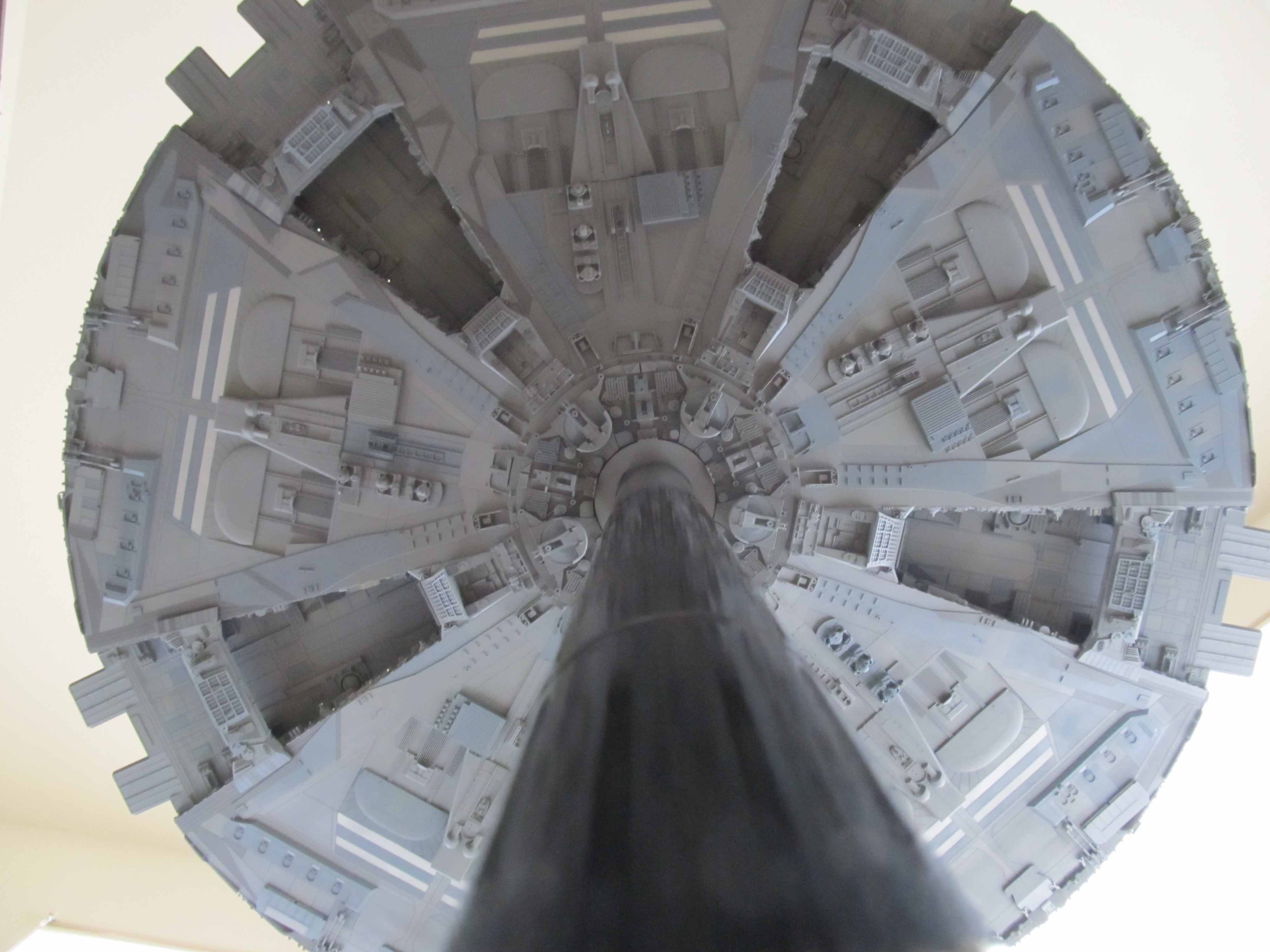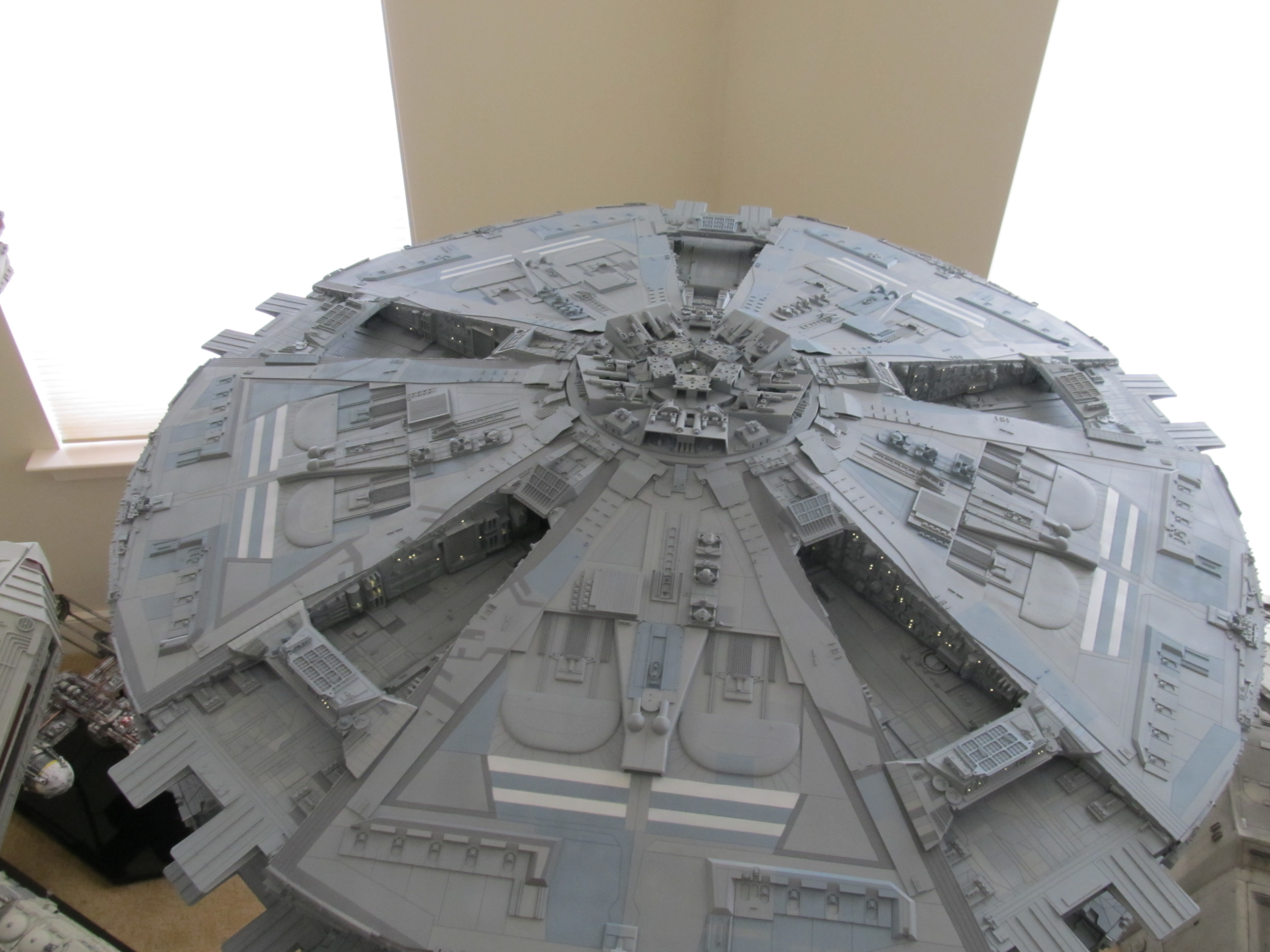 Collector and friend Michael Plante emailed me the photos of his recently delivered Cylon Base Ship replica from the 1978 film Battlestar Galactica! Canadian artist Sean Corsini (of Northern Shipyards) crafted this piece from top to bottom, even the middle interior has a squadron of Cylon Raiders inside that can be seen if one looks closely enough. Michael is thrilled with this piece as I know I too would be if it were in the collection here. Beautiful!!
