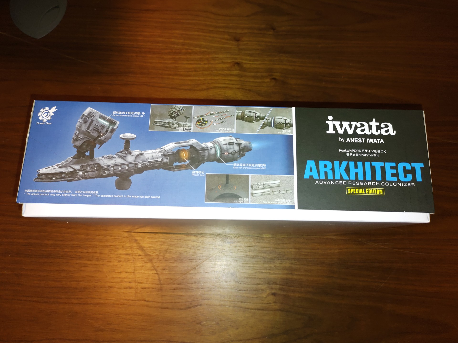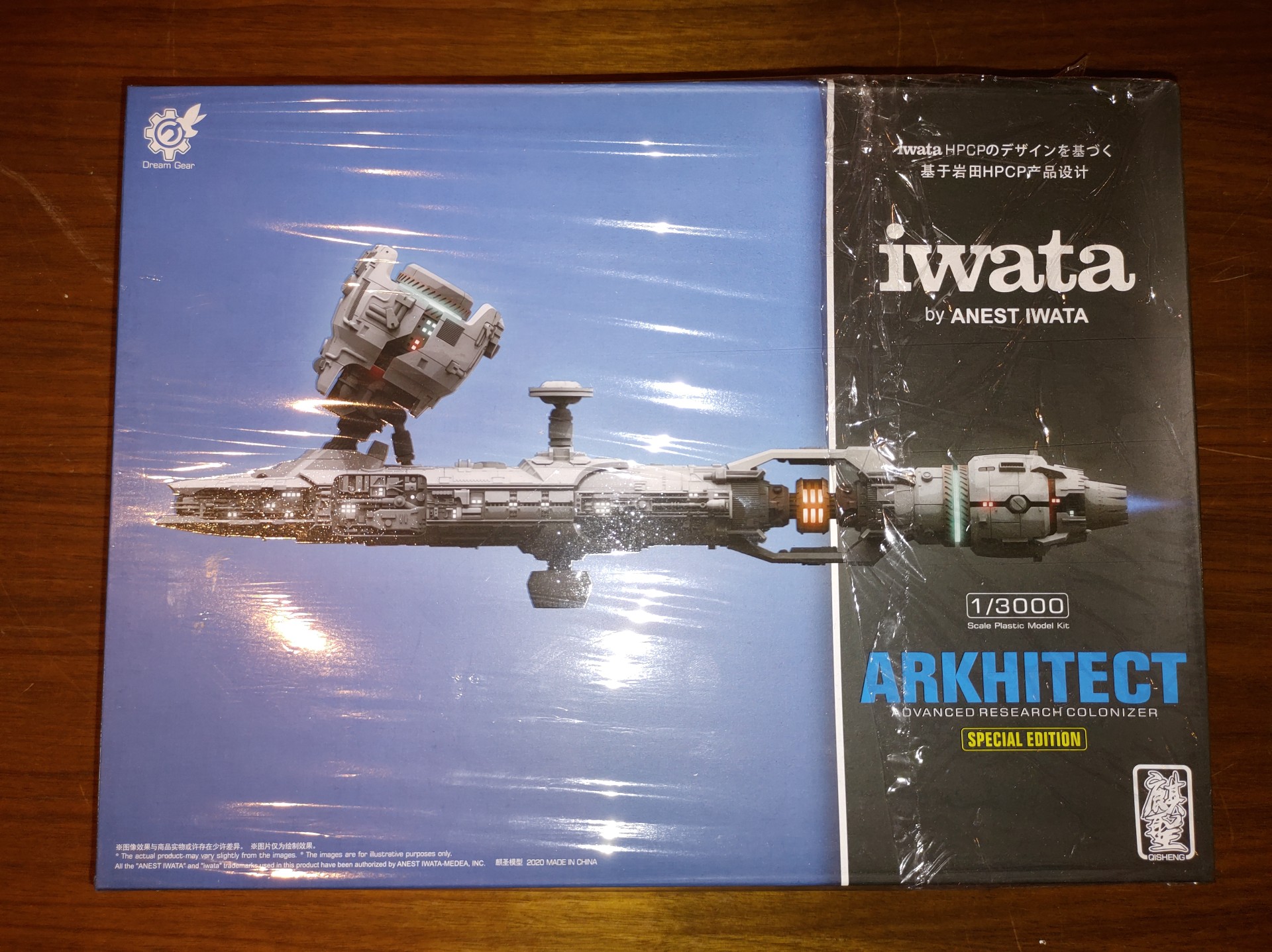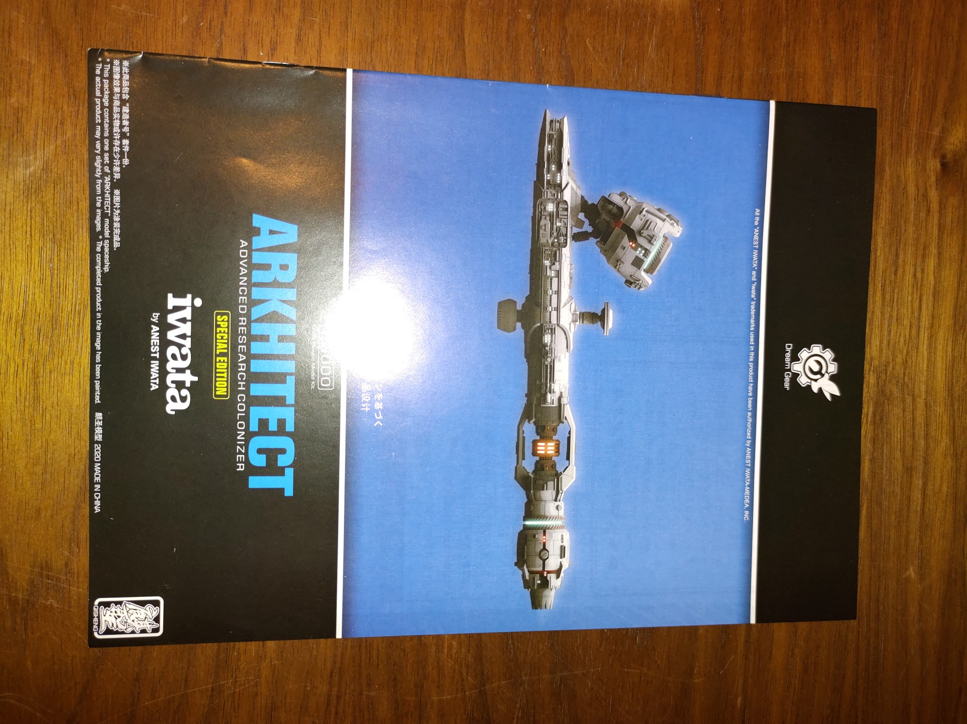 The Arkhitect Advanced Research Colonizer Spaceship comes in an impressive looking box which highlights the partnership with Iwata to create this unique Airbrush inspired scifi craft.