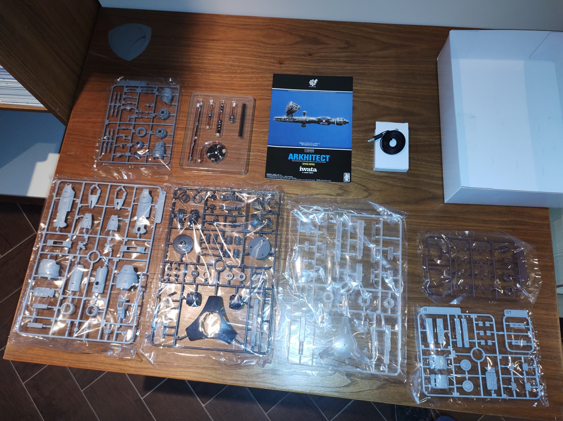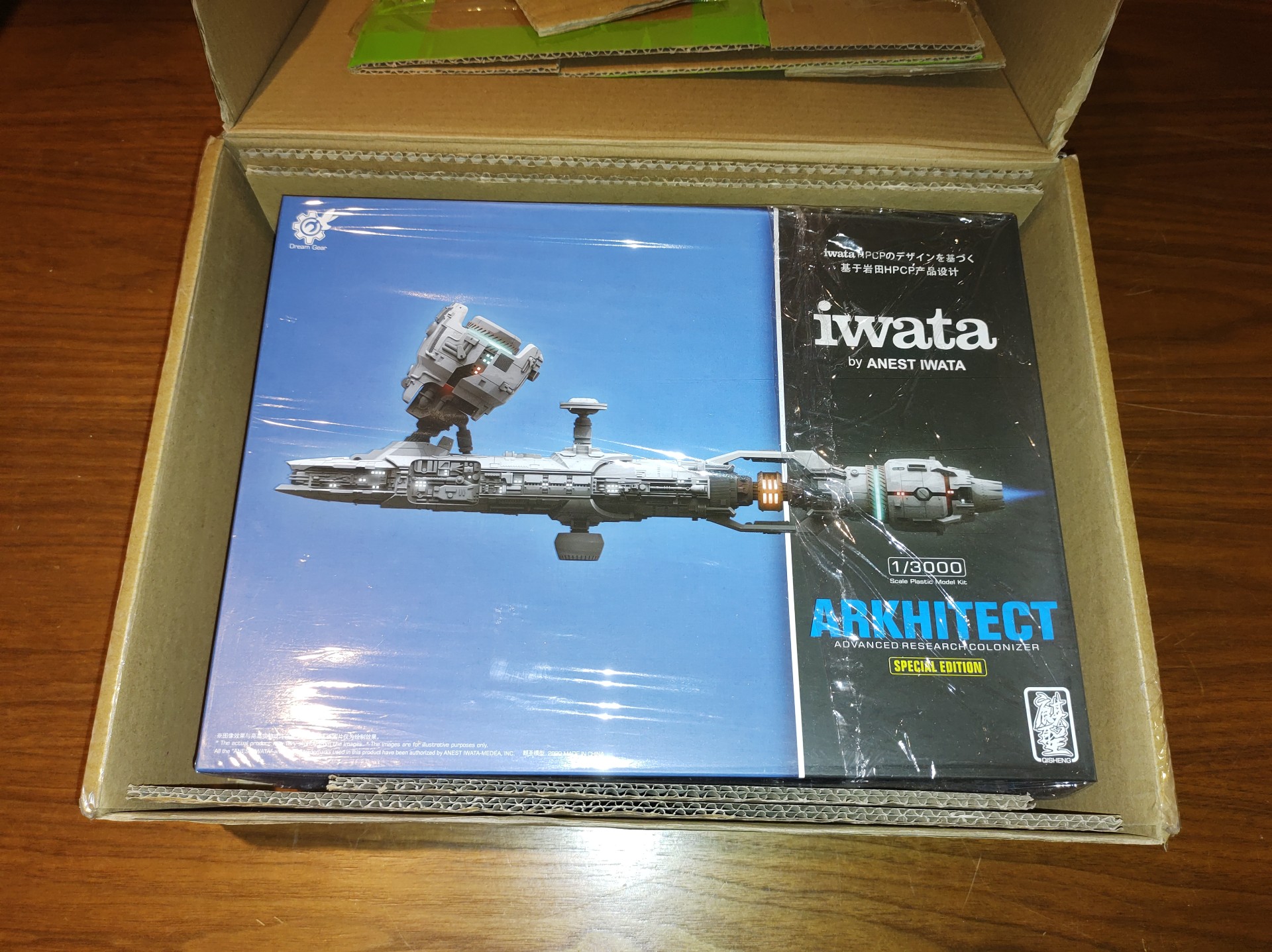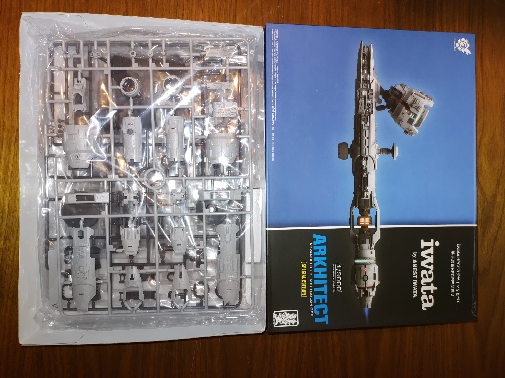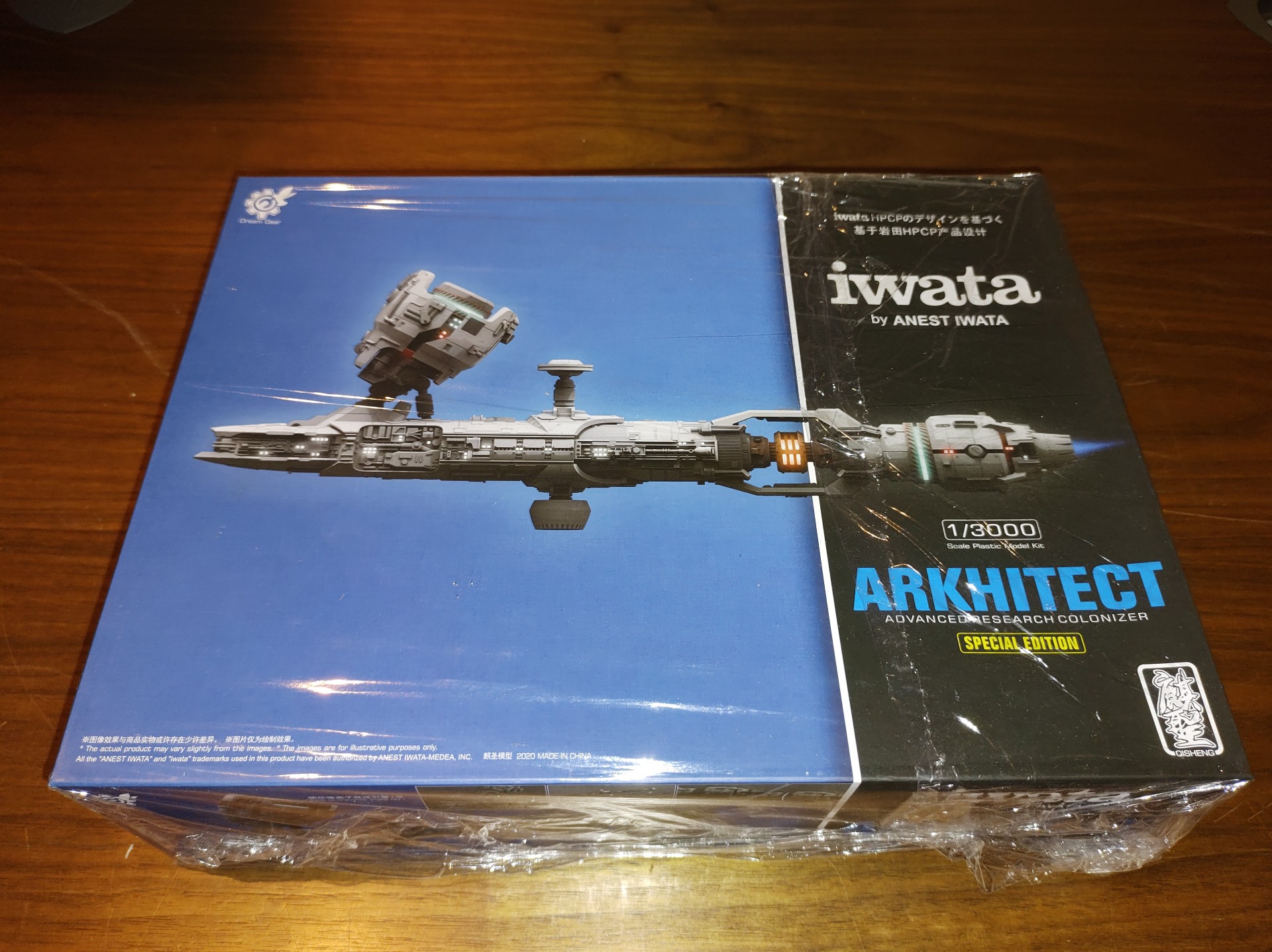 The Arkhitect Advanced Research Colonizer Spaceship comes in an impressive looking box which highlights the partnership with Iwata to create this unique Airbrush inspired scifi craft.