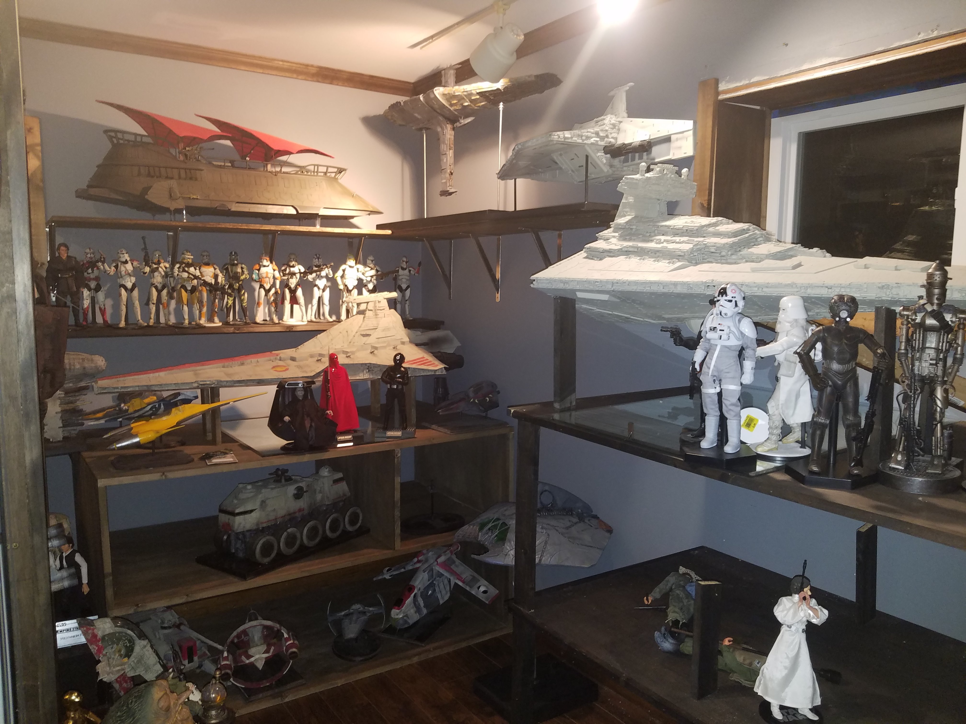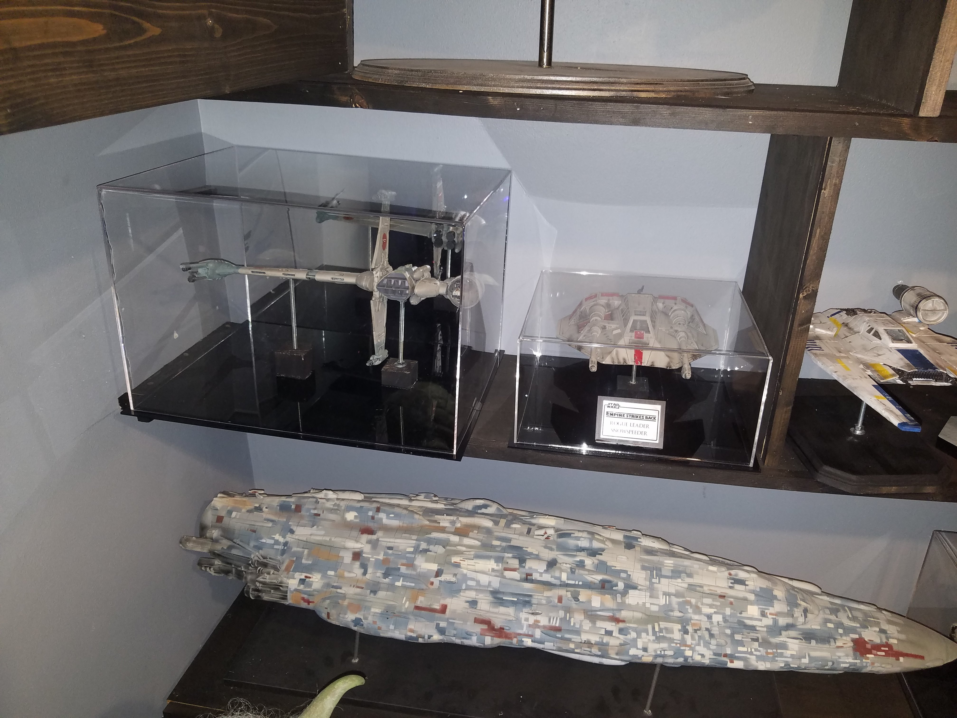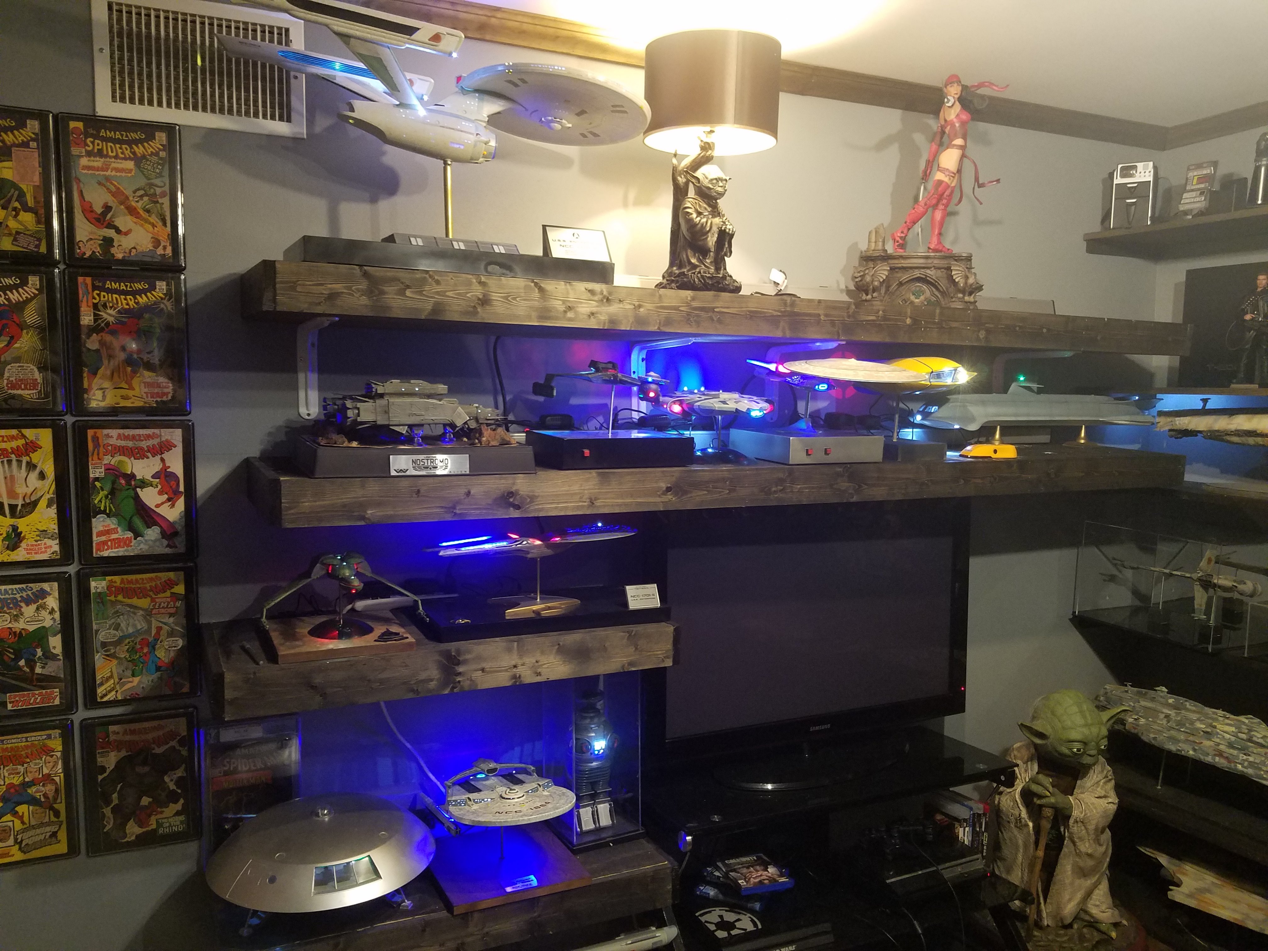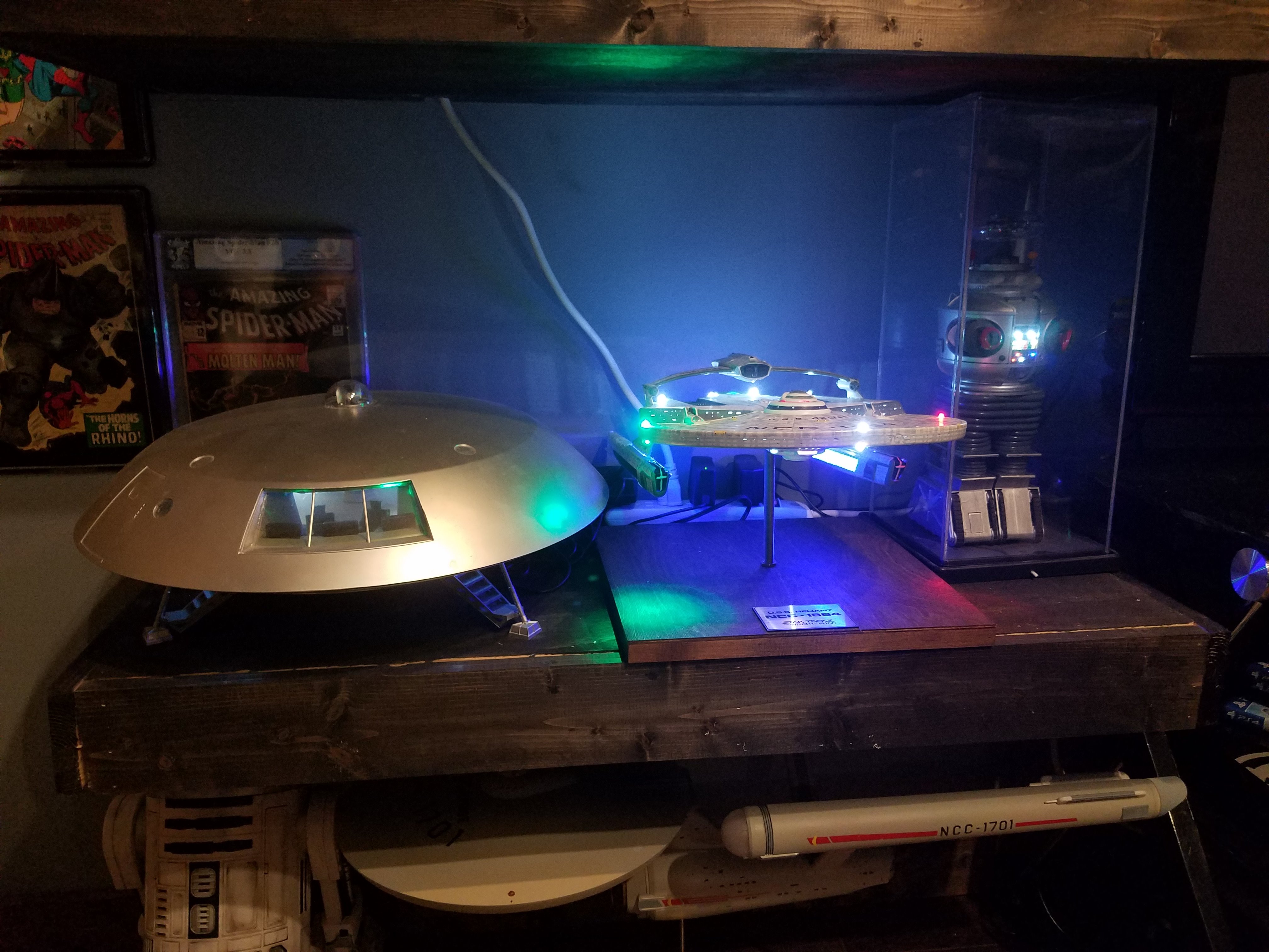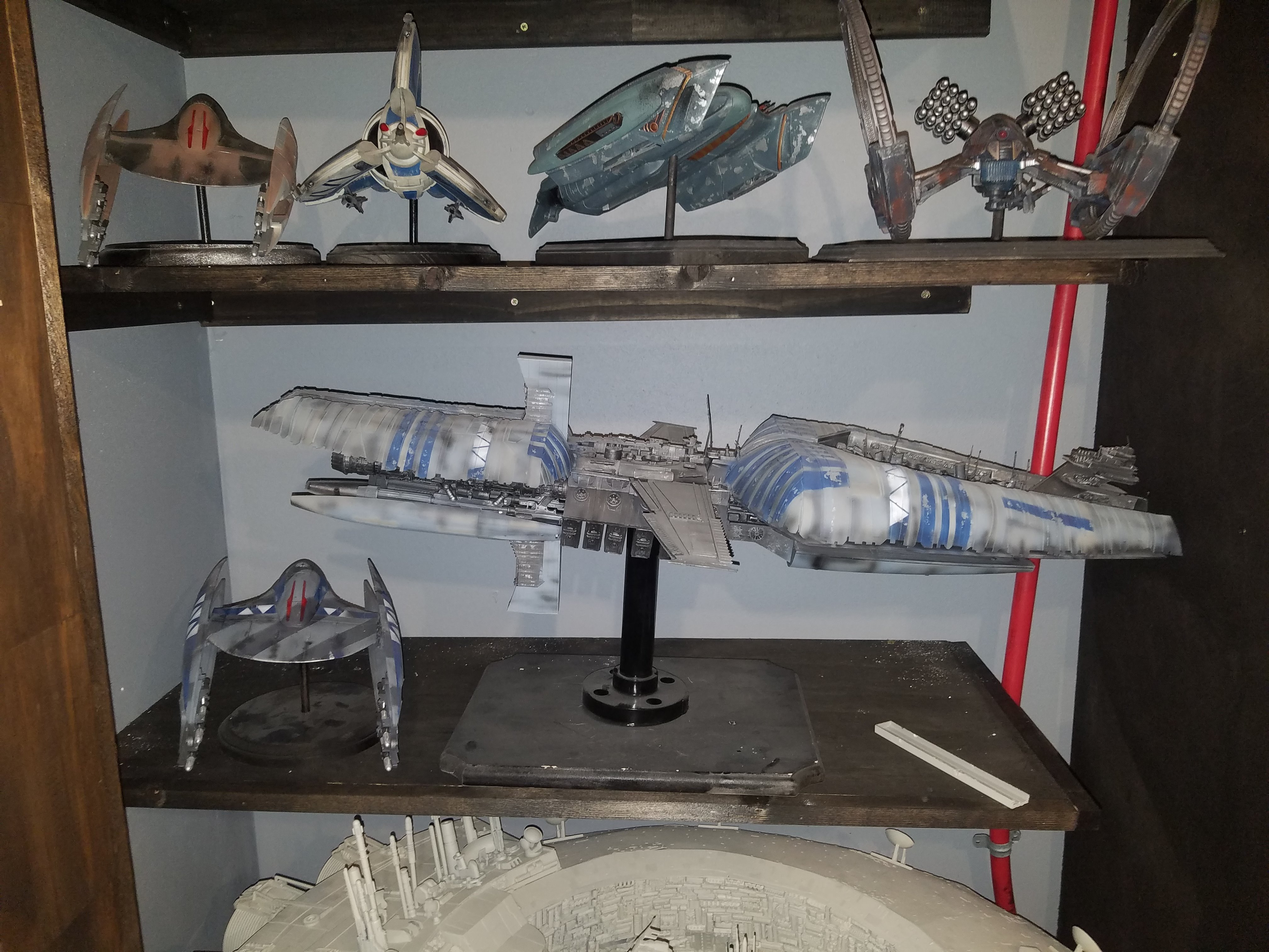 I have been a long time viewer of Modeler Magic and thought I would submit some of the things that I have created over my modeling career. Here is a general look at my current collection. Most of the larger ships are all built from scratch. The lit builds are from kits, and I have a lot of Hasbro toy mods in there as well. Also, I have a few Randy Cooper models and other garage kits. I wanted to scratch build pieces that are unique and not found in many other collections.
