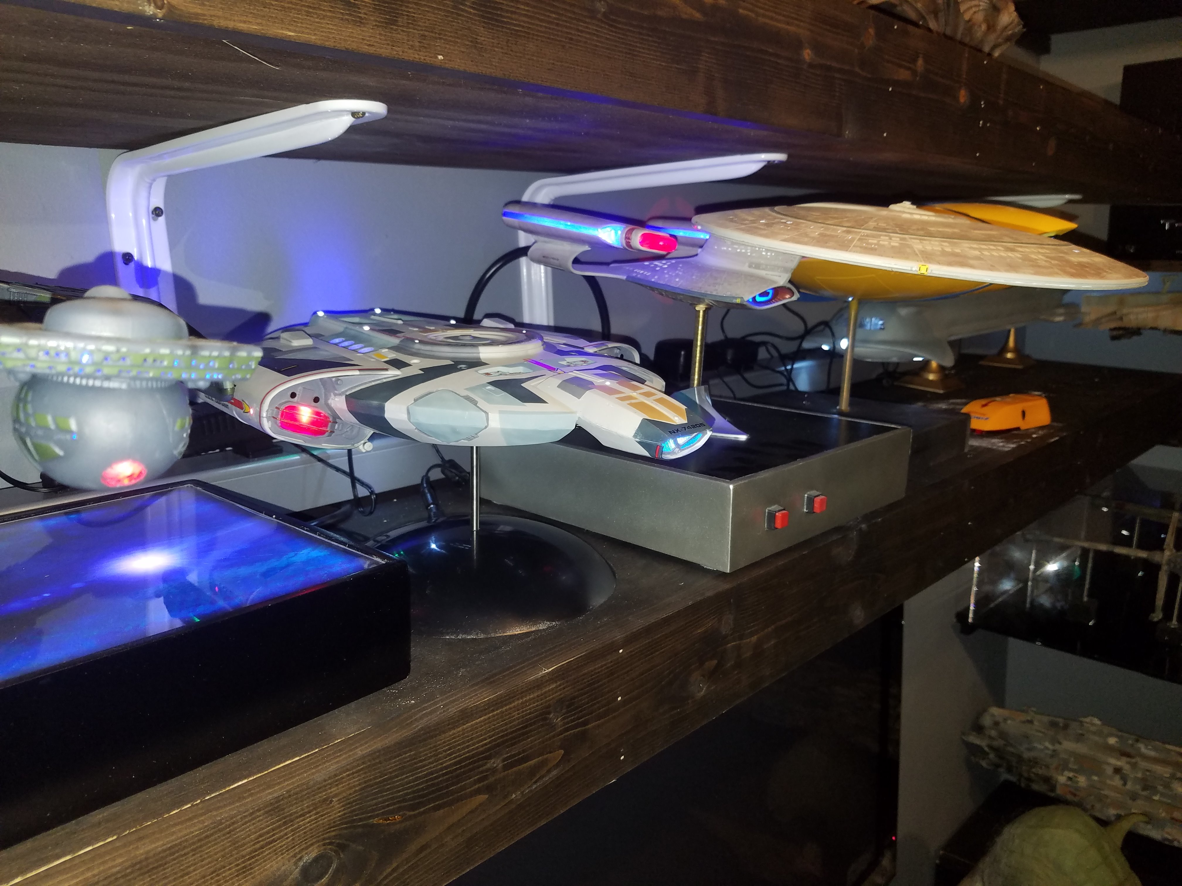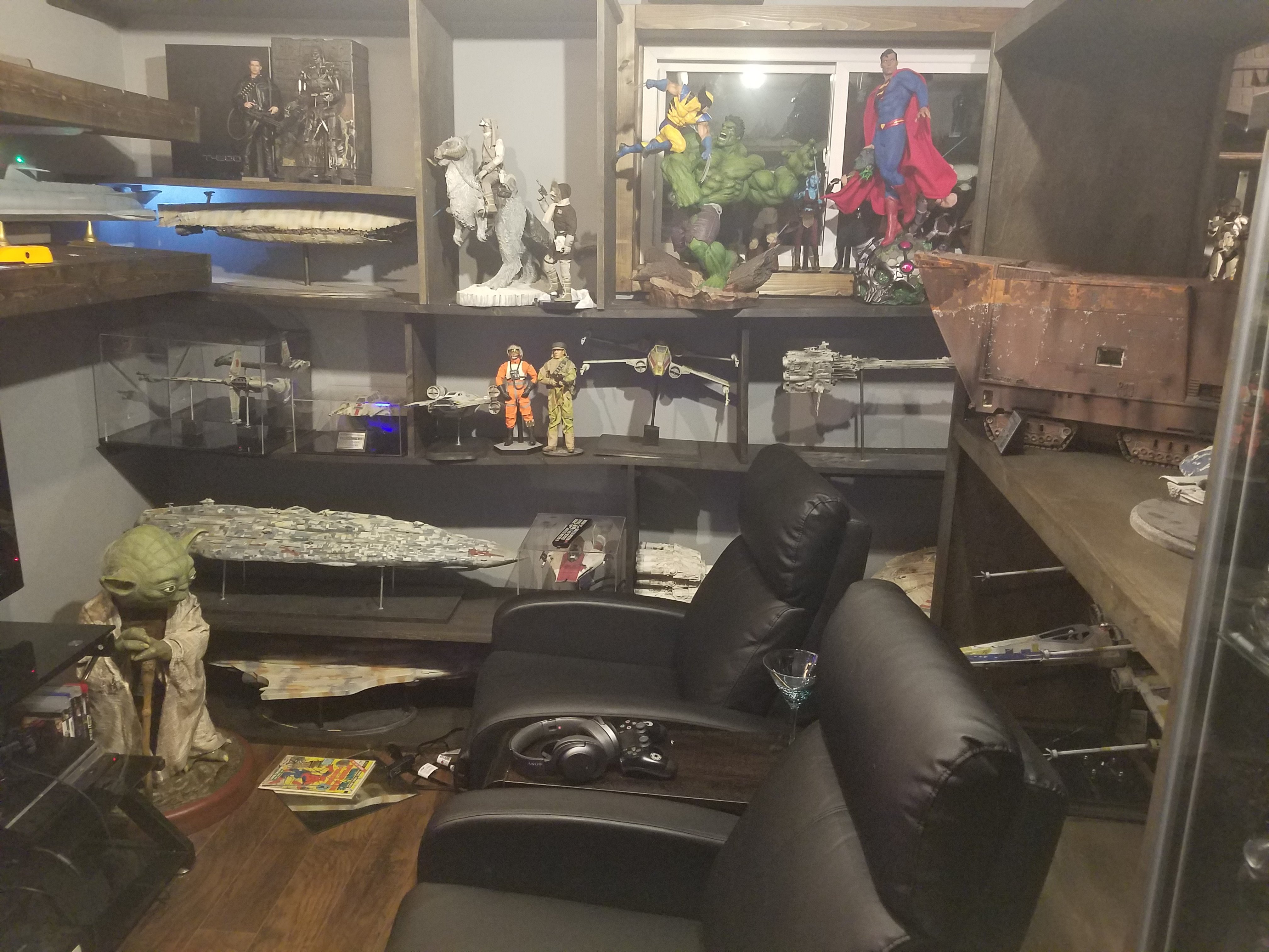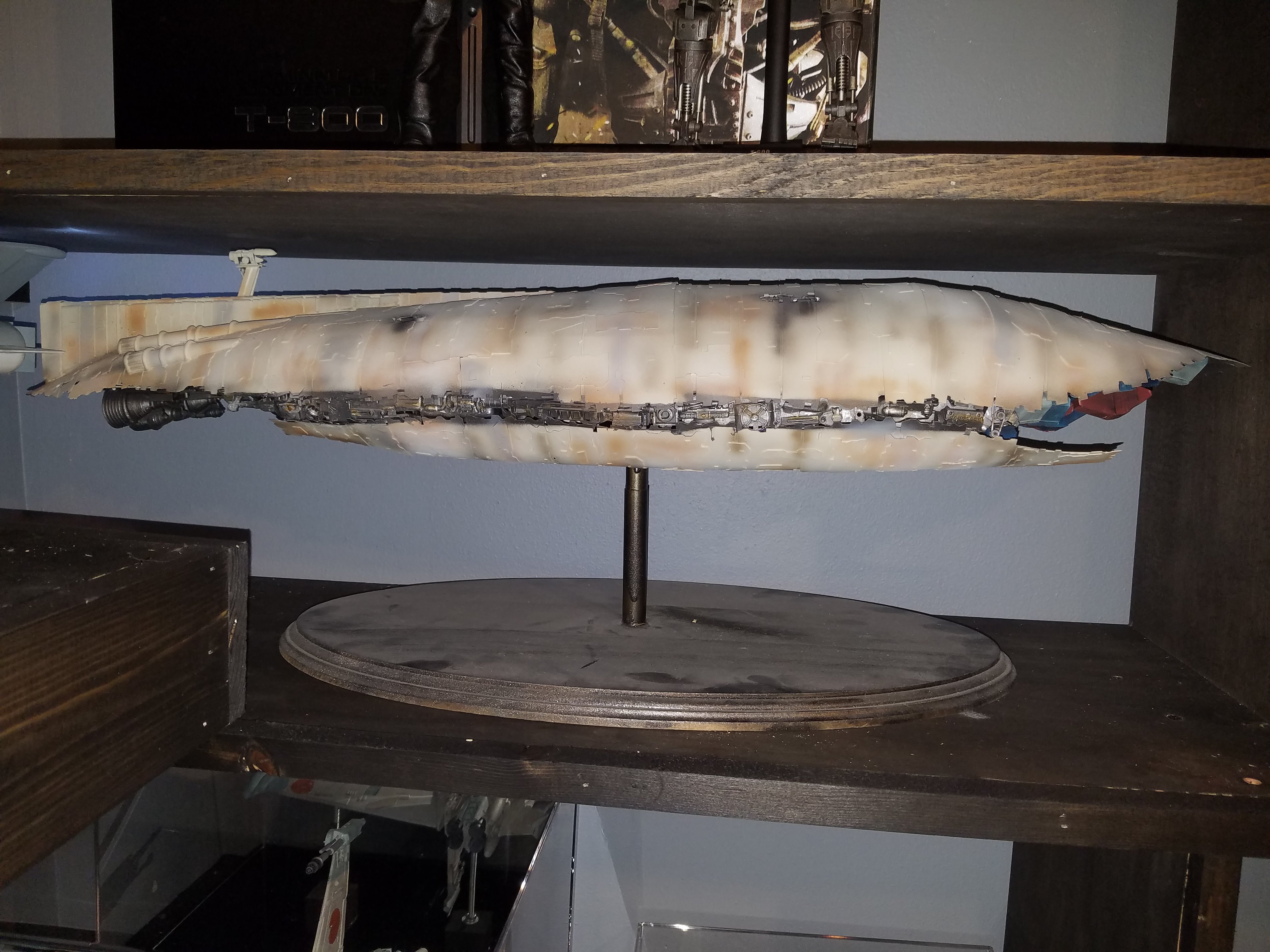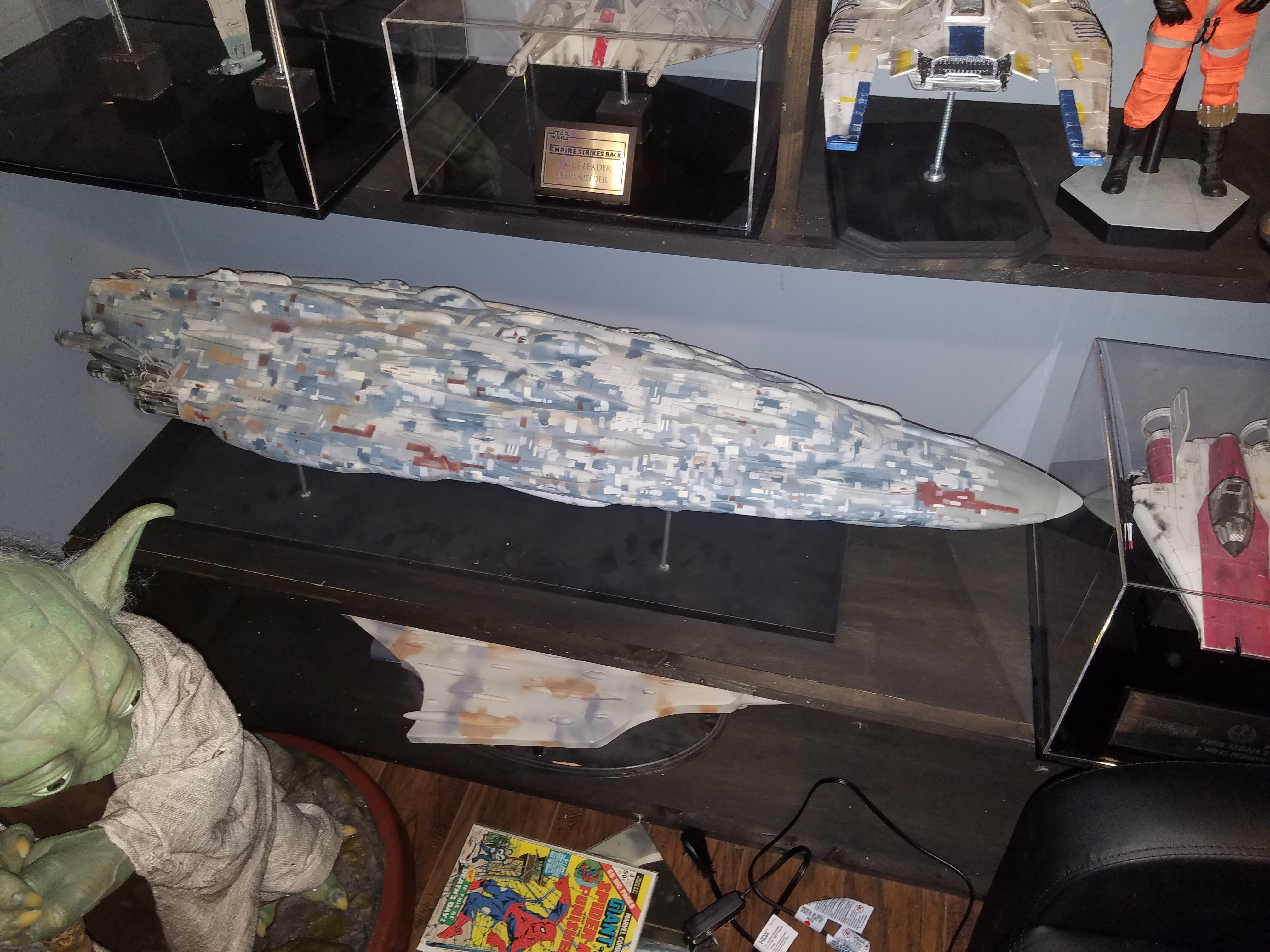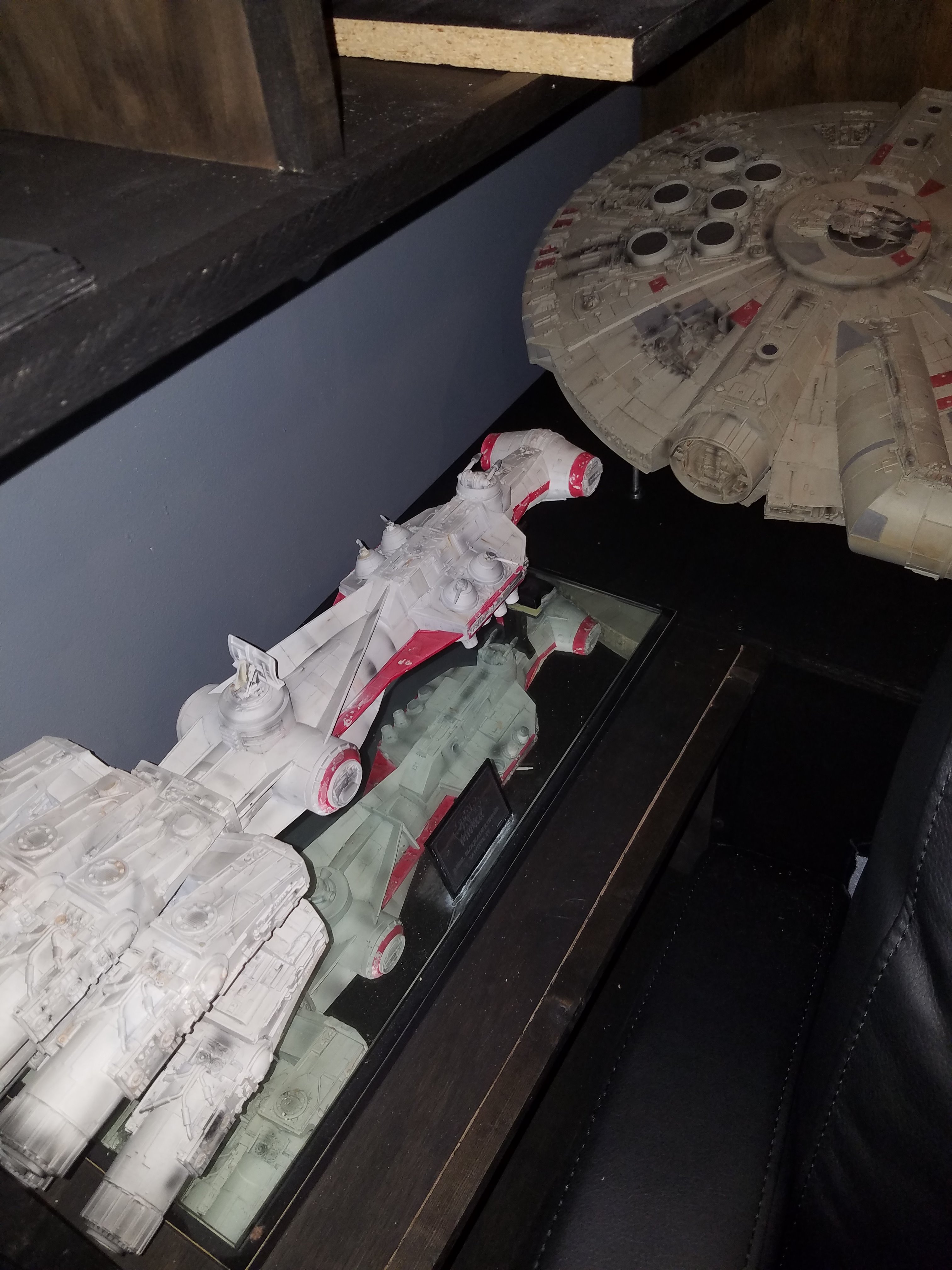I have been a long time viewer of Modeler Magic and thought I would submit some of the things that I have created over my modeling career. Here is a general look at my current collection. Most of the larger ships are all built from scratch. The lit builds are from kits, and I have a lot of Hasbro toy mods in there as well. Also, I have a few Randy Cooper models and other garage kits. I wanted to scratch build pieces that are unique and not found in many other collections.