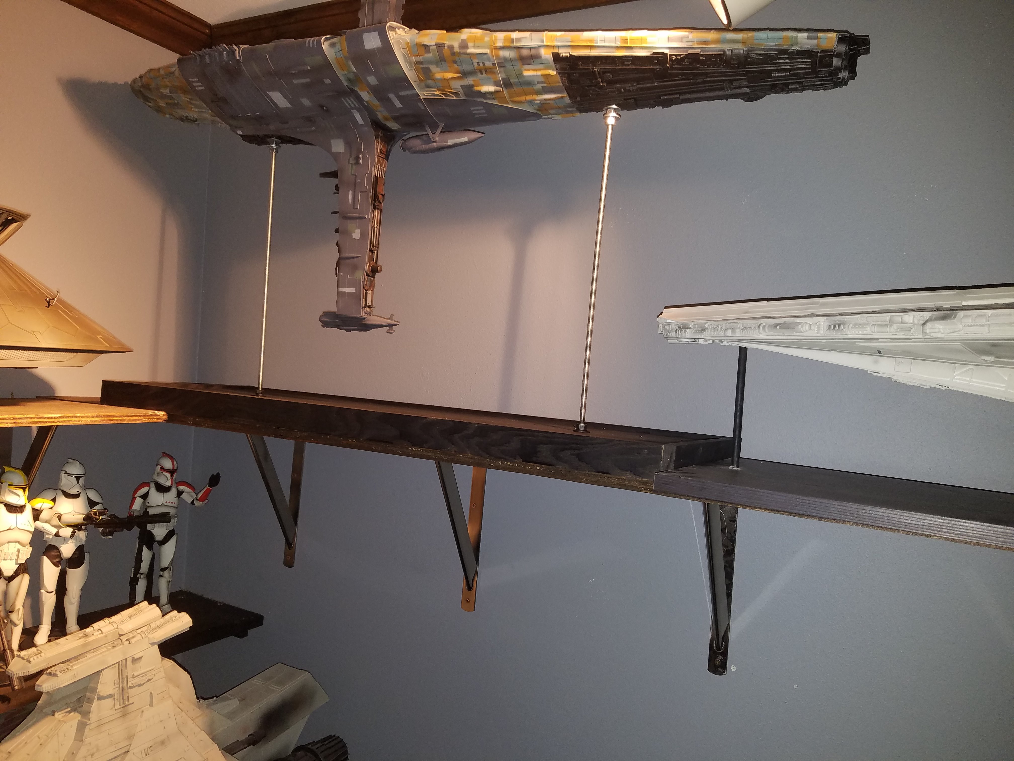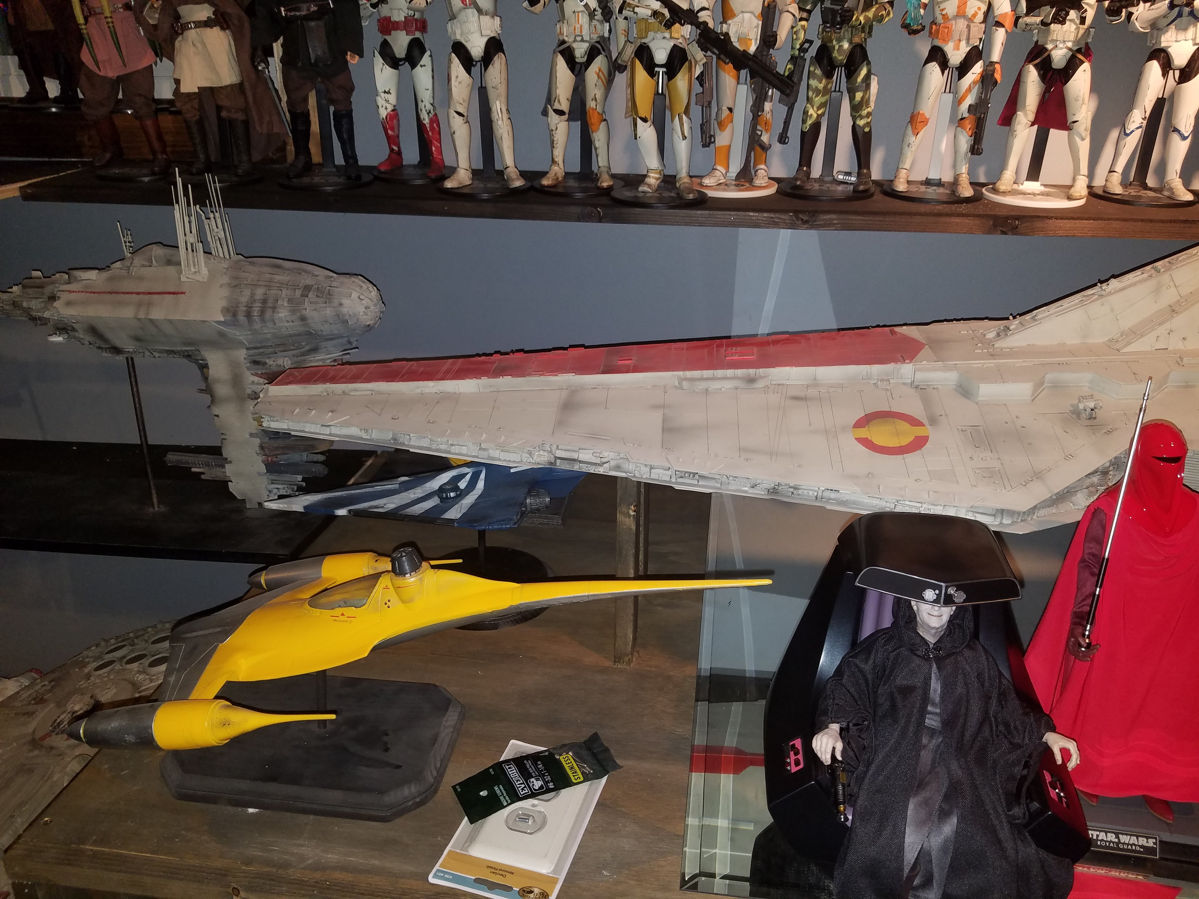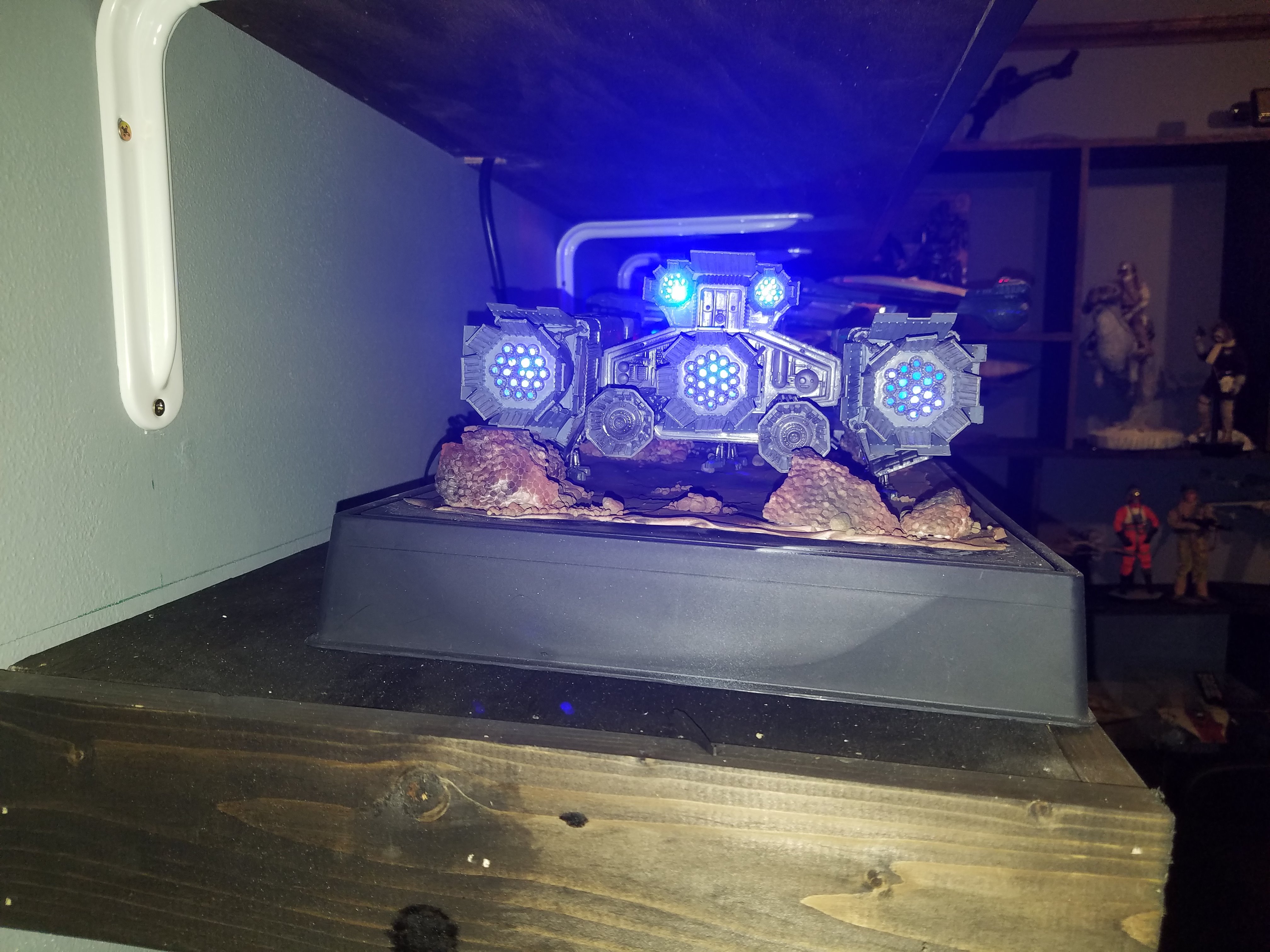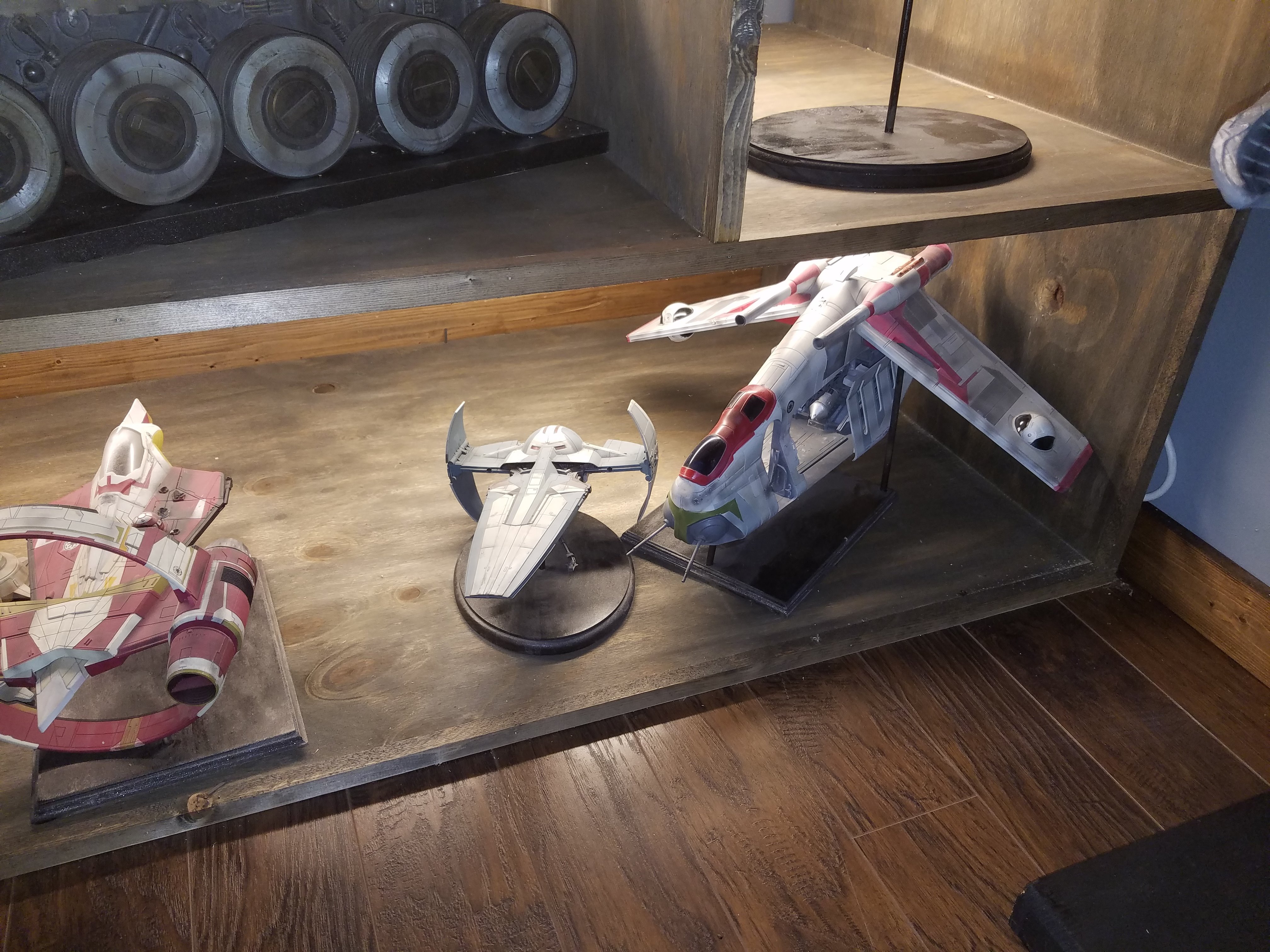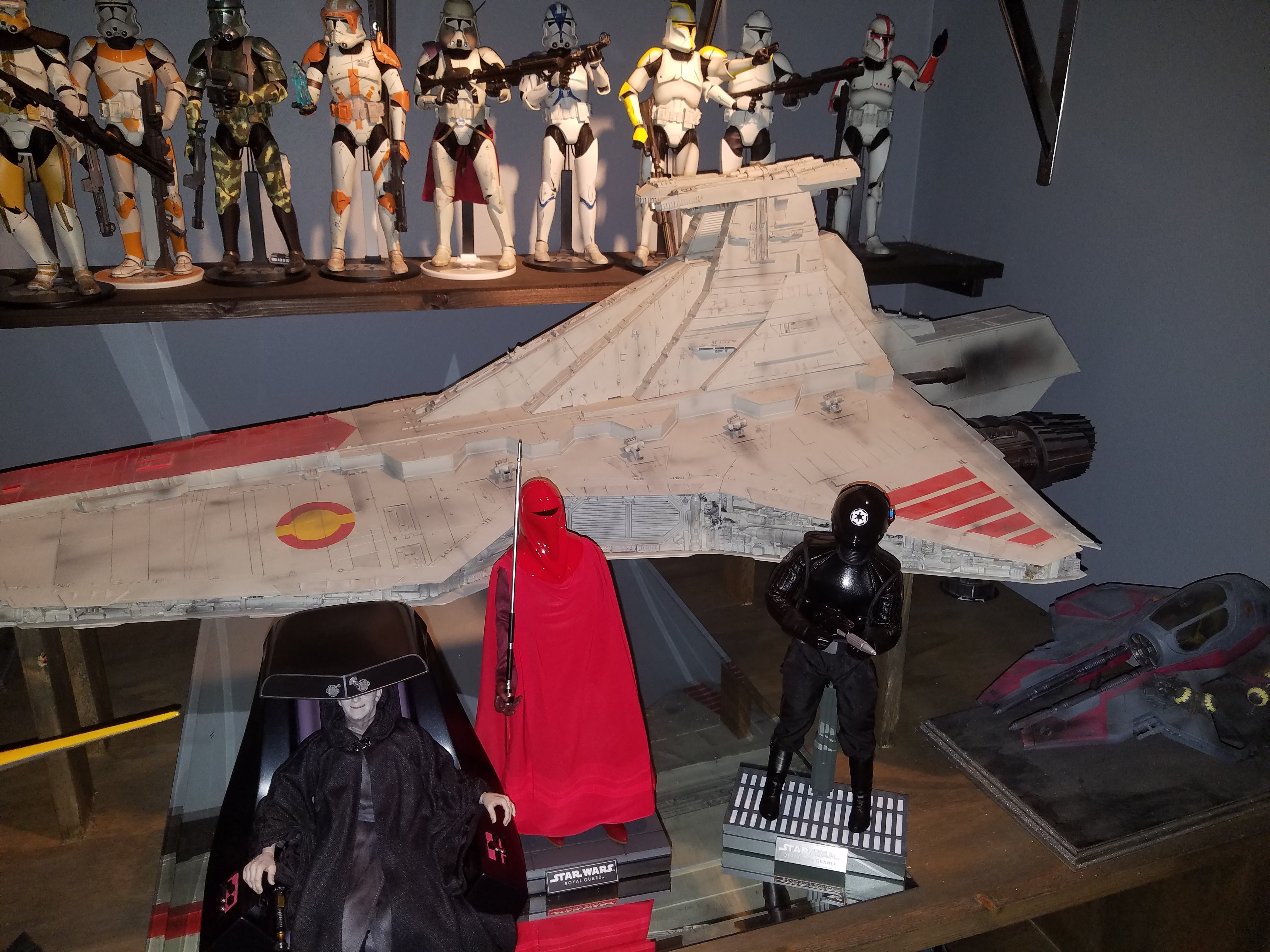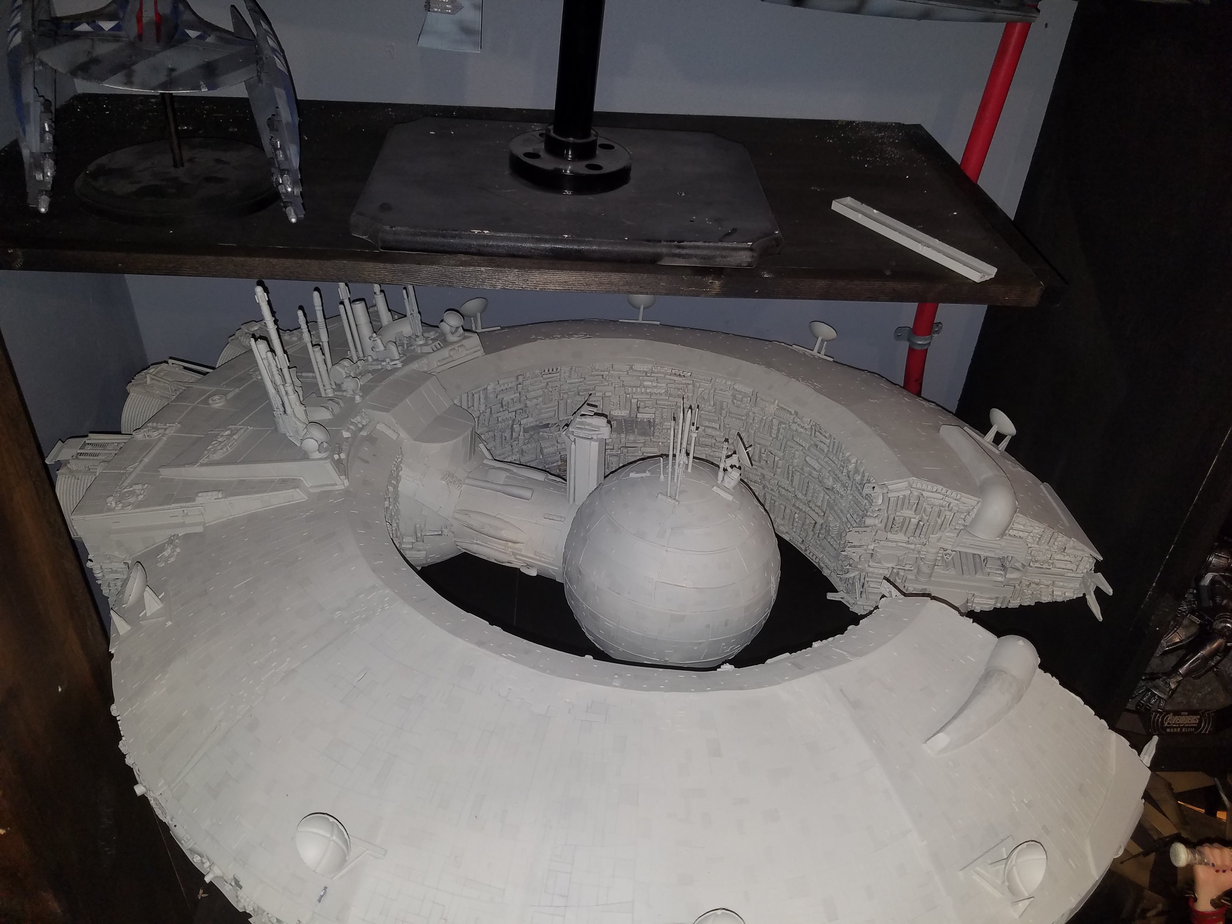 I have been a long time viewer of Modeler Magic and thought I would submit some of the things that I have created over my modeling career. Here is a general look at my current collection. Most of the larger ships are all built from scratch. The lit builds are from kits, and I have a lot of Hasbro toy mods in there as well. Also, I have a few Randy Cooper models and other garage kits. I wanted to scratch build pieces that are unique and not found in many other collections.