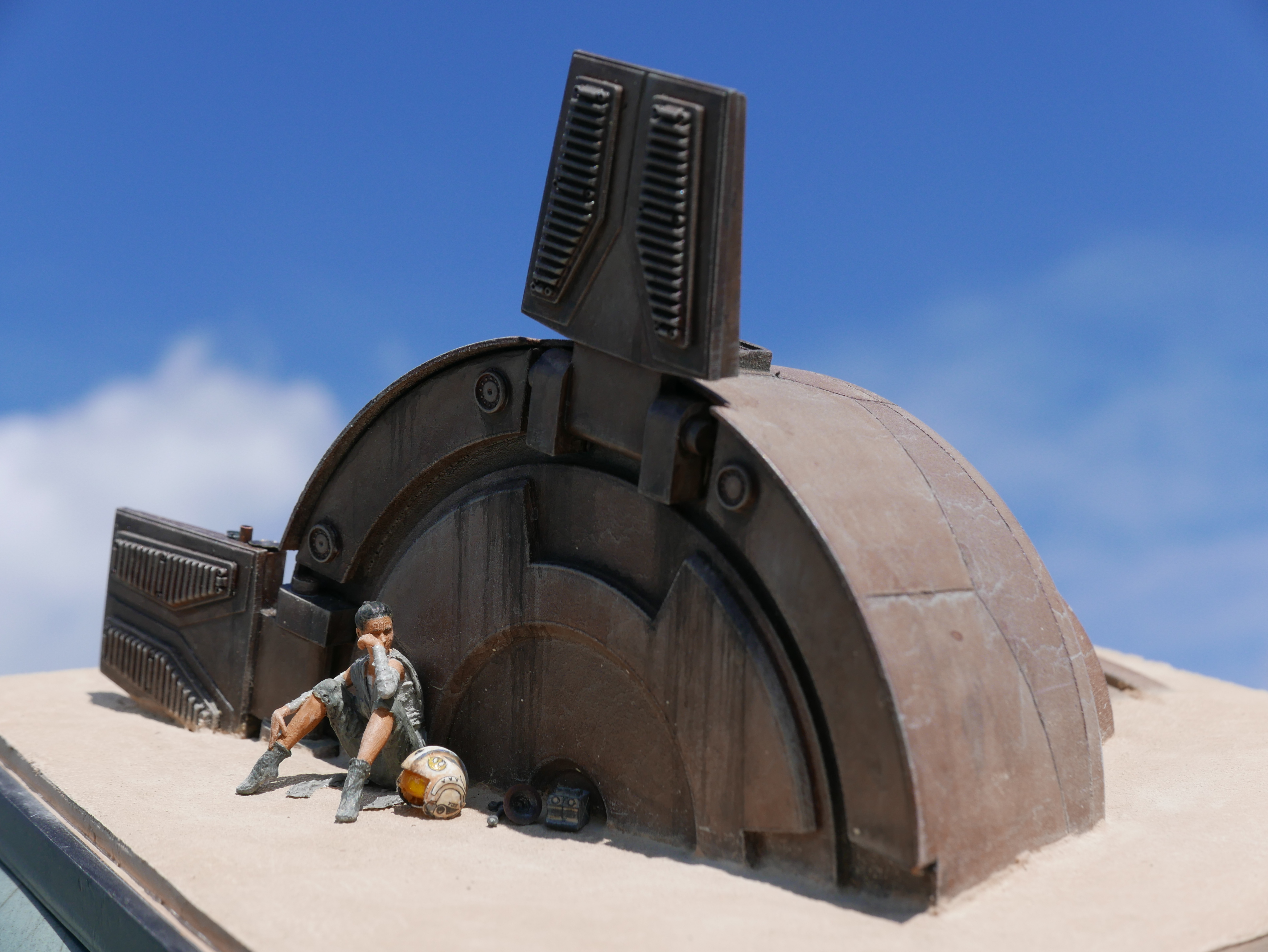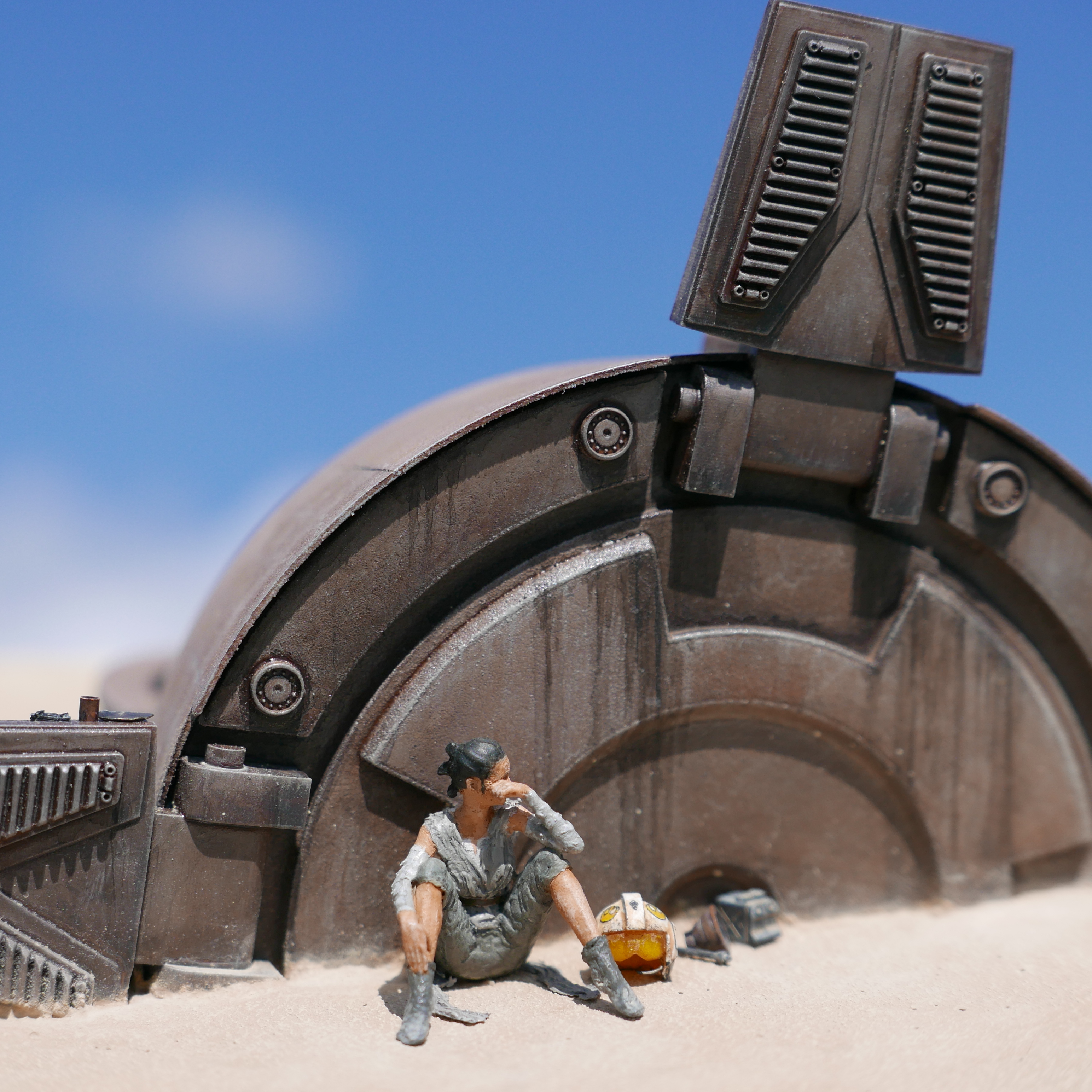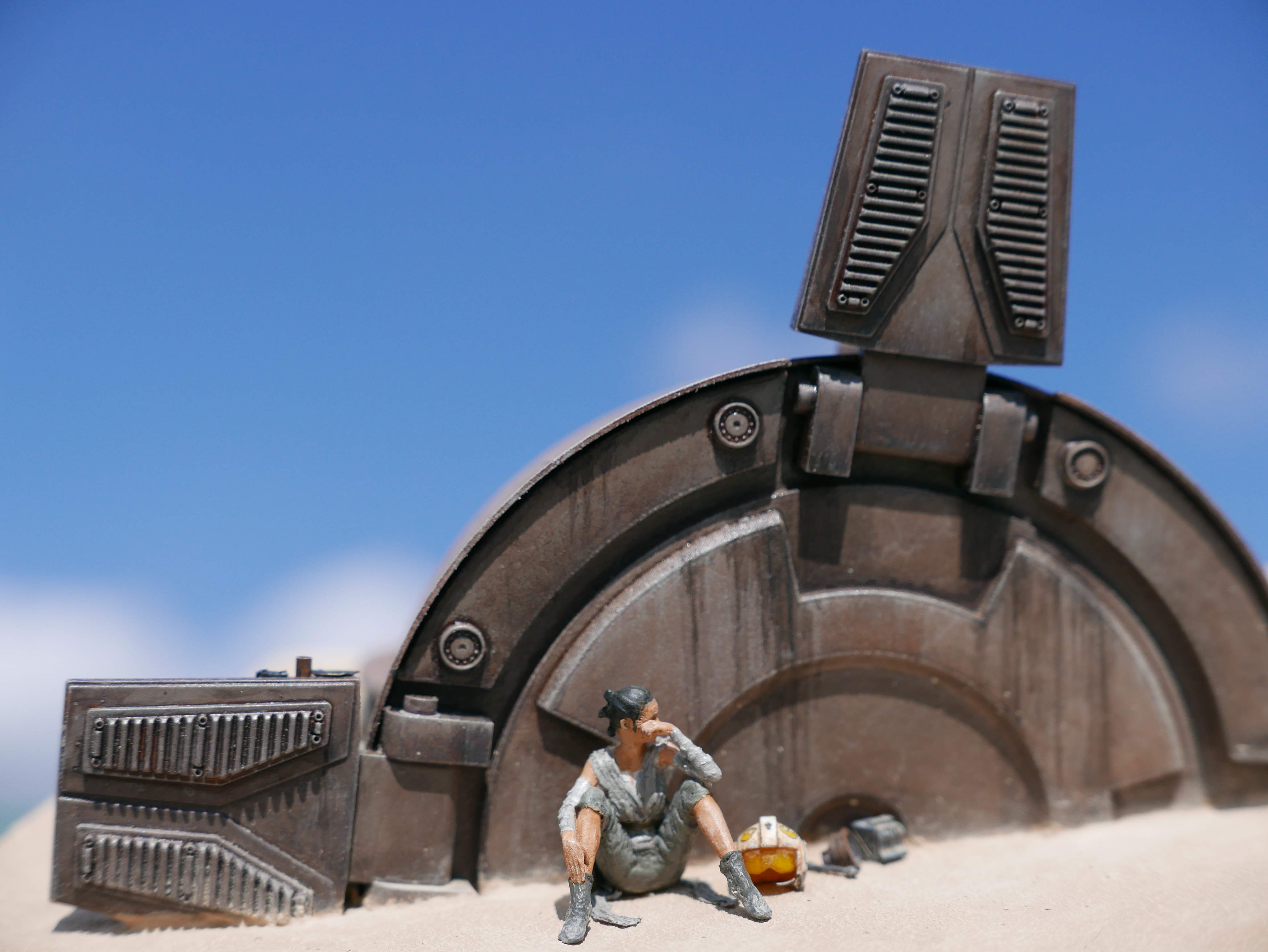 Here’s a diorama of my favorite scene from “Star Wars Episode VII – The Force Awakens” in 1/35: Rey sitting in front of her AT-AT home, playing with the rebel pilot helmet.