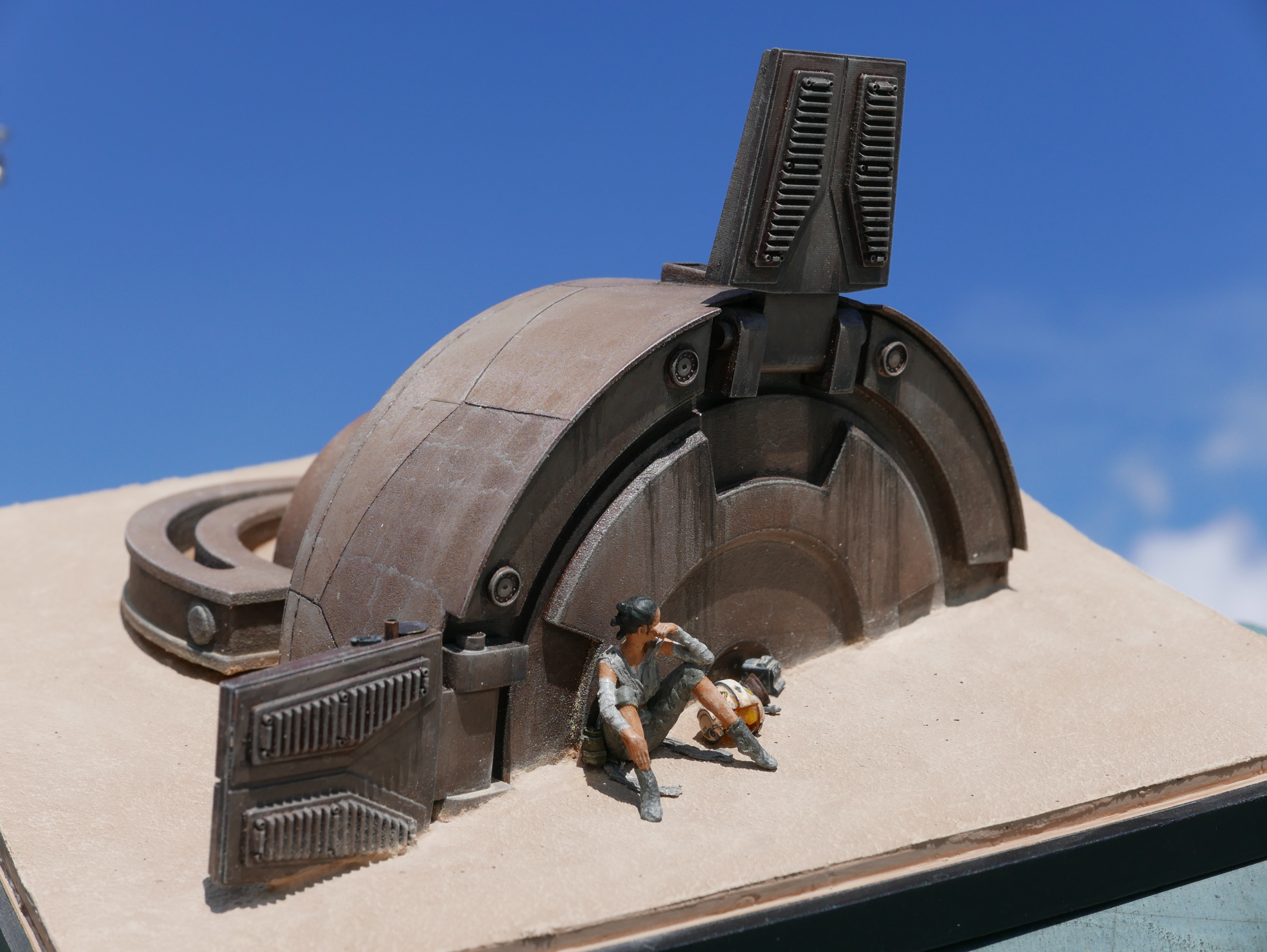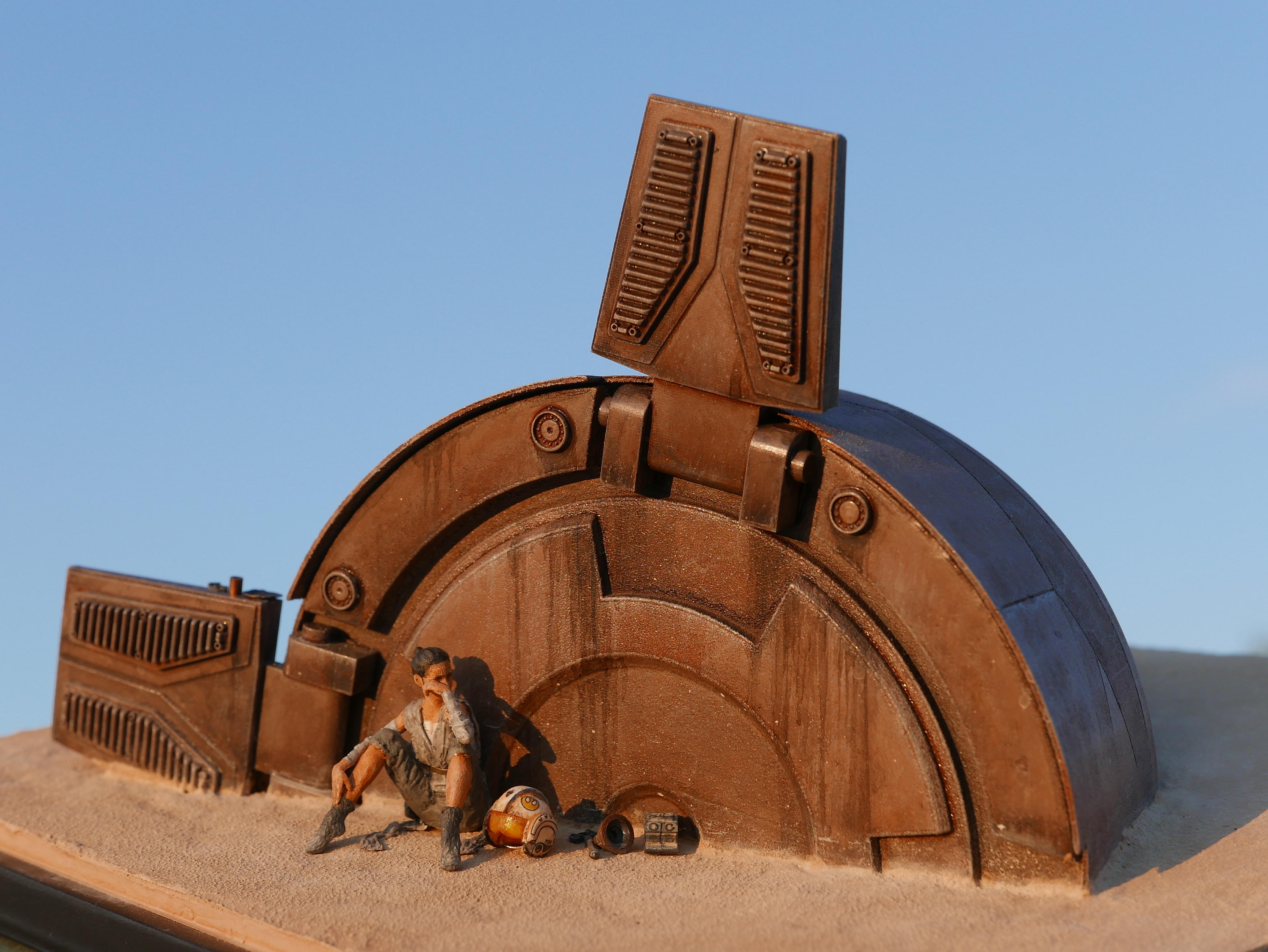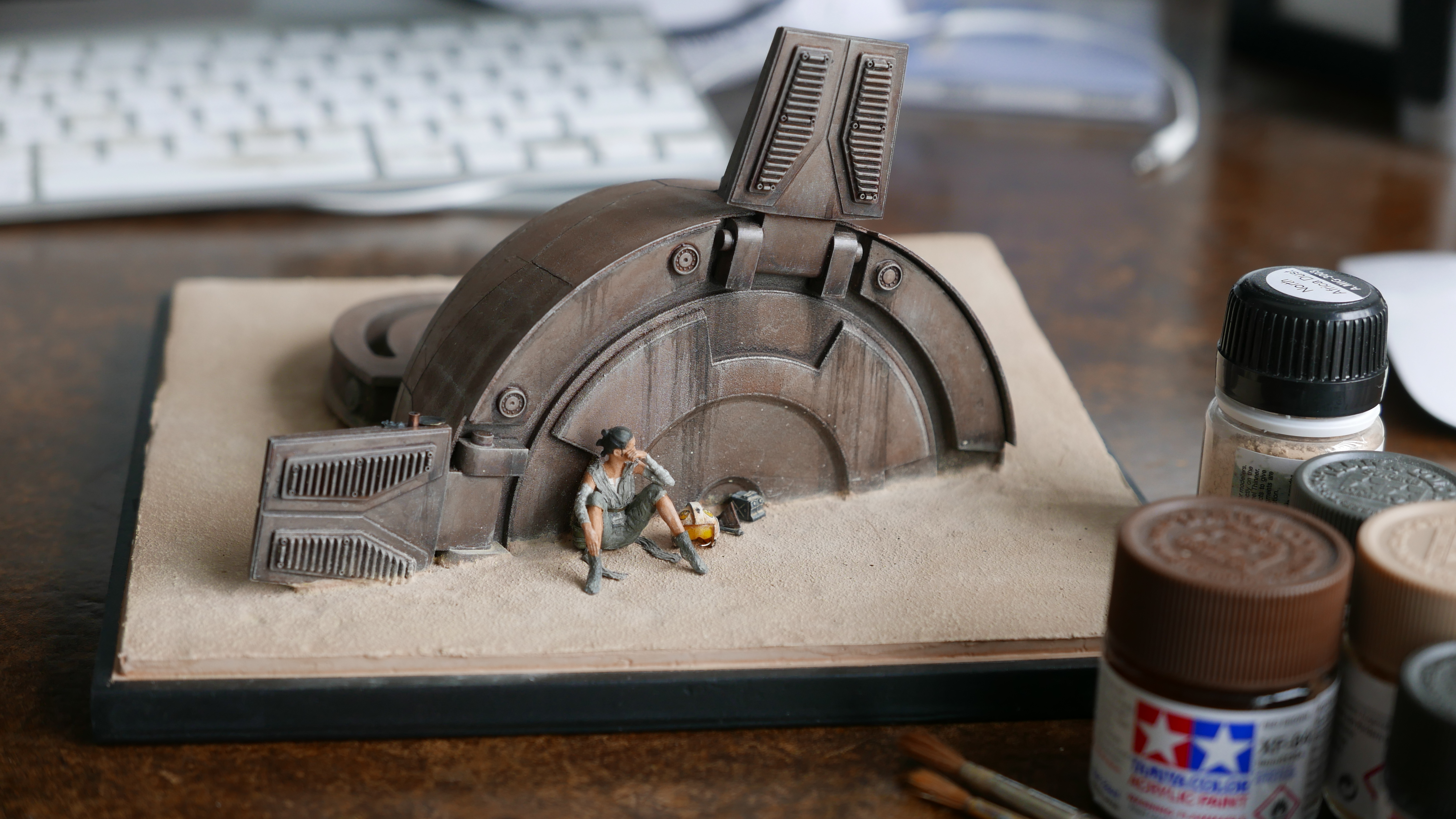 Here’s a diorama of my favorite scene from “Star Wars Episode VII – The Force Awakens” in 1/35: Rey sitting in front of her AT-AT home, playing with the rebel pilot helmet.