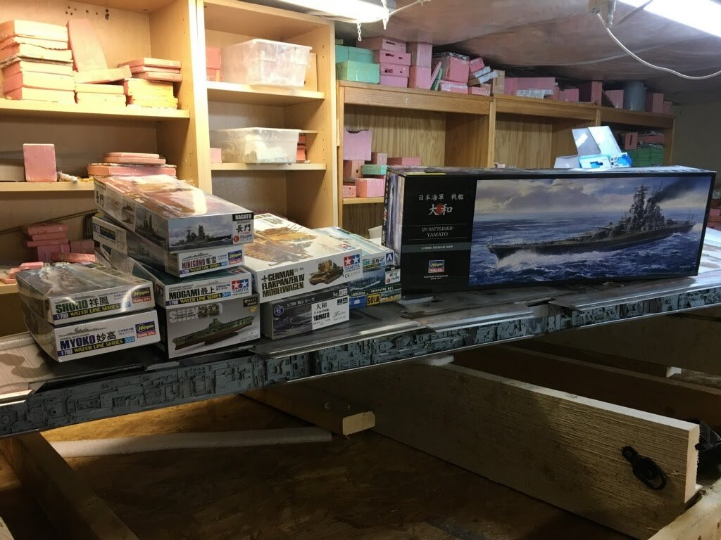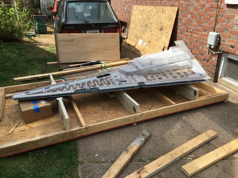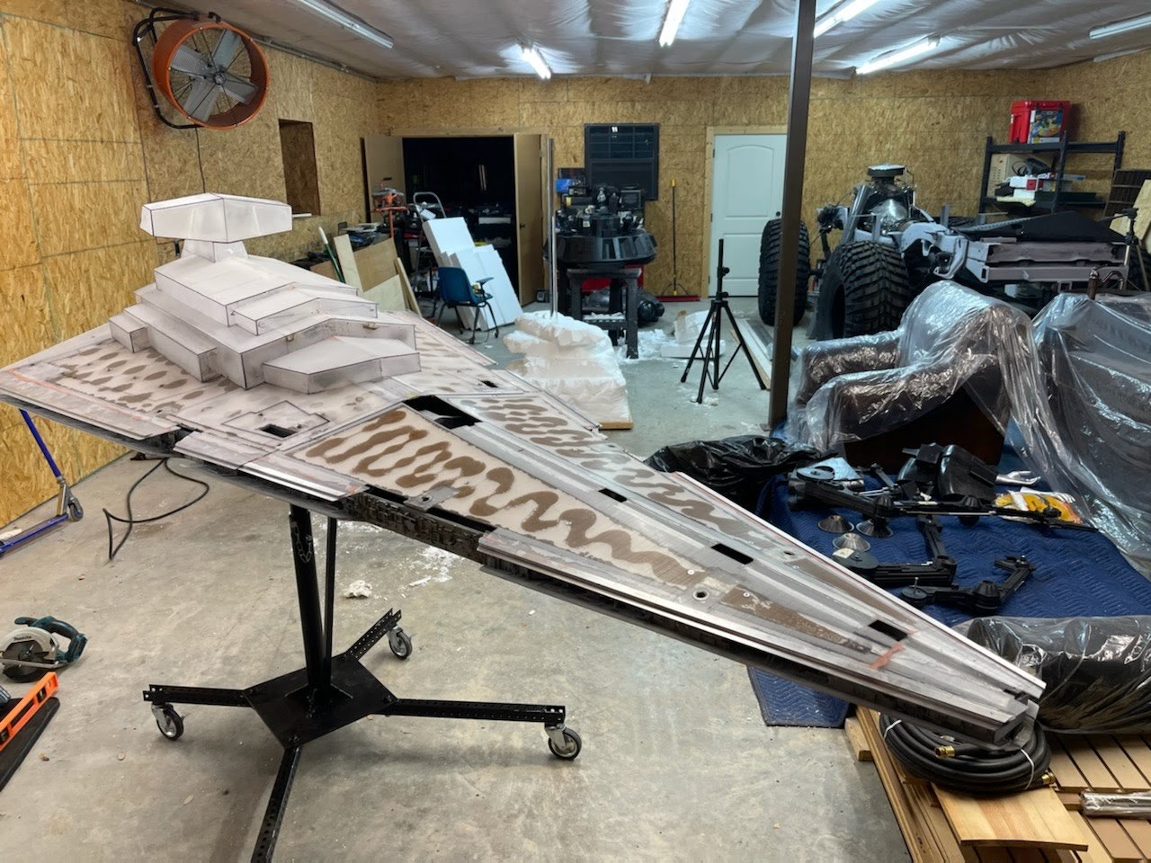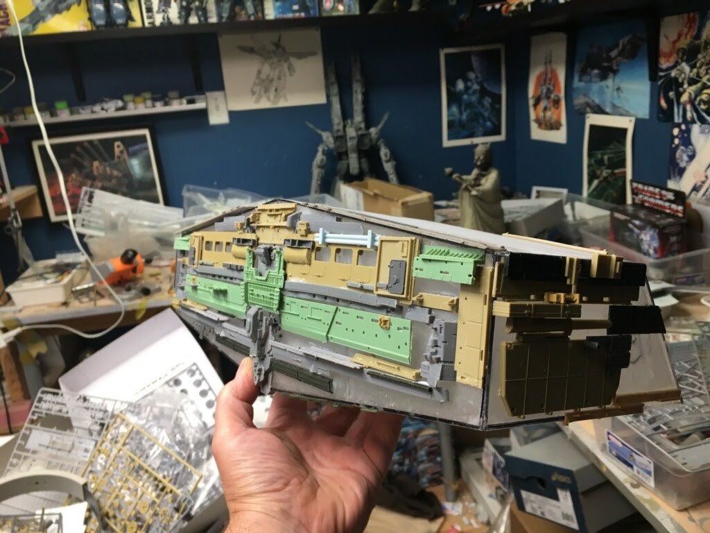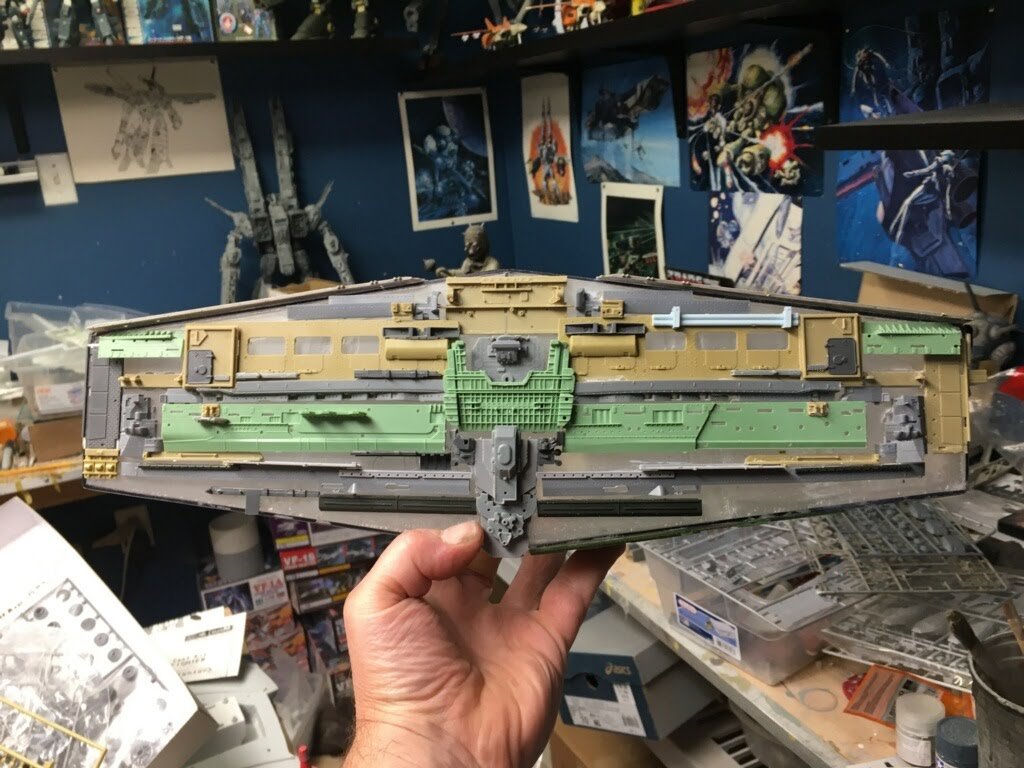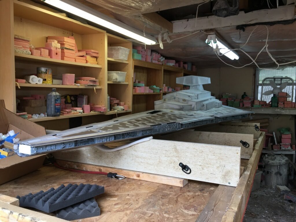 Six years ago I was able to visit my friend, and artist Marc Elkins. He brought me to his shop area where he showed me his latest progress on the 8 foot (studio scale) Star Destroyer Avenger he was making. He had shown me the initial layout, and footprint of this behemoth model a few years before and I was looking forward to viewing the physical creation. That time had come, and what an amazing site this was to behold… as the Superstructure was now complete and the shape was ominous to view. Marc had already scratch built a 6 foot version of the Avenger (which now resides with Michael Plante), so I was excited to see what he did with this one as well. As the business of life sometimes pulls us from projects, such was the case of this Star Destroyer project of Marcs. Thus, just a month ago I received an excited call from Mike Hawes (as his passion for this art form is as fantastic as many of ours reading this posting). He had just purchased this amazing, in progress piece from Marc, and he and his son Indiana were traveling to pick it up from Marc’s shop. After doing so, Mike and his son actually stopped by my own home while bringing this amazing piece back to Texas. When Mike showed up at my door he had a huge smile on his face regarding the Avenger that was sitting in his rented Suburban. I fully understand this joy…lol. Once Mike got this superstructure back to his Texas shop, he promptly made a crate for it and sent it on it’s way to artist Mike Salzo to be completed. As one may imagine, and may have experienced, the tension for its safety to arrive there was high, and yet it surely did, with great relief to us all… lol. Mike Salzo promptly got to work on this amazing piece that Marc Elkins began years ago. As you can see, the kit-bashing on this model is in great depth (one may remember the Battlestar Galactica studio model when recalling this type of model making). This studio scale AVENGER shall require around $10,000 USD in just purchasing the right model kits to make up this giant model’s details in order to make a proper replica.