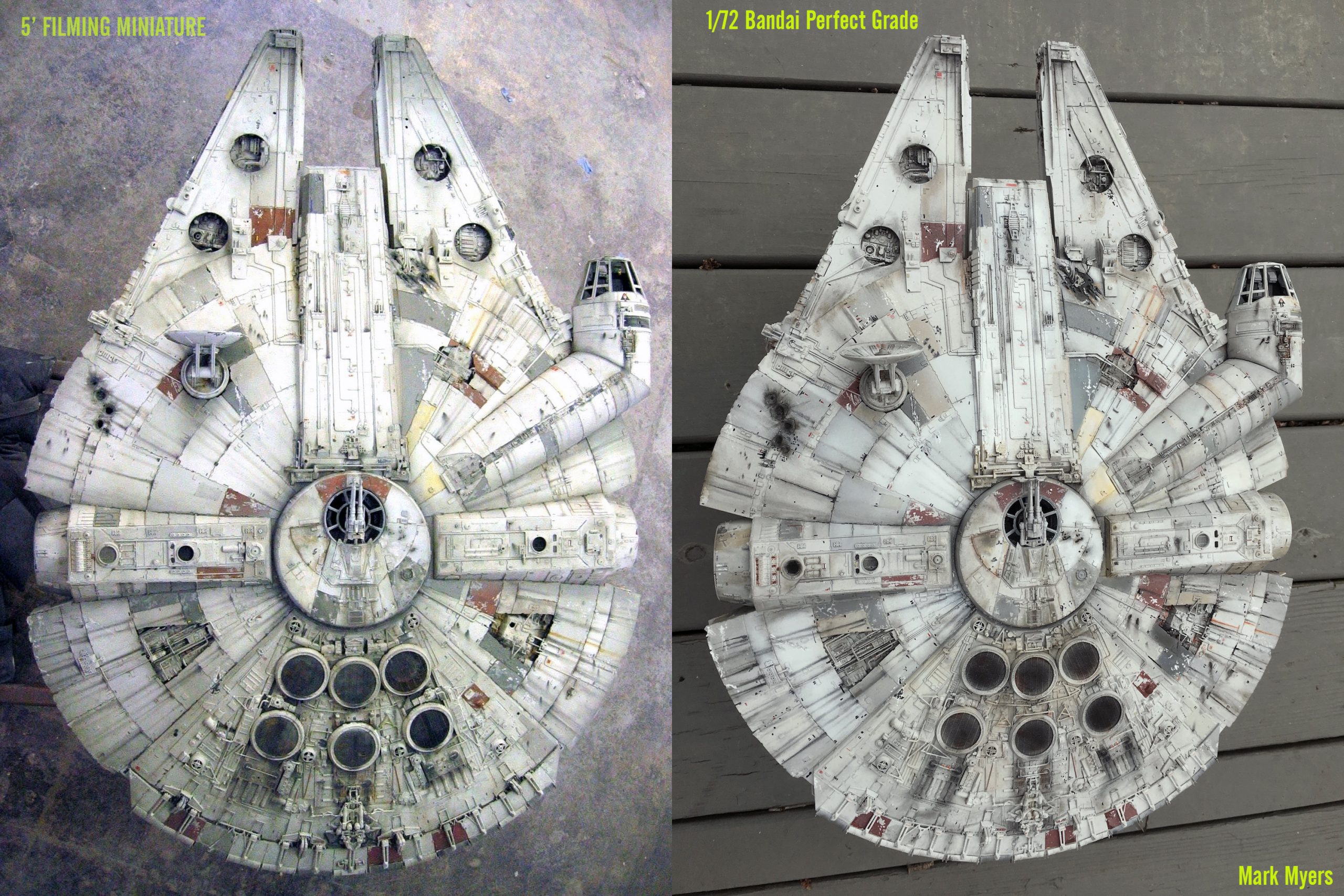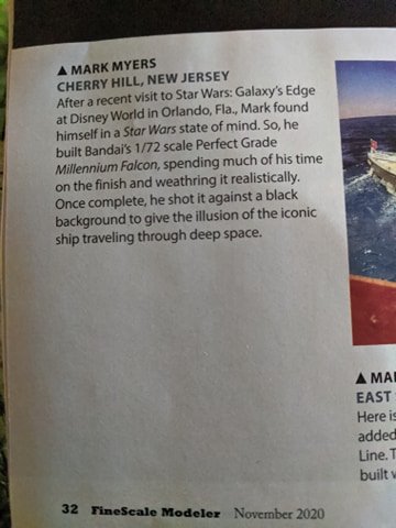 Here is my Bandai 1/72 Perfect Grade Millennium Falcon build. The model features cockpit and engine Lighting. The kit supplied cockpit was replaced with a cockpit accurate to the 5′ Filming Miniature. The model was airbrushed Floquil,Model Master and Tamiya colors to get as close to the actual Filming miniature as possible (see comparison photos). This Model was currently featured in the Gallery section of the November 2020 issue Of Fine Scale Modeler Magazine as well as a full write up in #66 of Amazing Figure Modeler Magazine..