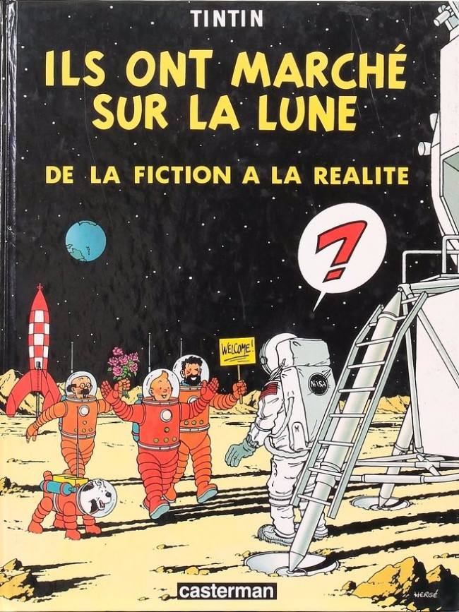 The pose (attitude of Tintin with his hand up) is based on another album nammed Ils ont marché sur la lune (They walked on the moon) published in 1986. It is a propagandist book showing how Hergé had developed his science to permit the characters to reach the moon with a modern rocket and walk the surface of the moon in space suit, before Armstrong (but after George Pal