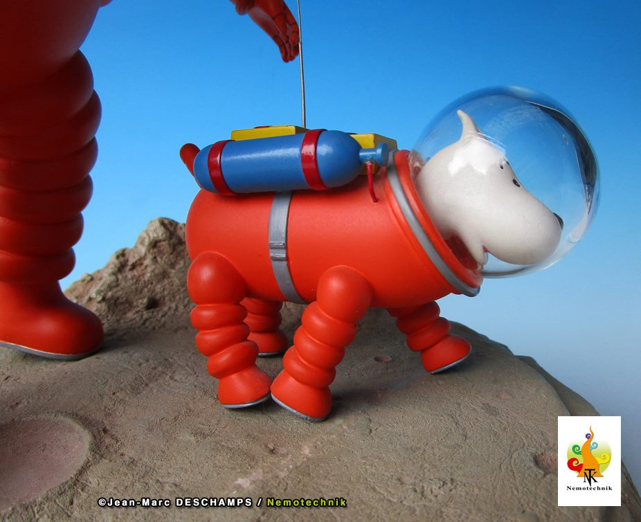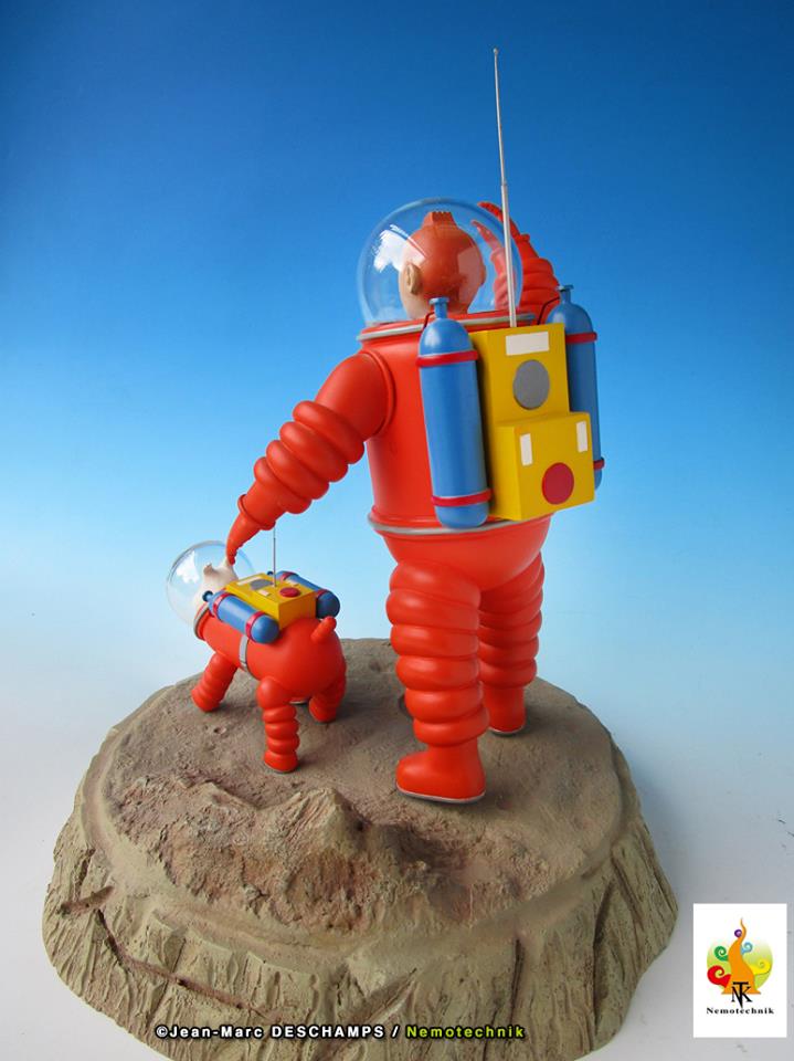 C’est dans les années 90 que j’ai créé cette saynète au 1/8 des personnages célèbres. Pour cela, je m’étais bien entendu basé sur l’album principal dans lequel on voit les scaphandres en détails, mais pour la pose je me suis inspiré d’un autre album propagandiste à la gloire d’Hergé : Ils ont marché sur la lune, et dont la couverture montre Tintin et ses amis accueillant Armstrong à sa descente du LEM !