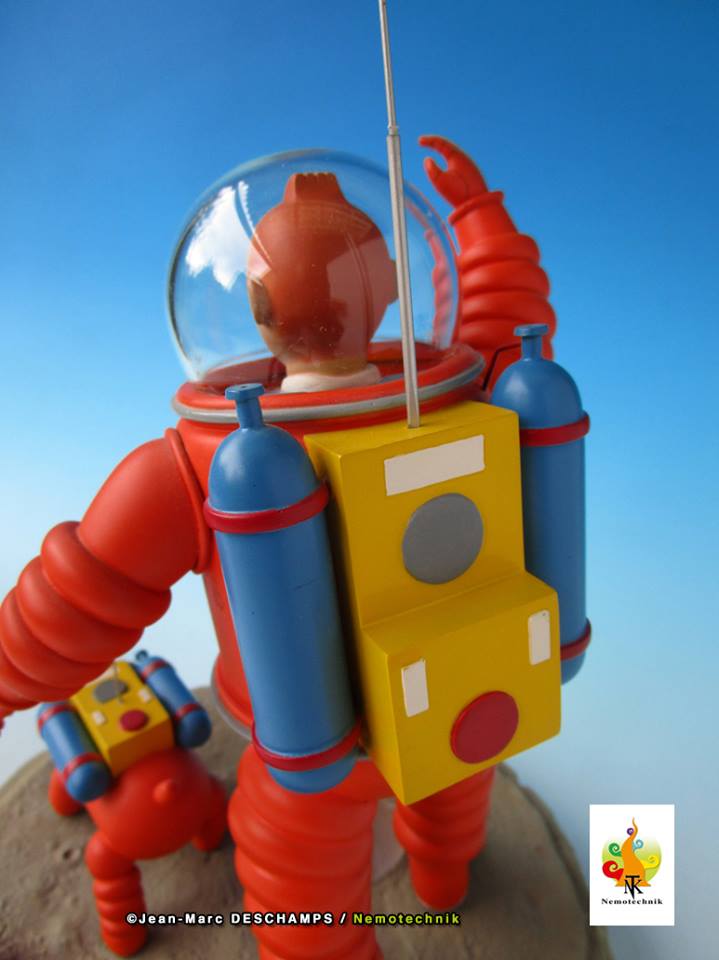 P.S.: j’apporte une précision qui découle des discussions : les combinaisons spatiales sont bien peintes de couleur orange, telles qu’elles figurent sur l’album Ils ont marché sur la lune. Cette couleur est néanmoins plus sombre que le orange choisi par Hergé dans les albums originaux.