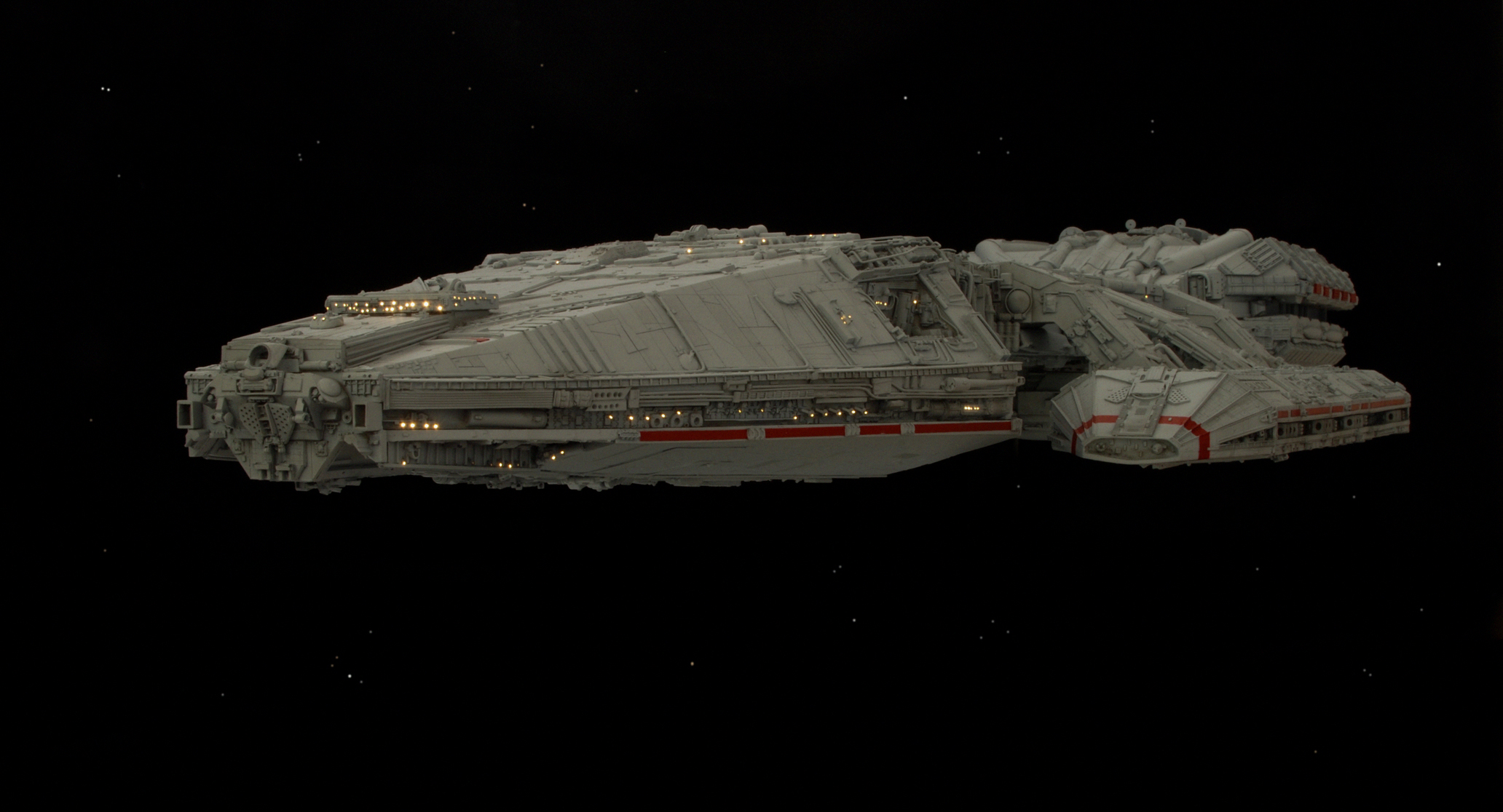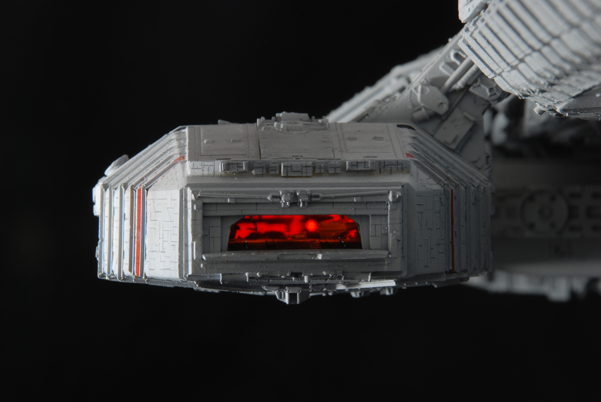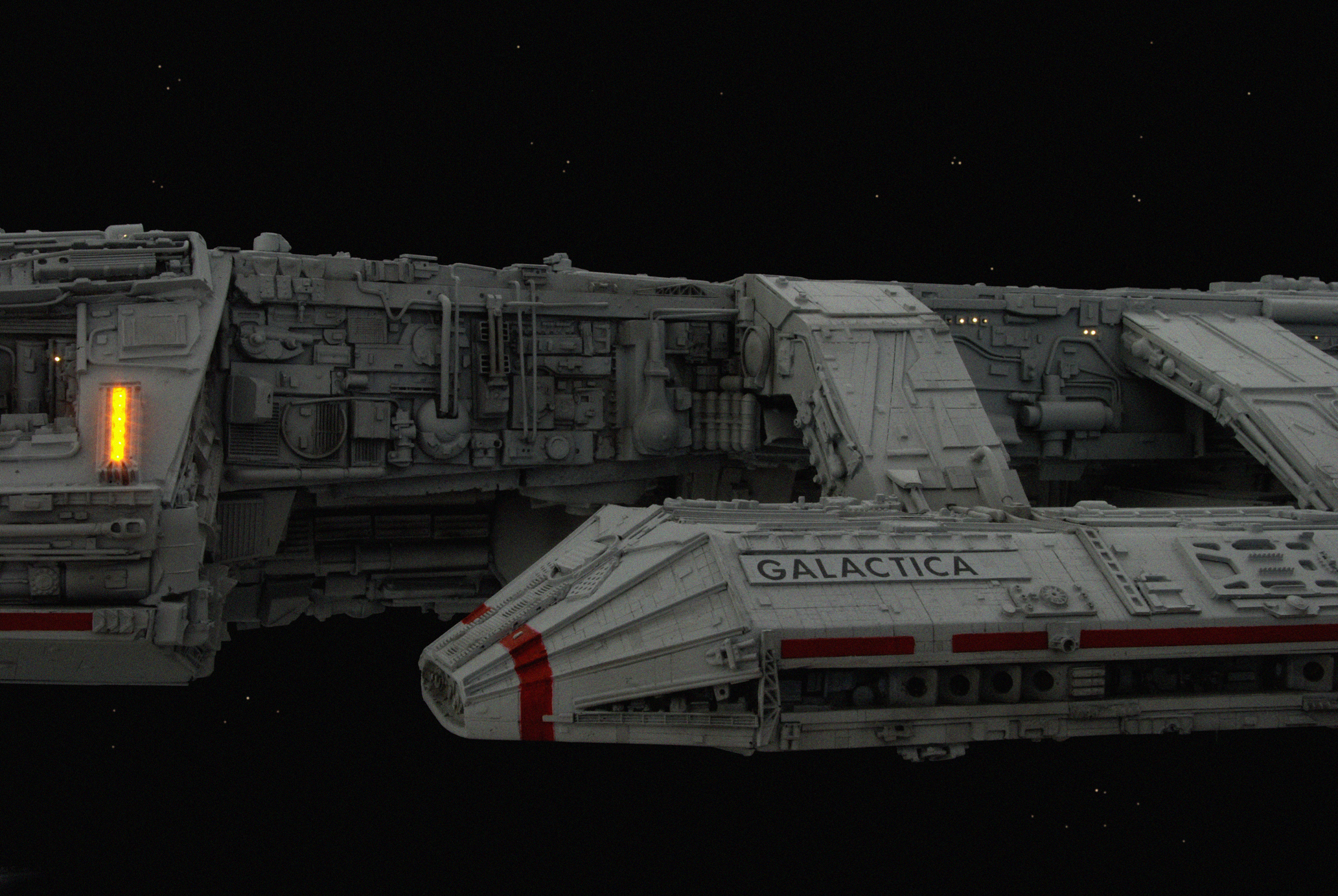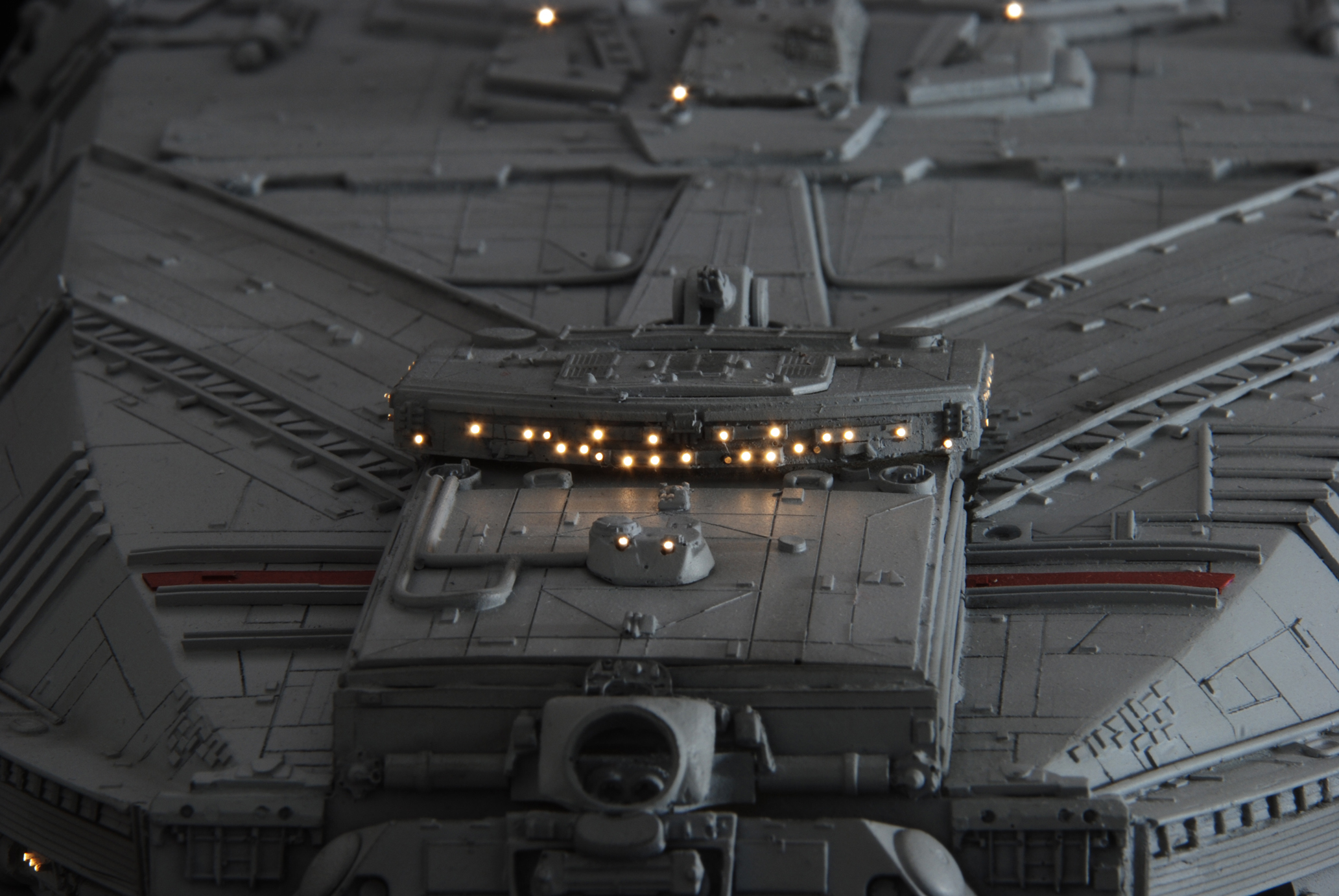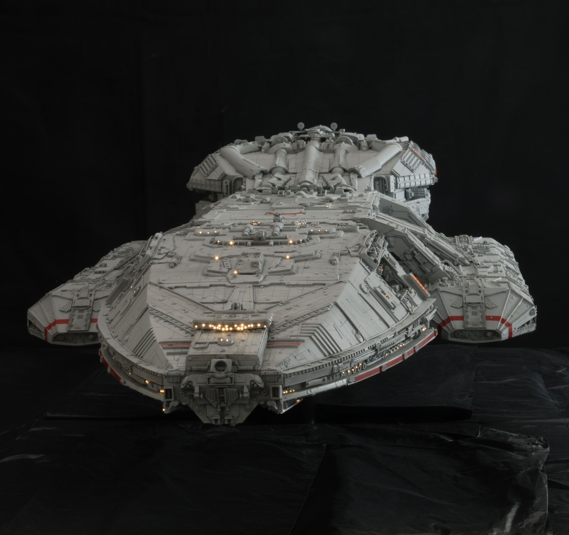 I wanted to drop you some images from a commission I’ve been doing for a client in Germany, Michael Kuehner. The project was to deliver 2 of Mike Salzo’s half scale battlestar kits. However, in order to add extra detail and authenticity I’ve added a large amount of extra parts which are derived directly from the original kit parts. I mold the original part then cast it in a special polymer, wait till it shrinks 50% then re-mold and cast them up in resin. (I supplied Mike Salzo with some parts in this way like the Roco tanks on the engine section which he incorporated into his patterns). Specifically, I wanted to make the area around the neck and nameplate as close to the original filming models as I could as this was such a signature shot from the show, as was the landing bay approach shot.