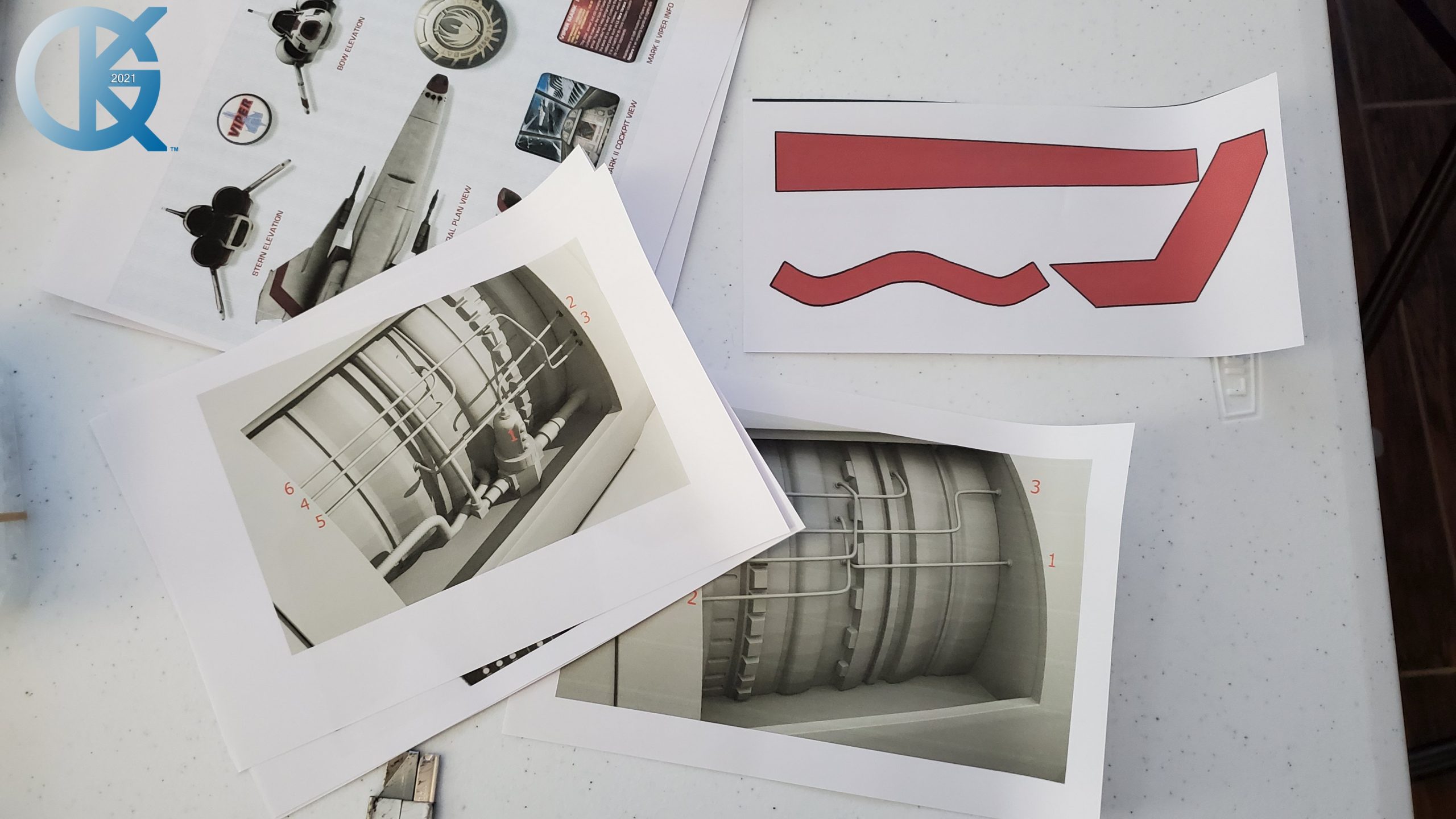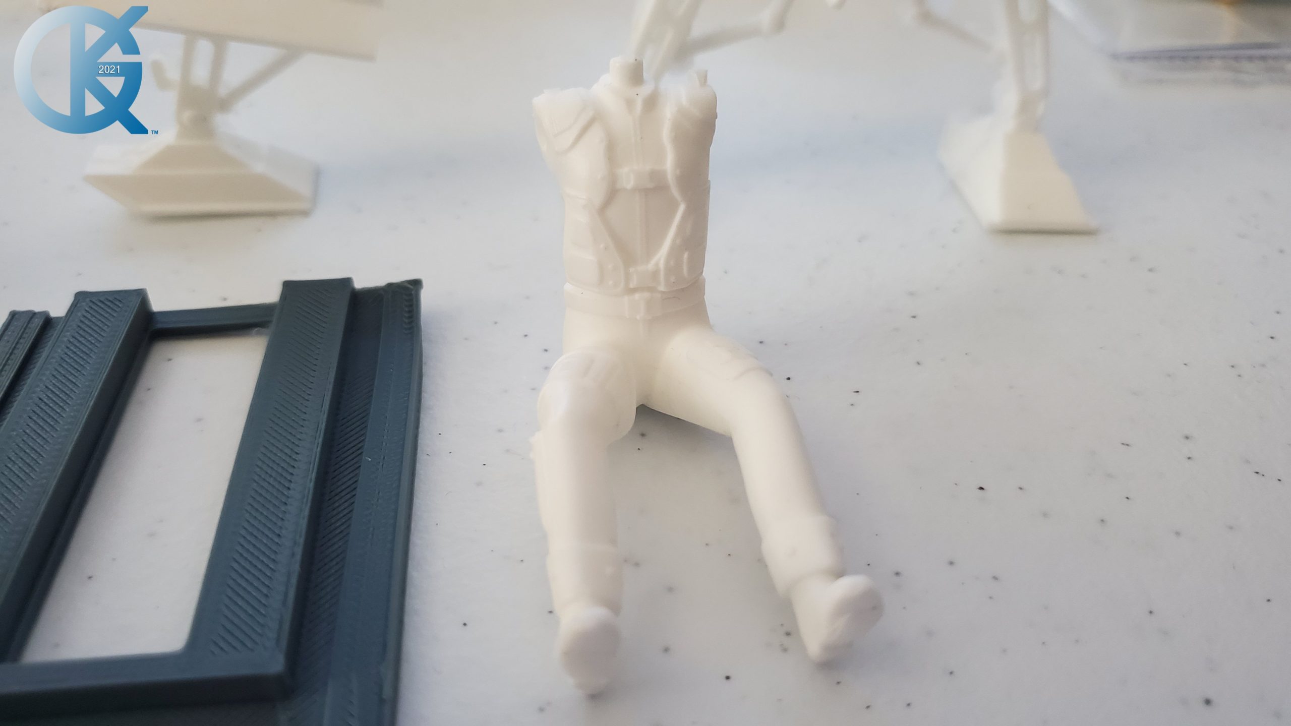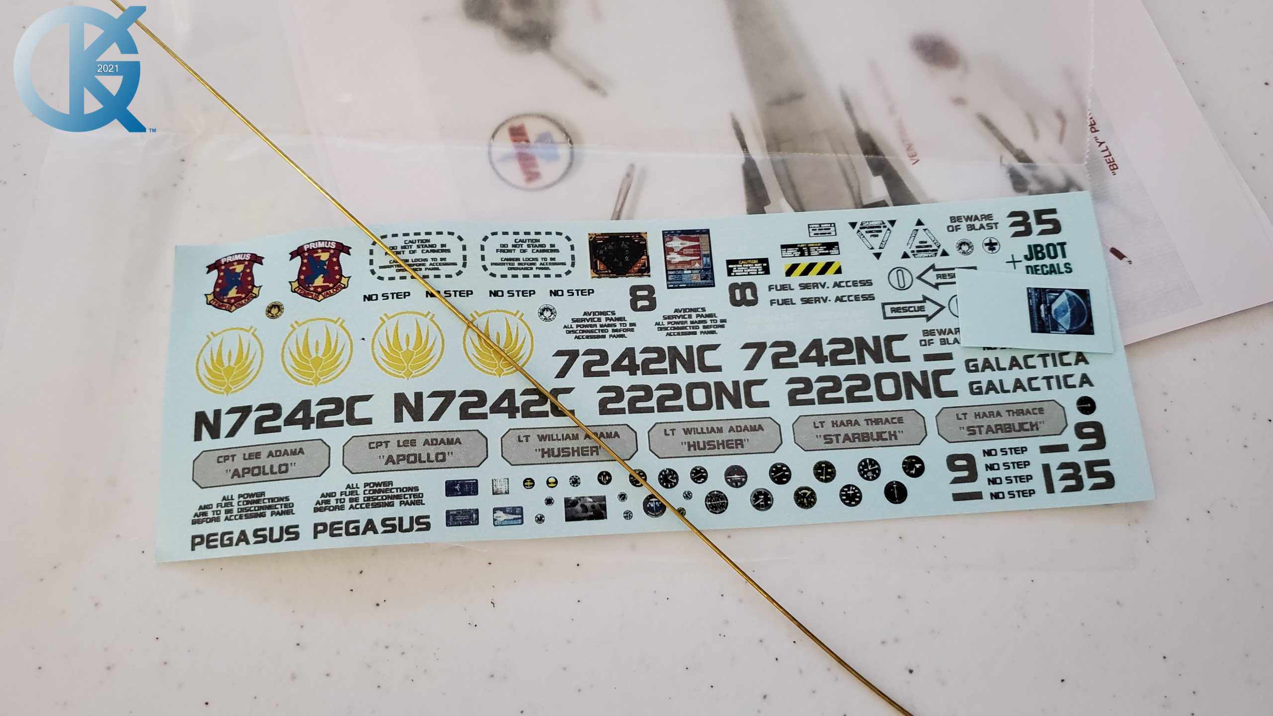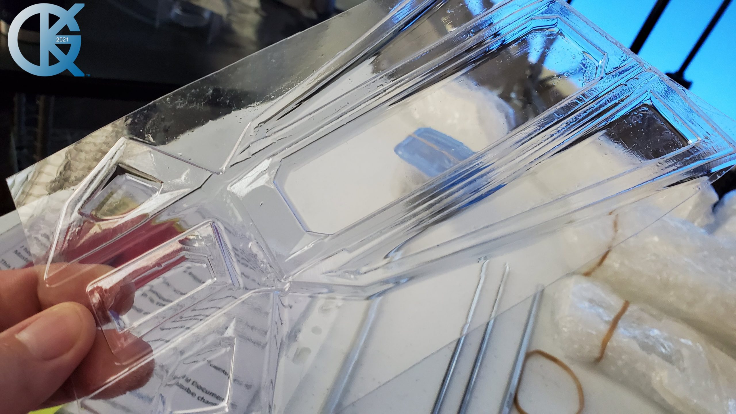 Pulling out the kit parts was wonderful, and there were many that were all wrapped up, or placed in fantastic tiny containers to prevent the parts from potential crushing. While some parts have a few tiny voids here and there, mostly each part I unwrapped looked wonderful and clean. There were some parts that shall require 3D print line clean up, but that truly is part of the build experience for the artist. Included were printed photos to replicate the paint job, along with a wonderful decal sheet, not to mention the aluminum mounting rode for the well designed stand base (also included). The canopy “glass” is included as well, though we may utilize our own options for this build, or possibly leave it off all together… like the studio scale replicas on display here. The vacu-formed canopy is nice, and is clear of any wavy artifacts. This kit looks to be comprised of the larger parts being resin casts, and smaller parts, or detailed parts having been 3D Printed directly. Occasionally there were parts that had some particles within the resin… like some sort of dark fibers. I am not sure what they are. That parts are clean enough, however, and after cleanup, build and paint,.. nobody viewing the finished piece shall every know those particles existed.