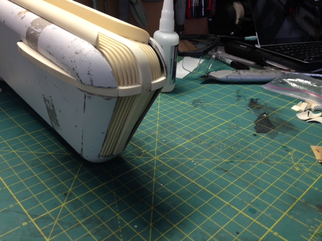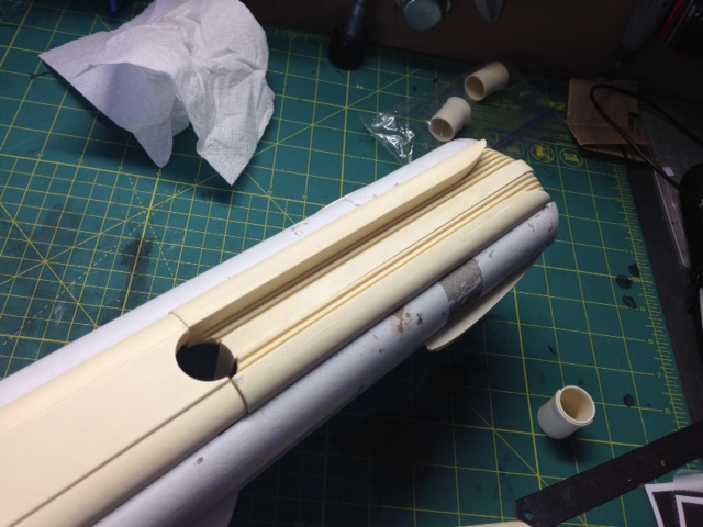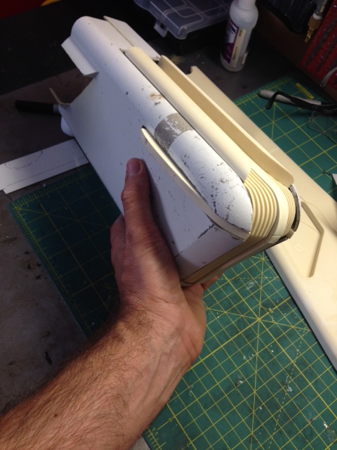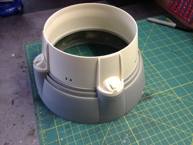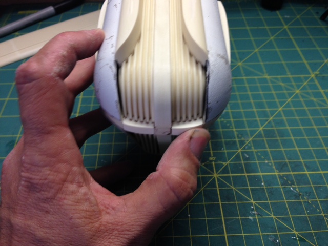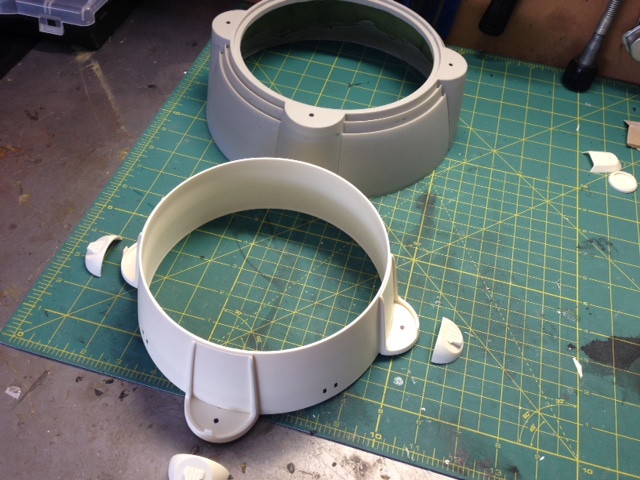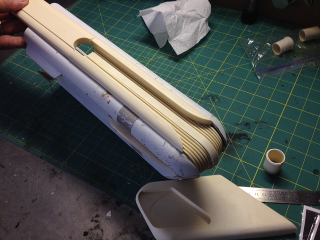 The white painted nacelle parts are of the original nacelles shipped years ago, that were done with an older material. Timeslip again showed it’s professionalism by shipping it’s clients the NEWLY made nacelles to replace the first that had been challenged in materials. This they did as professional courtesy…. something I will never forget and respect of TimeSlip. That stated, since we were throwing them away anyway, Marc smartly decided to utilize those older parts as test fit’s for the Nacelle parts we will be using with the new 4 foot nacelle shells. It is not often one gets a set of parts to be able to utilize as trial fits. Thanks again to George and TimeSlip for their outstanding professionalism!