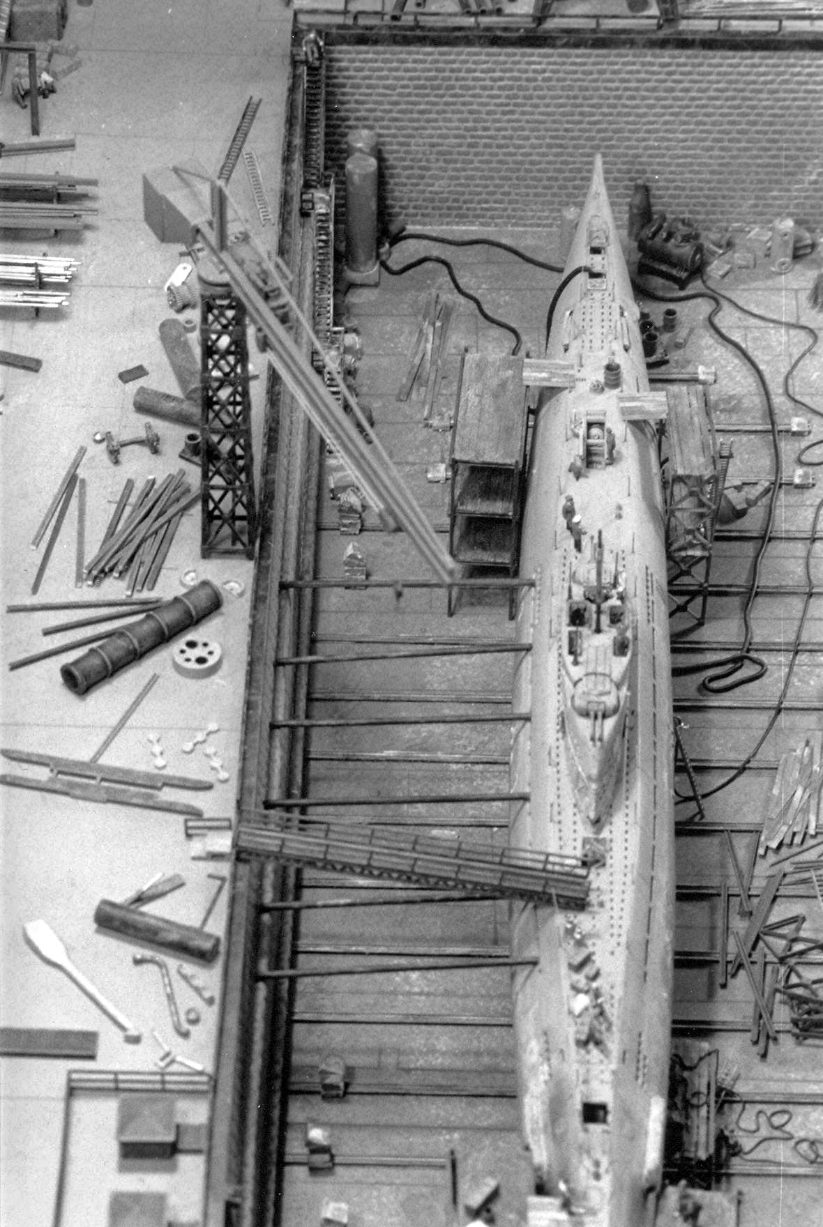 It was a really nice-looking model kit, quite unlike most of the older American Revell plastic kits  –  and the Type XXI had sleek hull lines, which I didn’t want to cut down to a waterline form.  So I went with a cut-away drydock scenario.