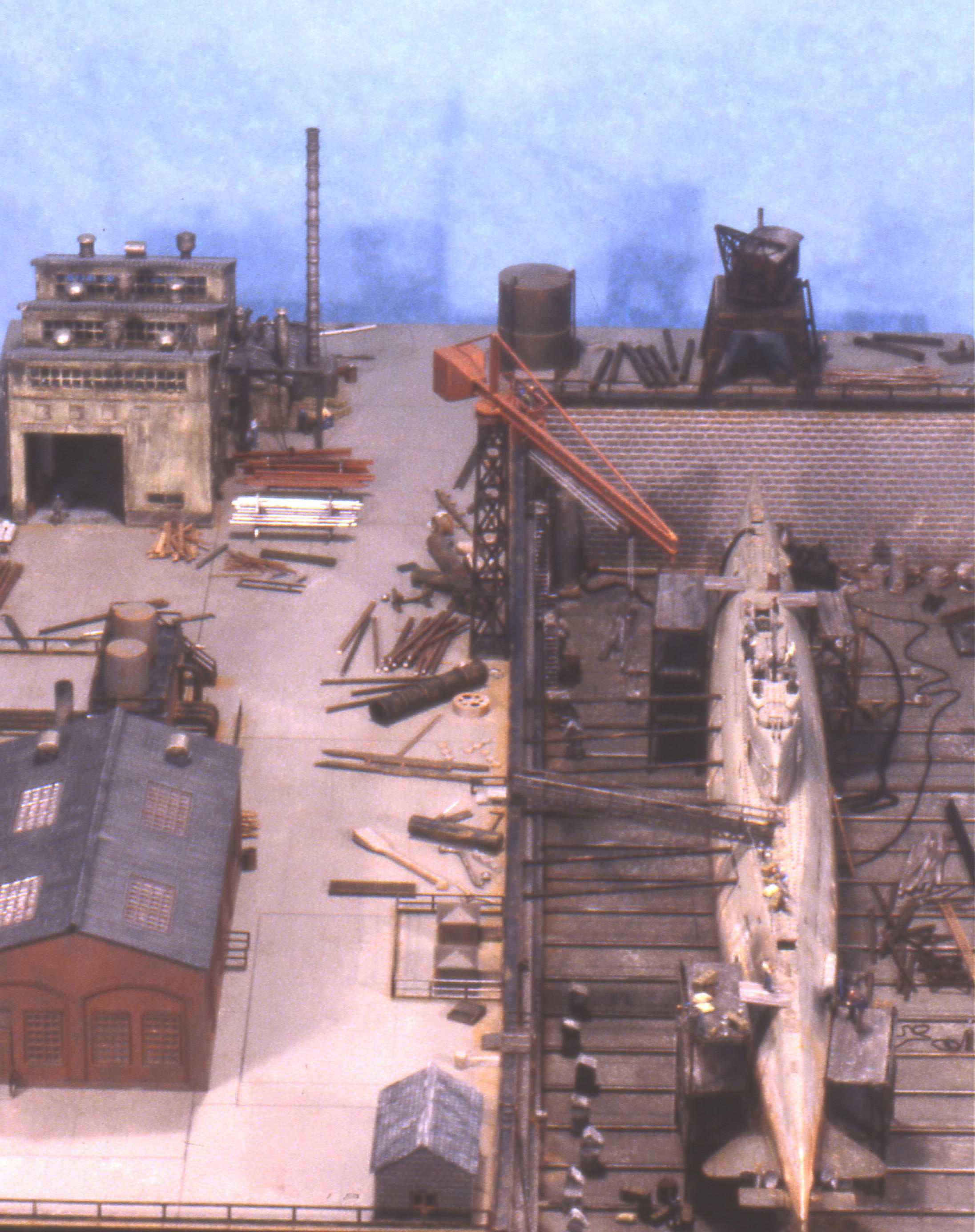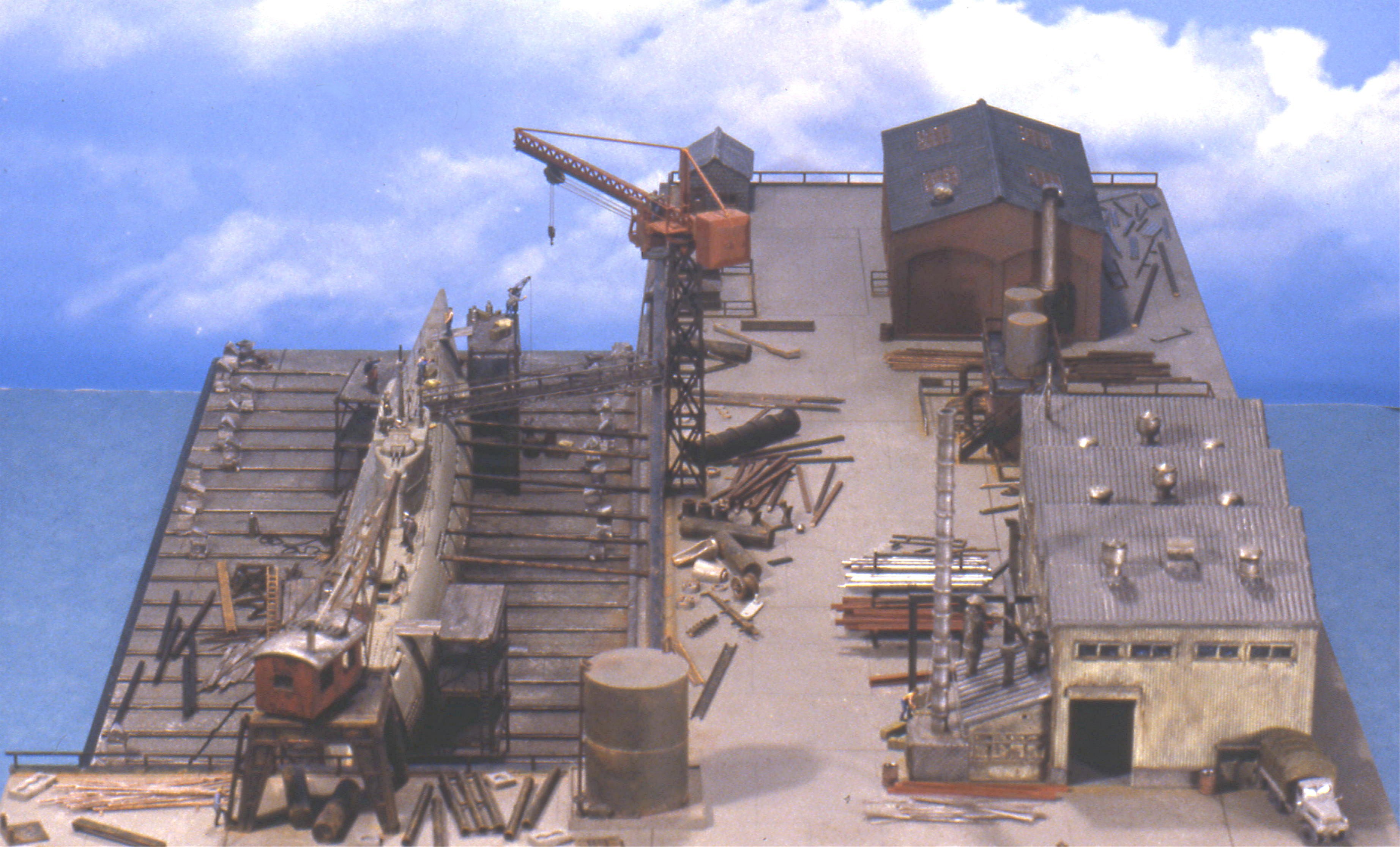 A 28″ x 16″ base board was fitted with a “L” shaped riser to form the cut-away basin, upon which stand the drydock’s support buildings, cranes, and effects.