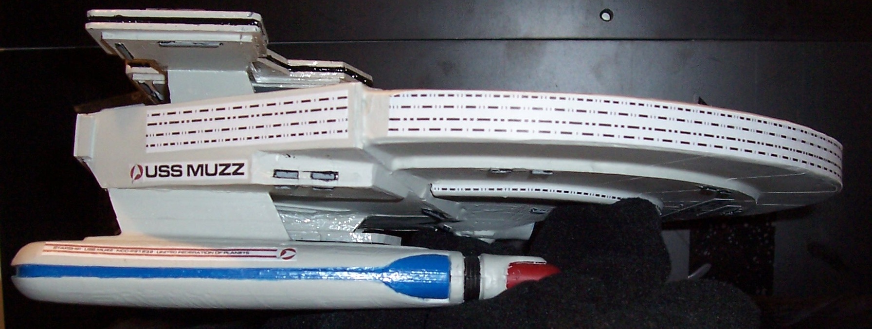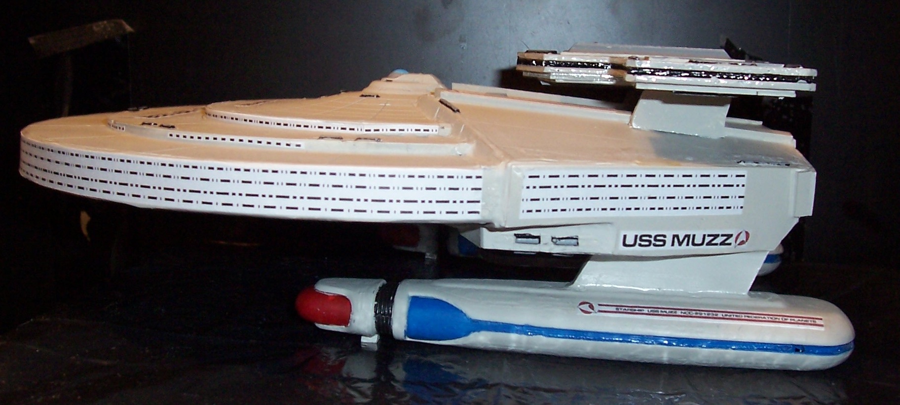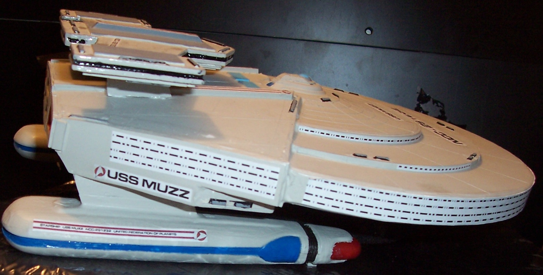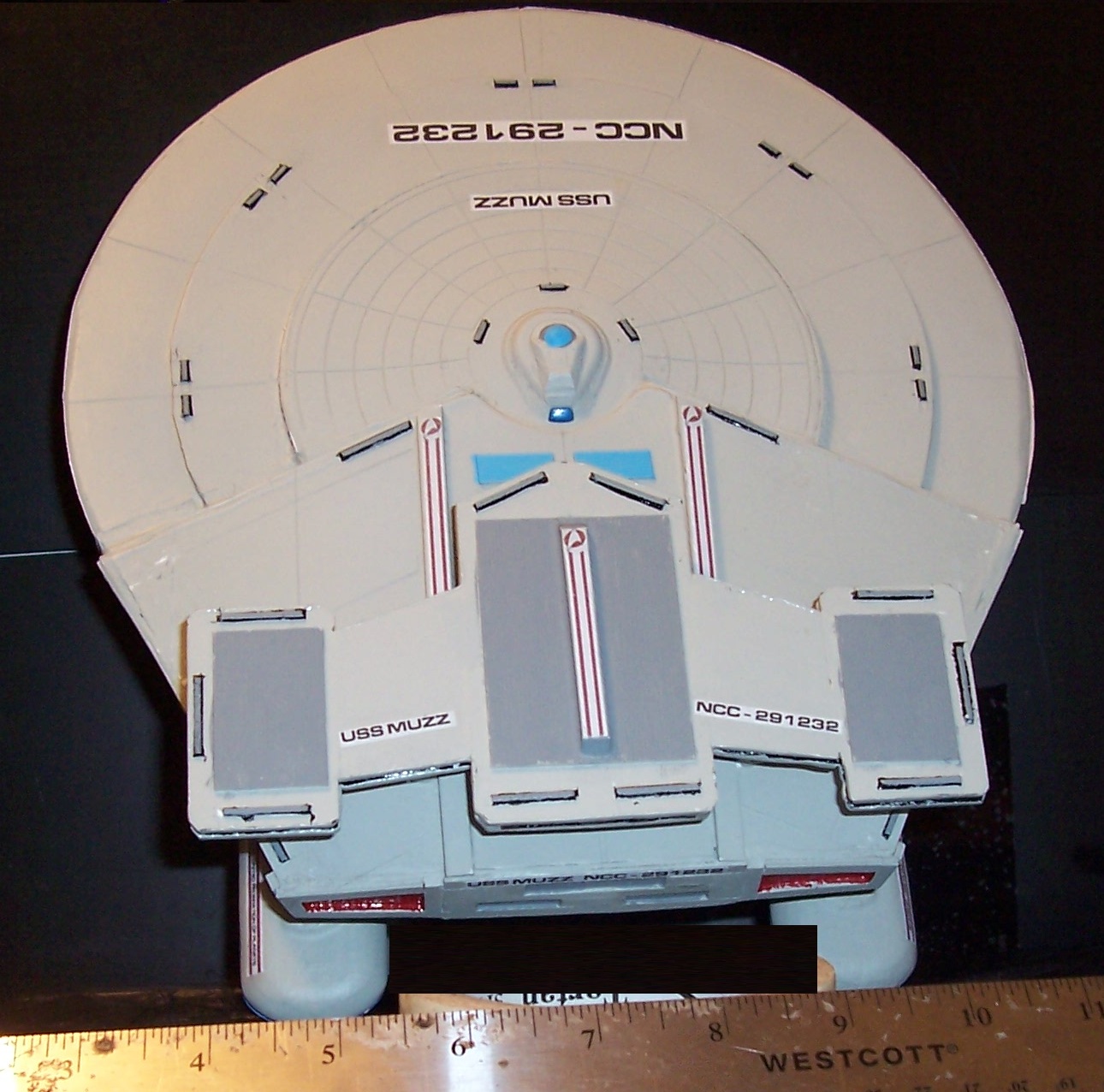 I give you the USS MUZZ, NCC-291232. A Scratch/Bash Styrene Model, 1000 Scale. The makings were done on my computer using graphics, Corel X6. Aprox, 12 inches long, 10 1/2 inches wide. There are 25 Torpedo Tubes, and aprox. 37 Phaser Strips. Main Bridge is located below the dome on top. The deflector below was made from scratch, No Kit was used.