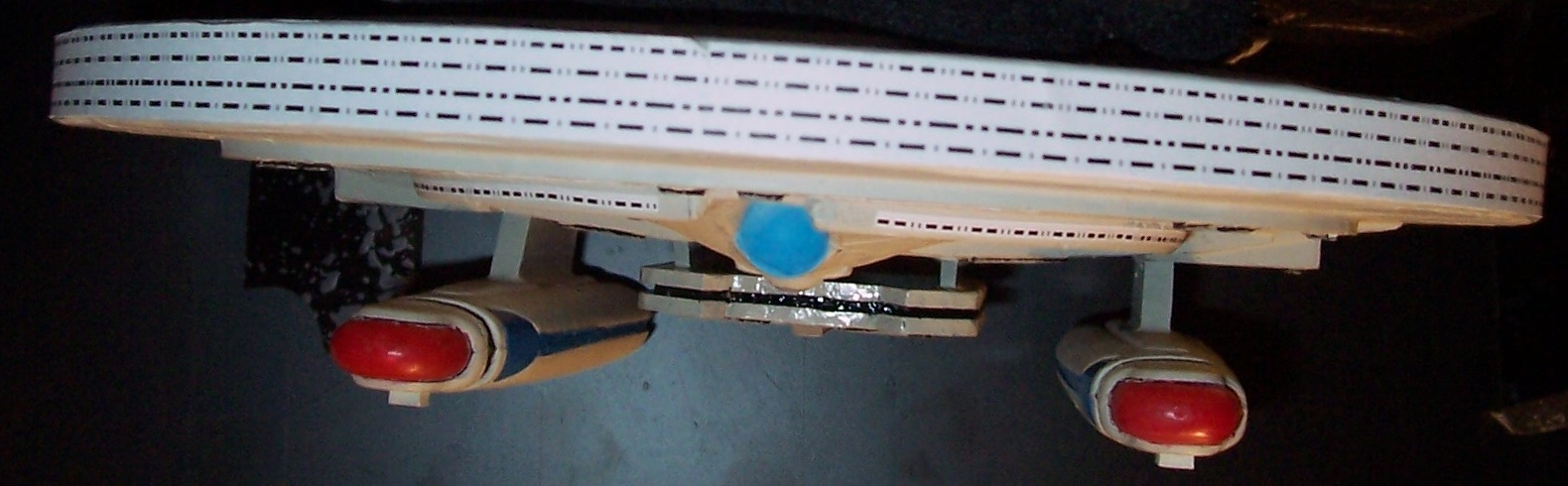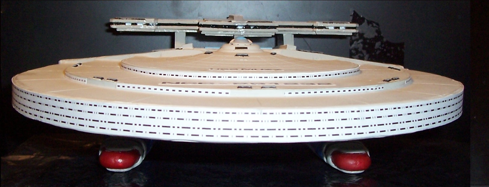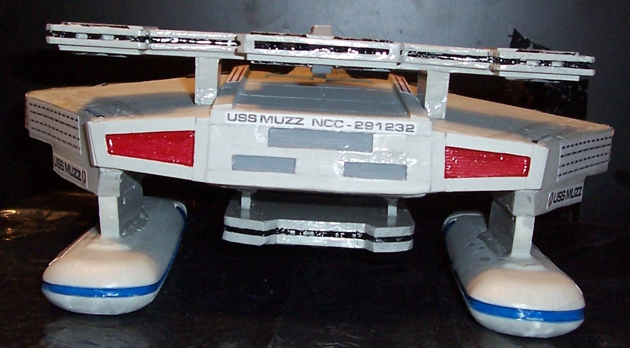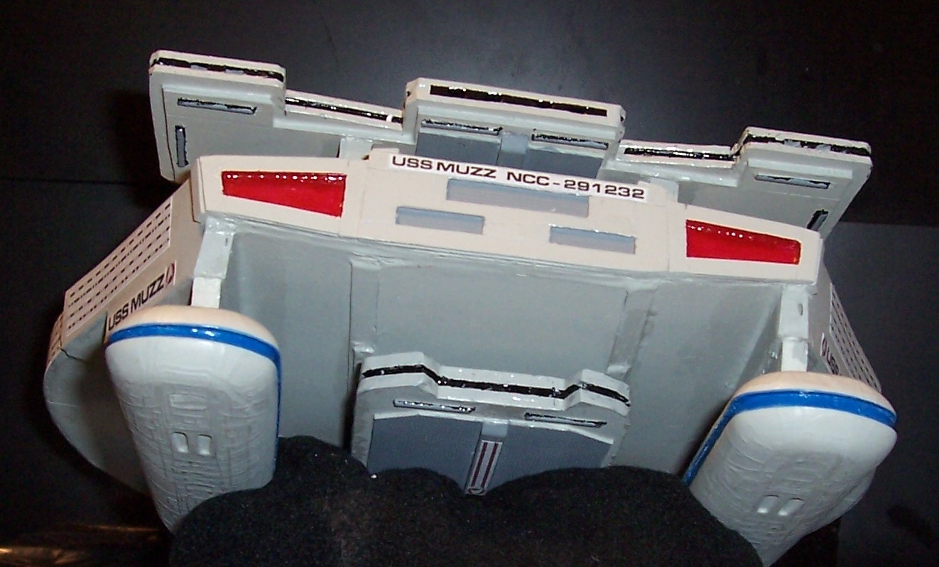 I give you the USS MUZZ, NCC-291232. A Scratch/Bash Styrene Model, 1000 Scale. The makings were done on my computer using graphics, Corel X6. Aprox, 12 inches long, 10 1/2 inches wide. There are 25 Torpedo Tubes, and aprox. 37 Phaser Strips. Main Bridge is located below the dome on top. The deflector below was made from scratch, No Kit was used.