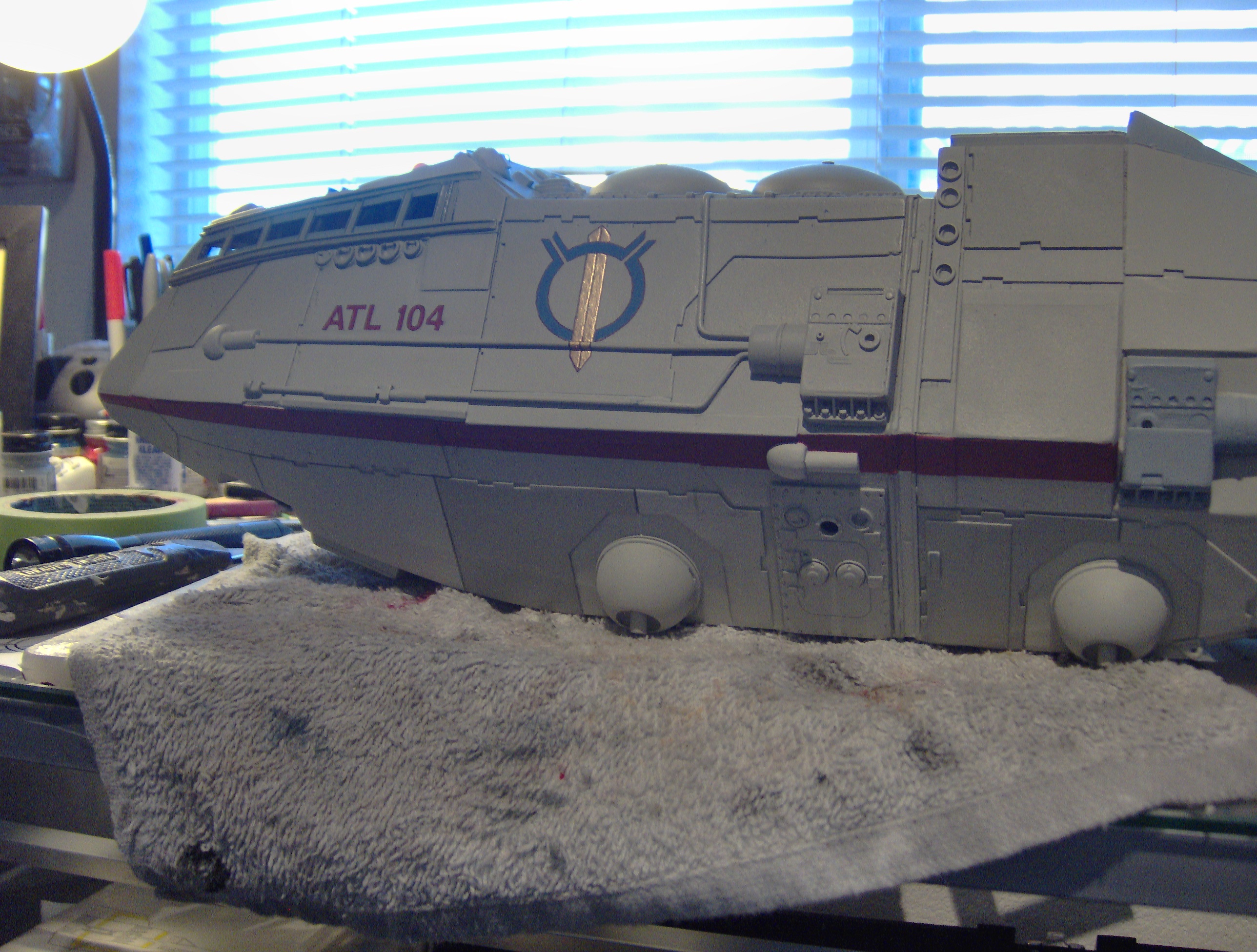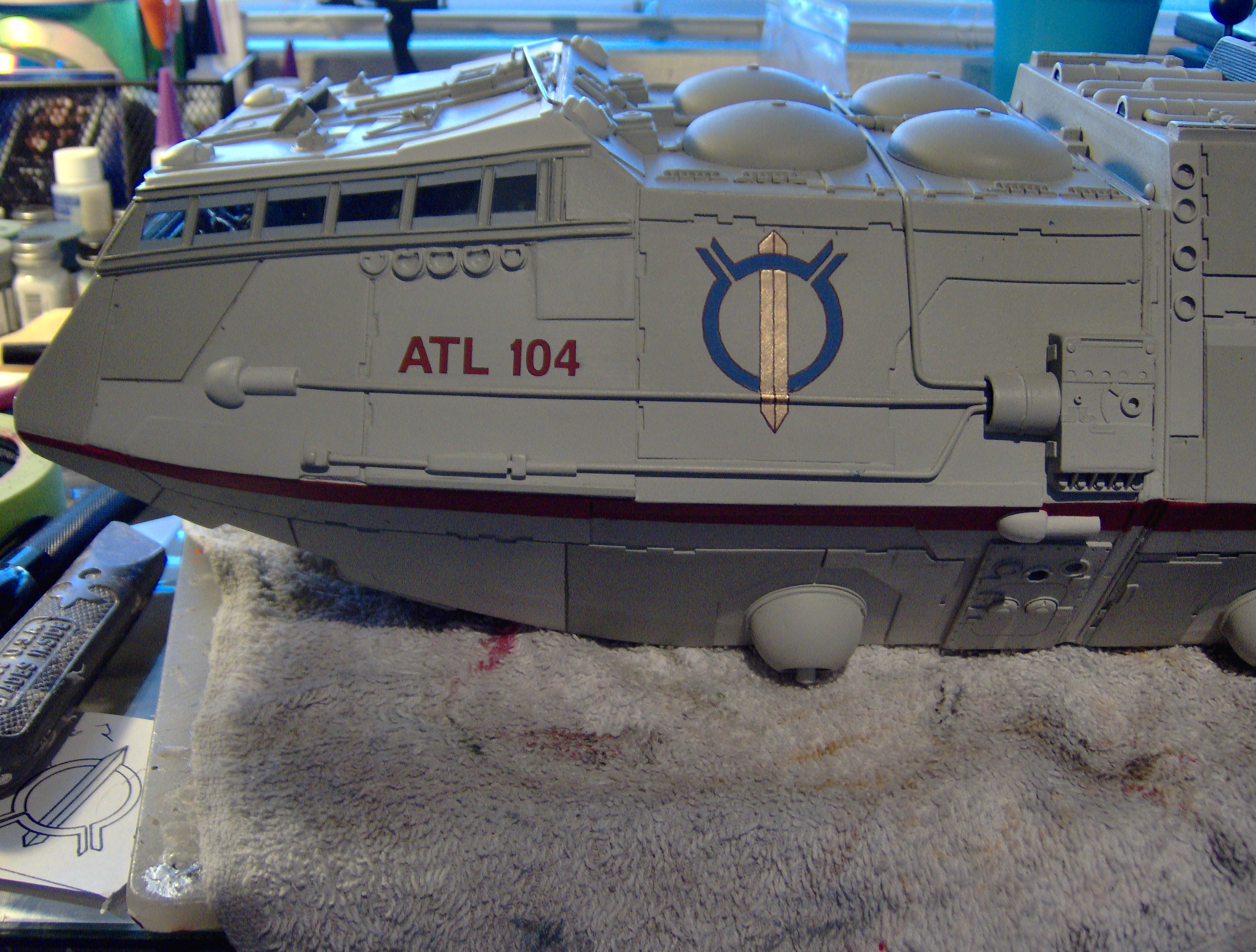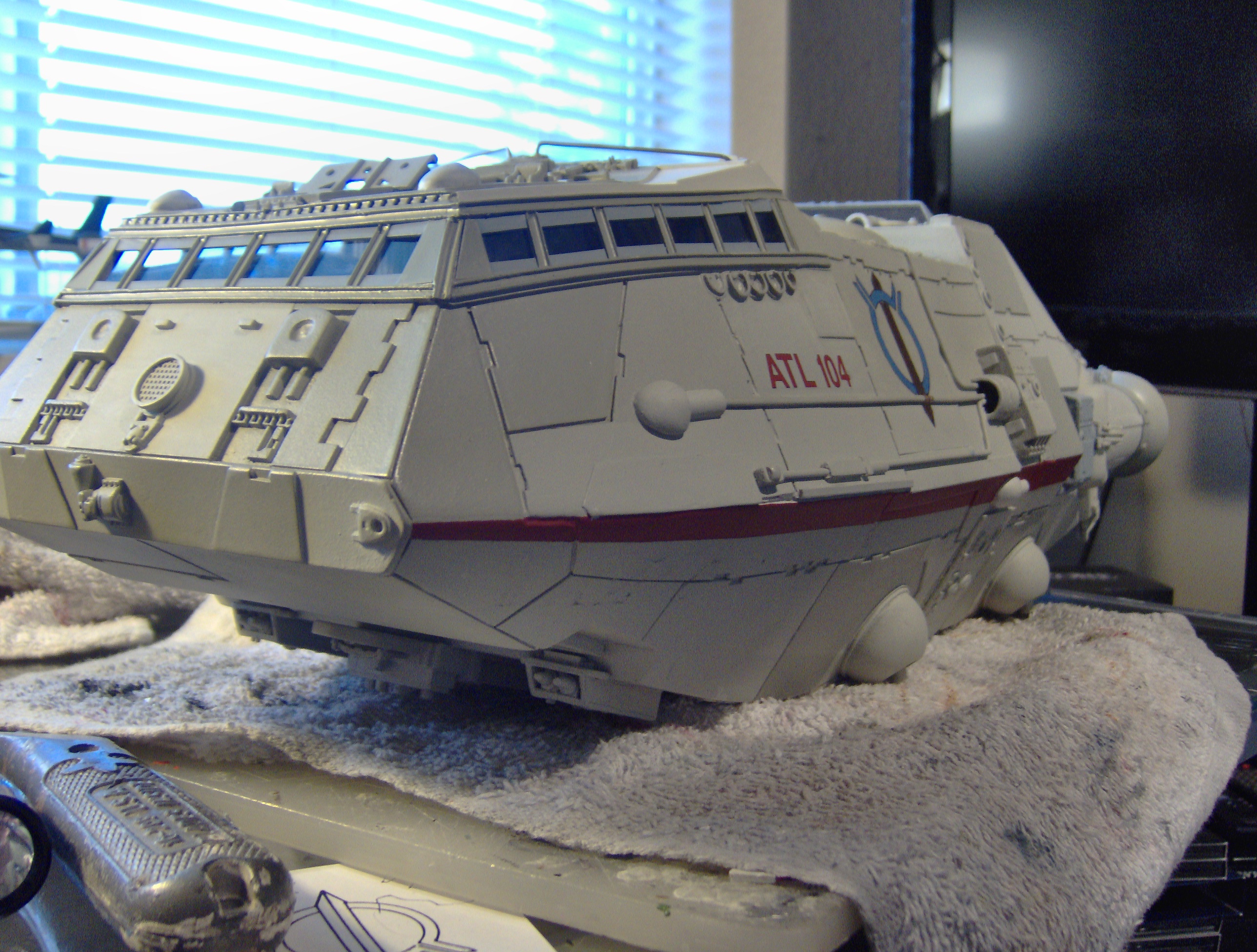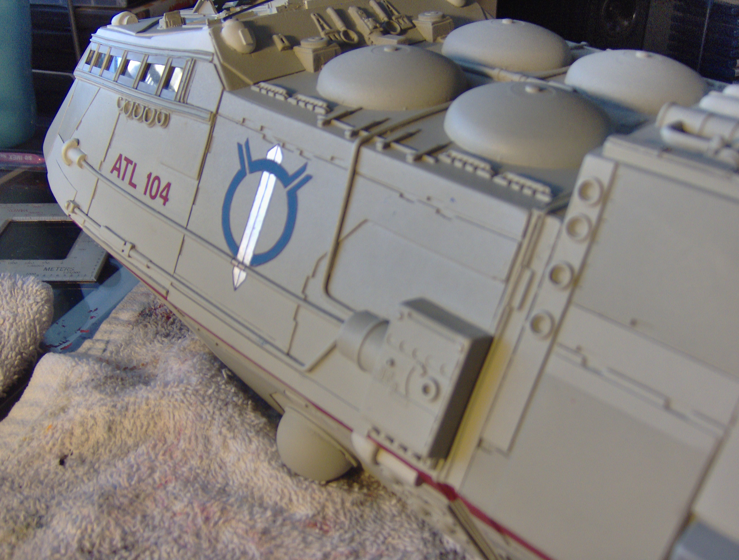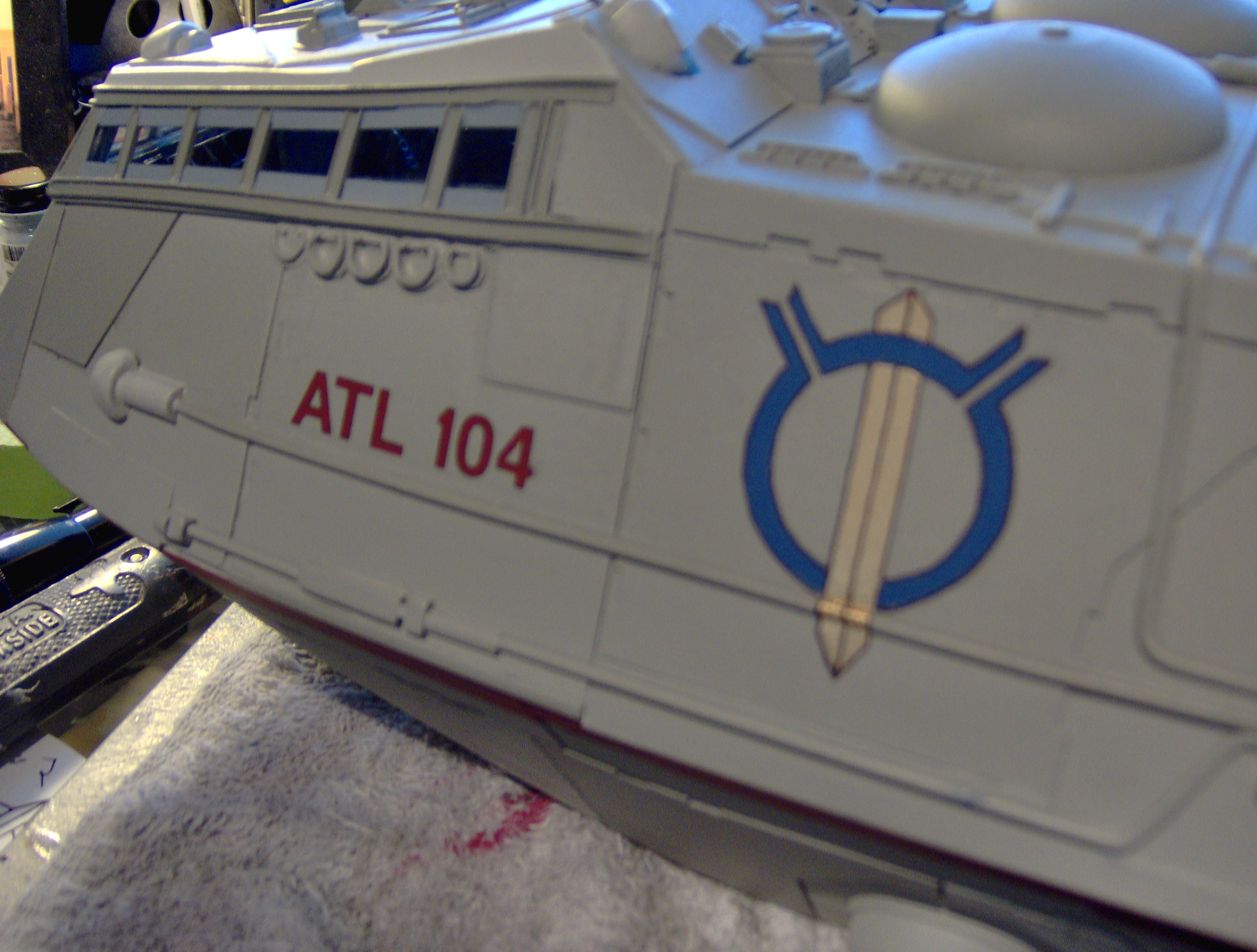 This piece is nearly finished by artist Marc Elkins! He has completely impressed me with his creativity in making this the one of a kind, (or at least the first to be this way), of the Atlantia Presidential Shuttle of Colonial President Adar! The markings were completely made to look like it is naturally from the series and film, but in fact, is completely made up by Marc. The added cockpit windows add the realism we are looking for when it is photographed. I love this! This will soon come to the Gallery for Blue Screen photos and display.