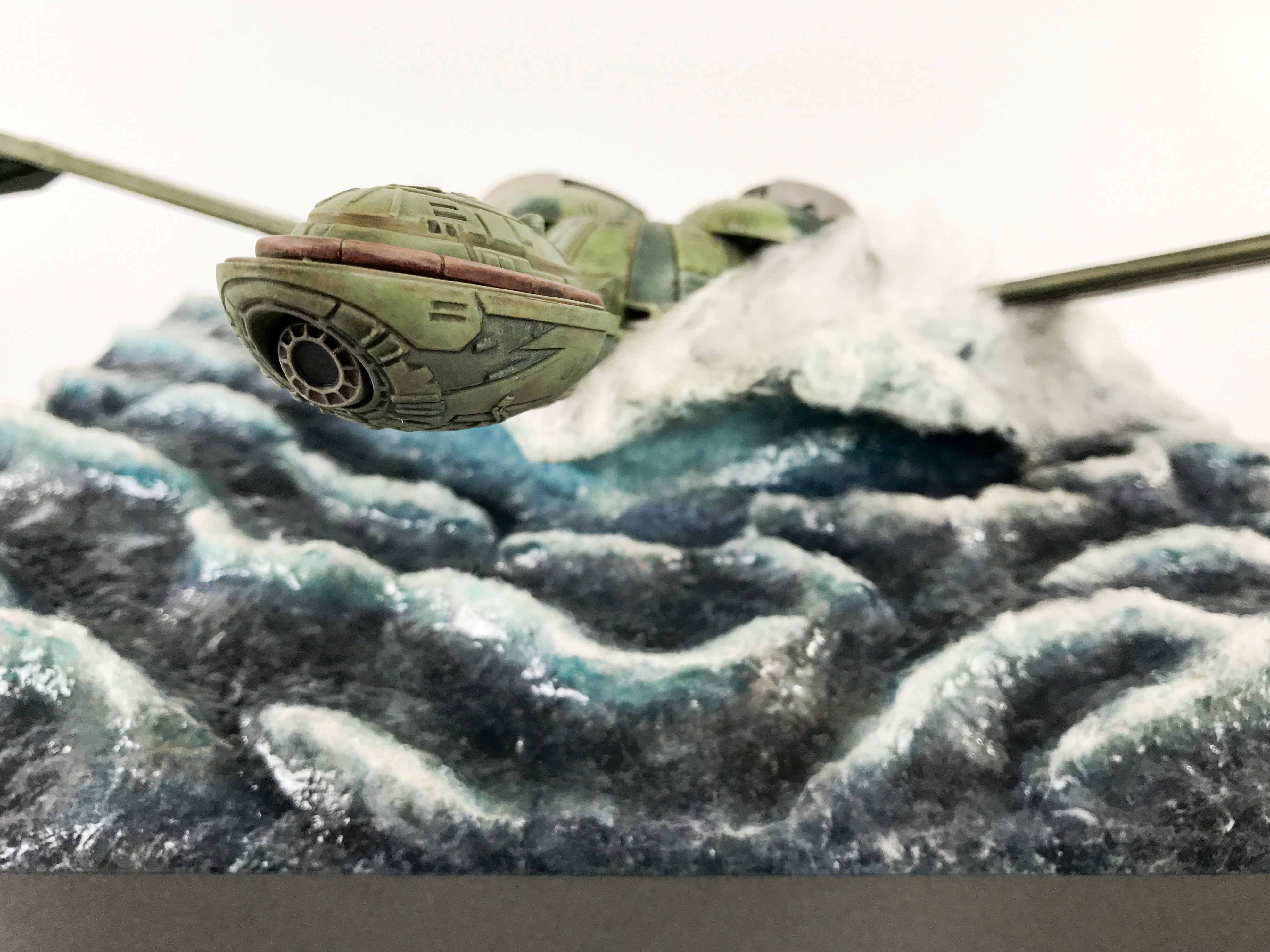 The base is a layered cake consisting of Styrofoam, covered with Sculptamold that was painted and dry brushed, followed by a layer of Liquitex Heavy Gel Gloss Medium for texture, followed by many layers of Liquitex Acrylic Gloss Medium for gloss and depth, followed by rayon cotton tufts for the spray effect, and finally topped off with Liquitex High Gloss Varnish on everything for a final gloss to all of the water, including lightly brushed onto the rayon tufts to add a water droplet/splash effect to the spray.