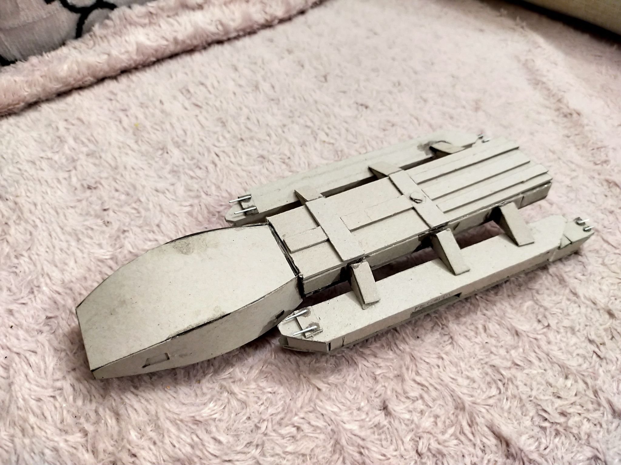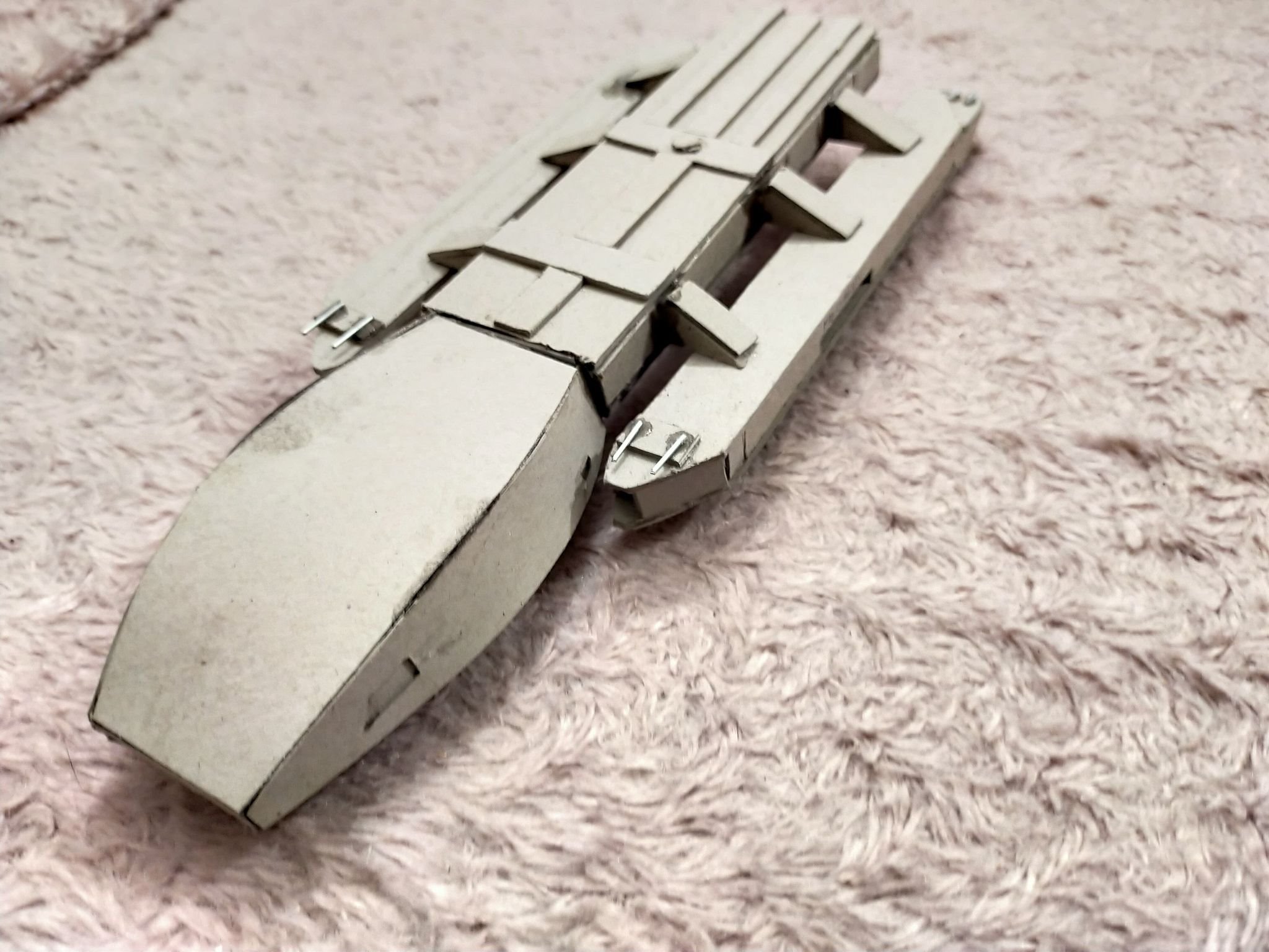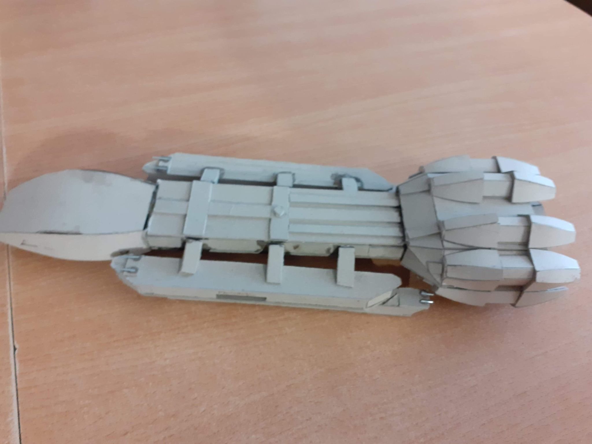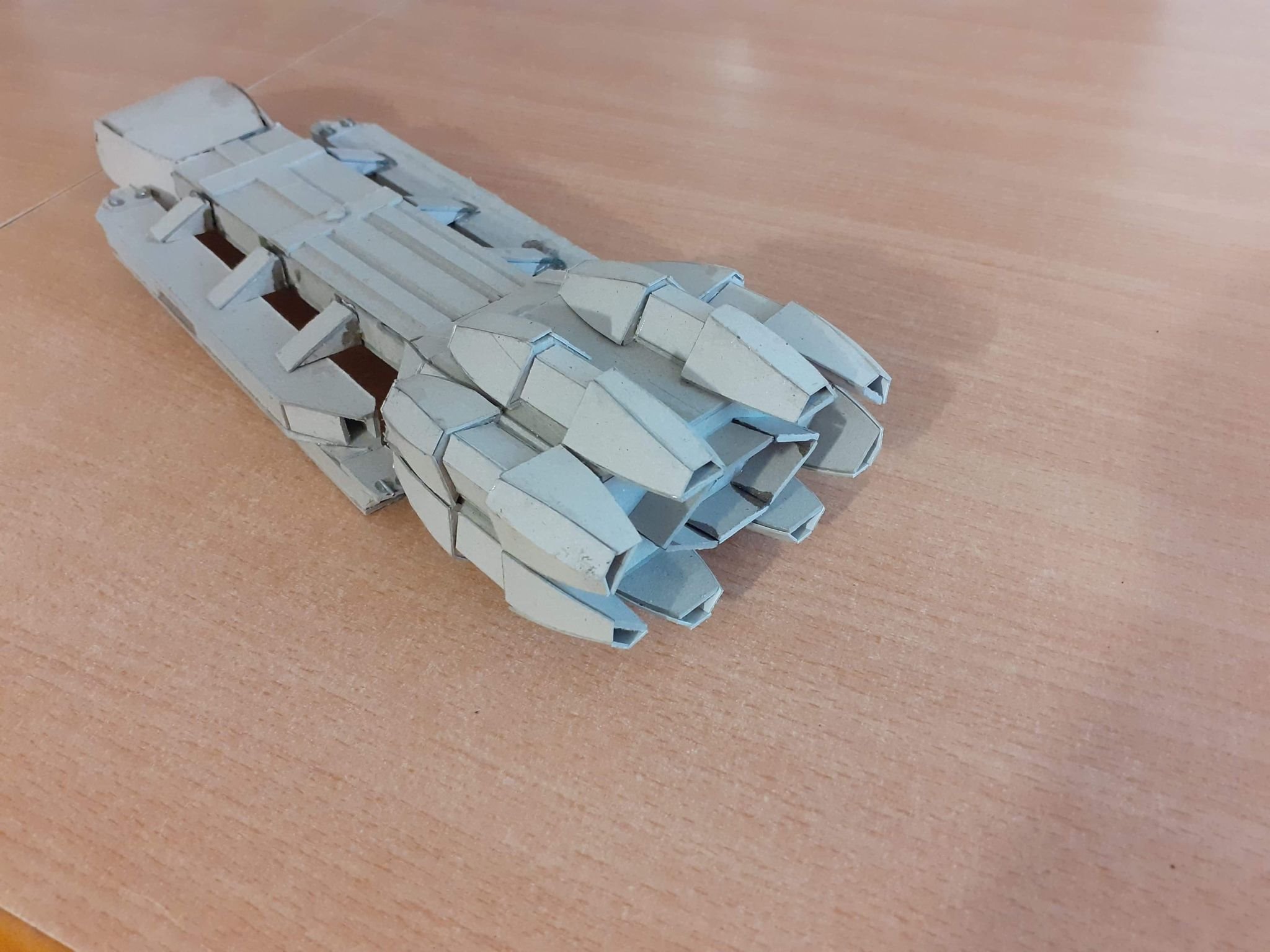 This young man has been inspired by his father, as well as viewing the art works shown here on Modeler Magic. Wiktor loves Battlestar Galactia, so he decided to make a Battlestar for himself. What you see here is his work in progress on his Battlestar build. Made with cardboard, Wiktor’s work reminds me of my first projects at that age. With the excellence I am seeing in his first (independent) build shown today, especially with the angle cut work, and shaping of the hull and engine section, I can see his future with this art form shall be amazing! Outstanding work Wiktor!