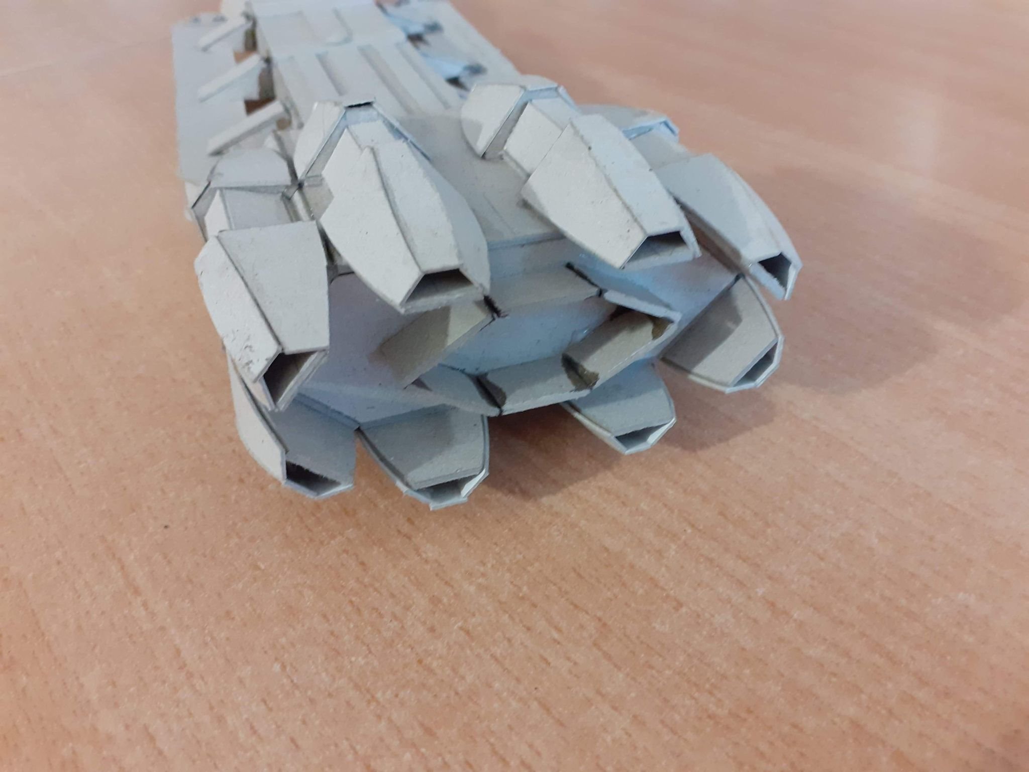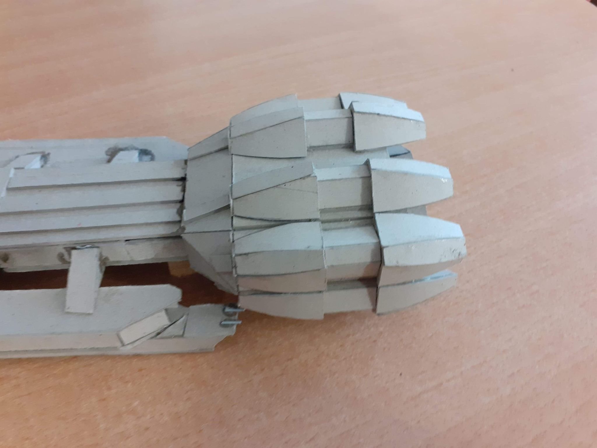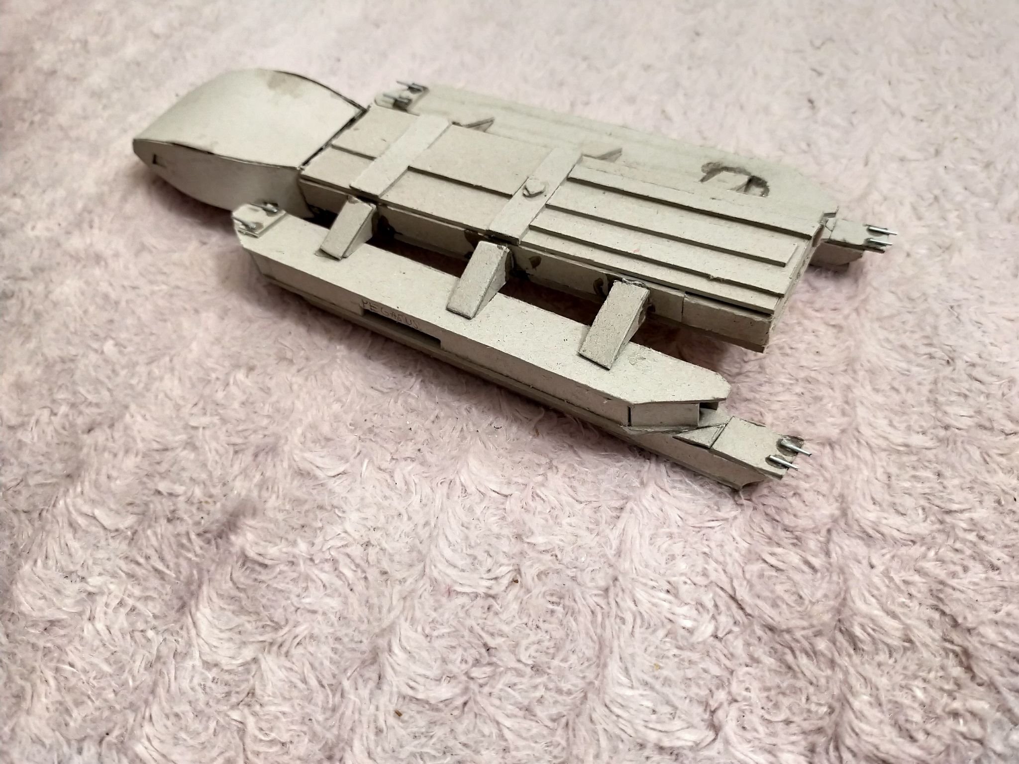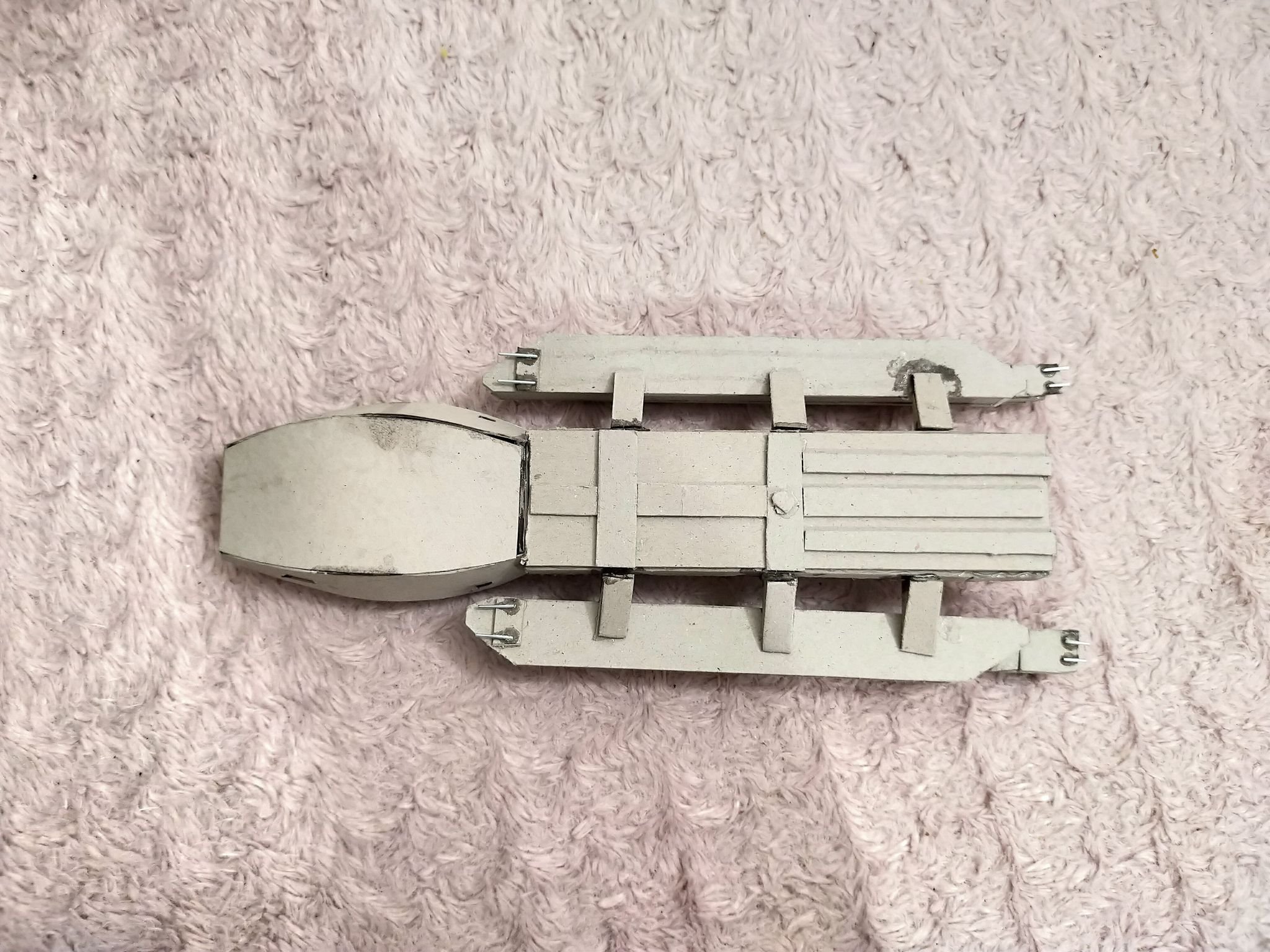 This young man has been inspired by his father, as well as viewing the art works shown here on Modeler Magic. Wiktor loves Battlestar Galactia, so he decided to make a Battlestar for himself. What you see here is his work in progress on his Battlestar build. Made with cardboard, Wiktor’s work reminds me of my first projects at that age. With the excellence I am seeing in his first (independent) build shown today, especially with the angle cut work, and shaping of the hull and engine section, I can see his future with this art form shall be amazing! Outstanding work Wiktor!