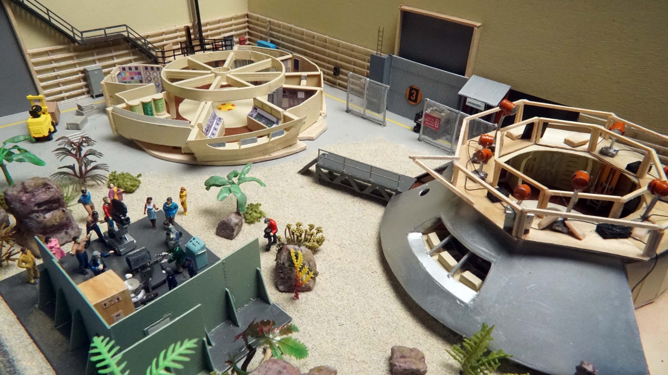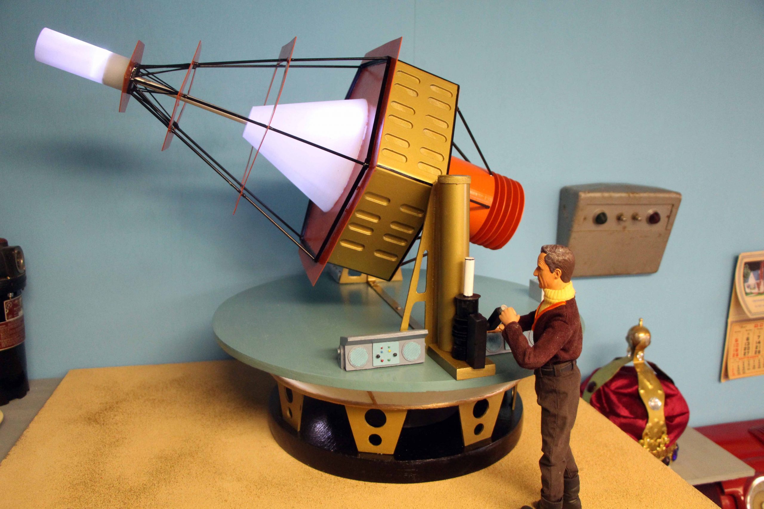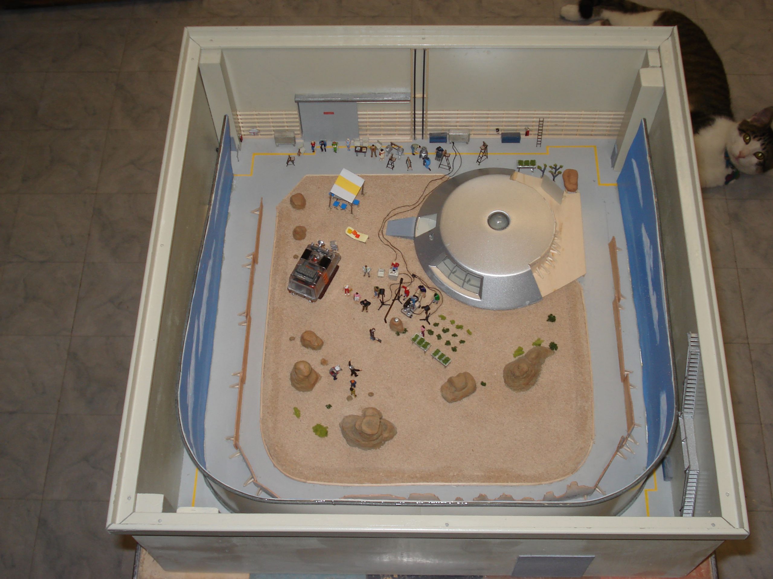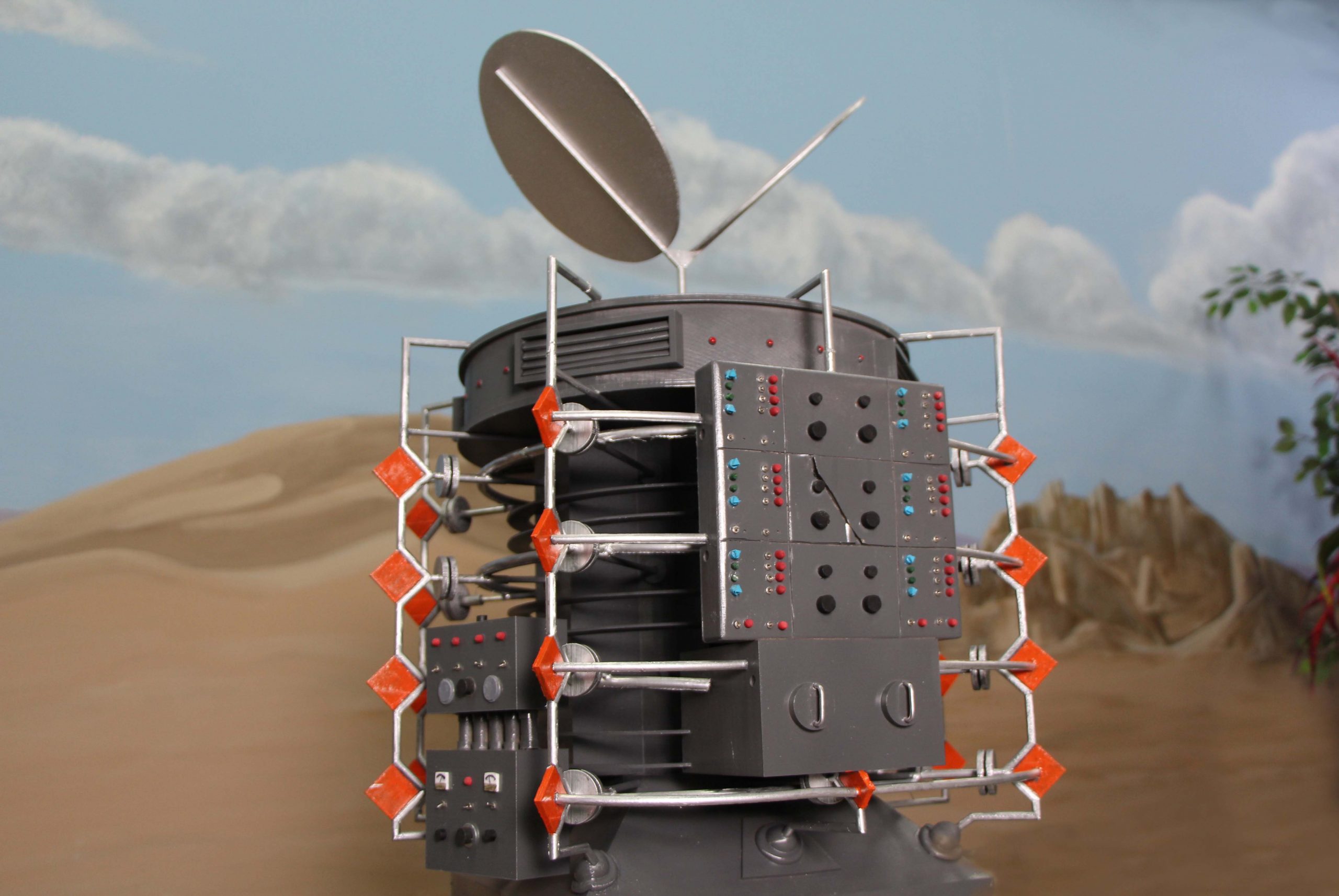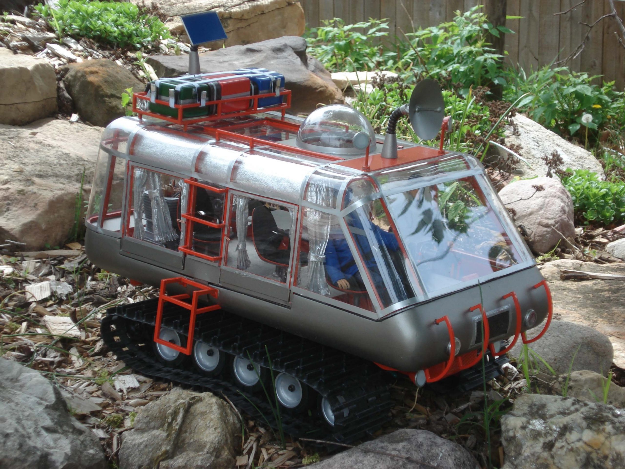I used the 3rd season Sci Fi Metropolis figures for the 1/6th scale Condemned of Space diorama and for the other 1st and 2nd season 1/6th scale figures, Bob Aucutt made them for me. Gary Stair printed a few of the 1/24th and 1/35 scale figures but mostly I would use generic G scale model railroad figures and painted the uniforms on them. I even used N scale figures for the Visit to a Hostile Planet diorama, that was my smallest scale diorama. For the movie stage dioramas, I made them in 1/87th scale so I could use HO scale figures and building parts. I did use a 9″ Trendmaster Dr. Smith for the monster pea pod diorama. The Jupiter 2’s range from 4″ and 6″ vacuum formed or resin spaceships up to a four foot Jupiter 2 on the landing circle. The Blast Off Into Space diorama used a Lunar Models two foot Jupiter 2 and Moebius Chariot. Lunar Models made the Invaders From the Fifth Dimension spaceship and the Keeper spider kit and the Tucker spaceship and the One of Our Dogs is Missing capsule are more recent resin garage kits. The Hapgood spaceship, Travelin Man, was 3D printed at 1/10th scale and the matter transfer machine was also 3D printed. The Chariot is 1/10th scale and is radio controlled. It is built on a Kyosho Blizzard tracked running gear.