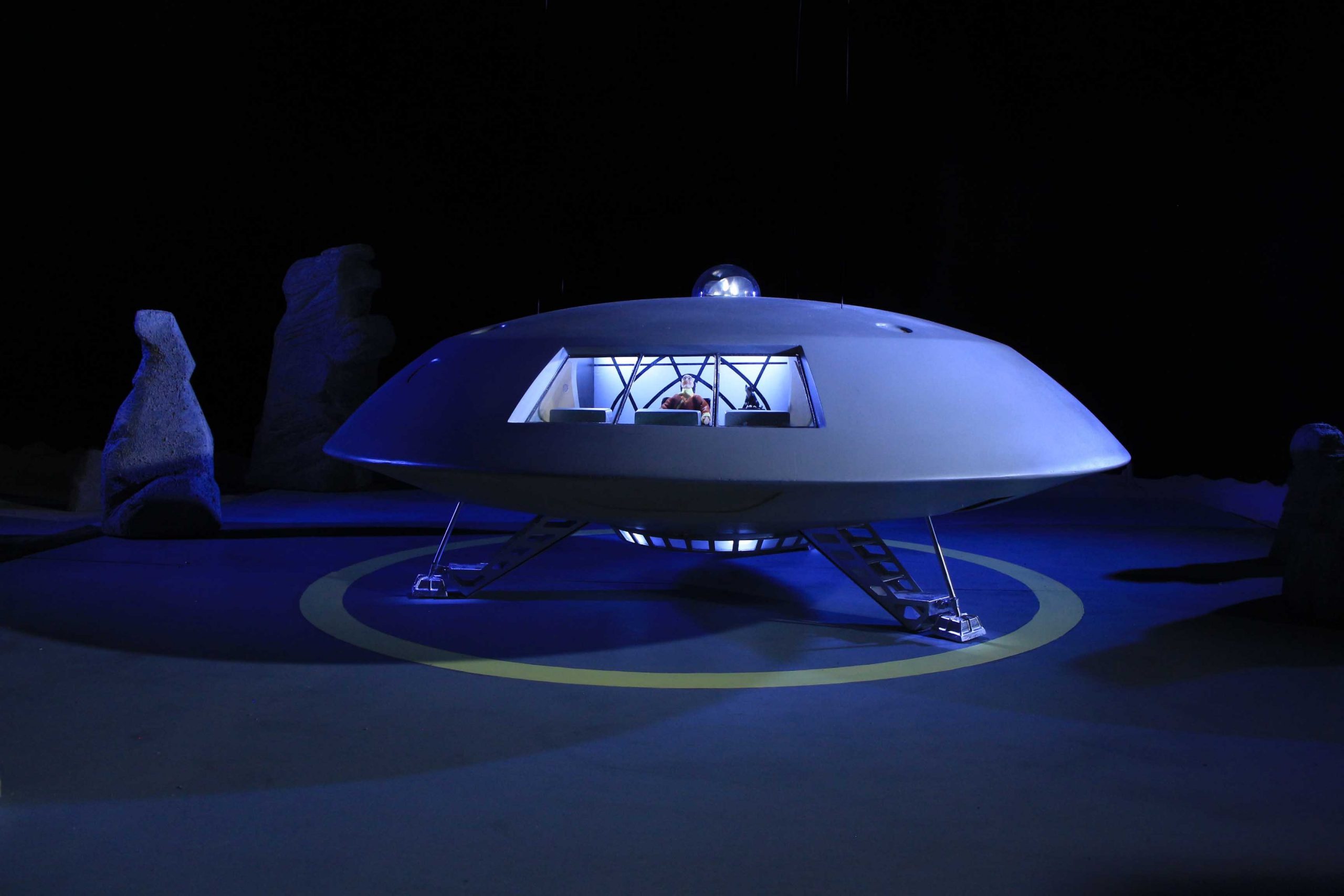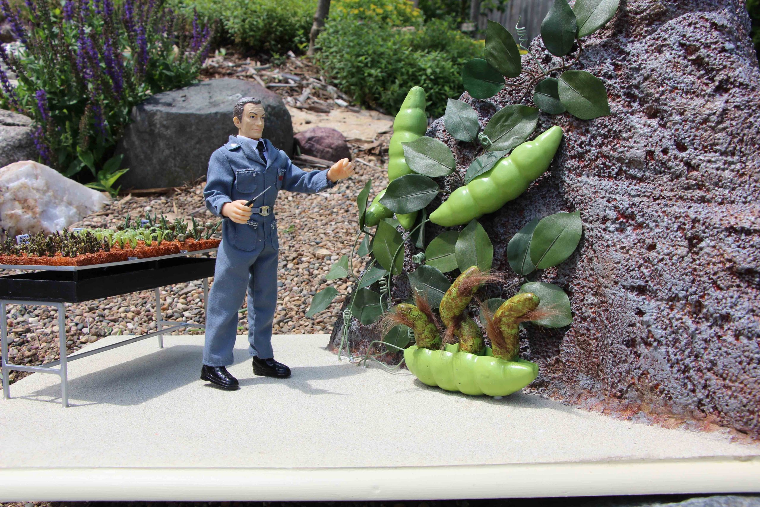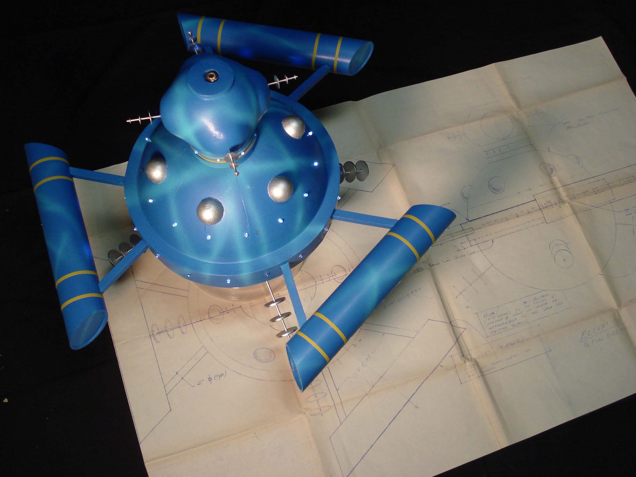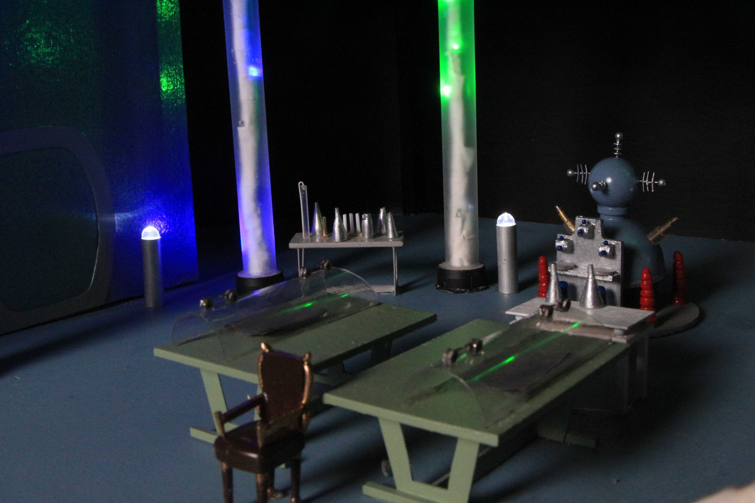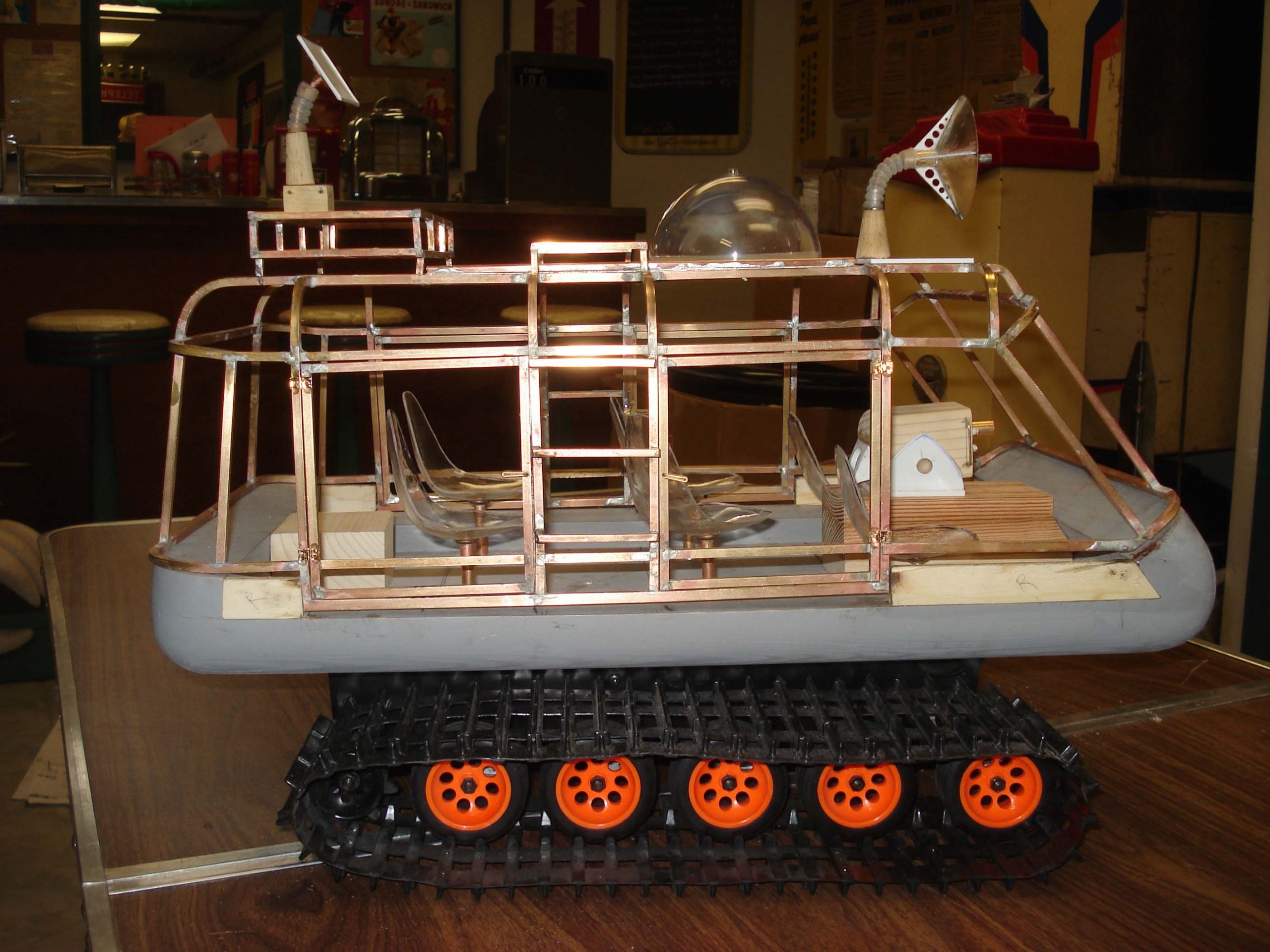 I used the 3rd season Sci Fi Metropolis figures for the 1/6th scale Condemned of Space diorama and for the other 1st and 2nd season 1/6th scale figures, Bob Aucutt made them for me. Gary Stair printed a few of the 1/24th and 1/35 scale figures but mostly I would use generic G scale model railroad figures and painted the uniforms on them. I even used N scale figures for the Visit to a Hostile Planet diorama, that was my smallest scale diorama. For the movie stage dioramas, I made them in 1/87th scale so I could use HO scale figures and building parts. I did use a 9″ Trendmaster Dr. Smith for the monster pea pod diorama. The Jupiter 2’s range from 4″ and 6″ vacuum formed or resin spaceships up to a four foot Jupiter 2 on the landing circle. The Blast Off Into Space diorama used a Lunar Models two foot Jupiter 2 and Moebius Chariot. Lunar Models made the Invaders From the Fifth Dimension spaceship and the Keeper spider kit and the Tucker spaceship and the One of Our Dogs is Missing capsule are more recent resin garage kits. The Hapgood spaceship, Travelin Man, was 3D printed at 1/10th scale and the matter transfer machine was also 3D printed. The Chariot is 1/10th scale and is radio controlled. It is built on a Kyosho Blizzard tracked running gear.