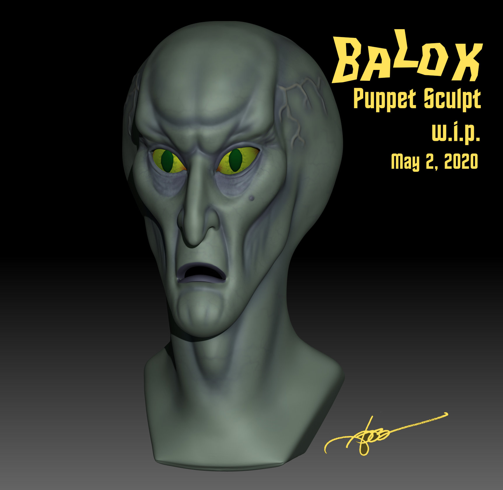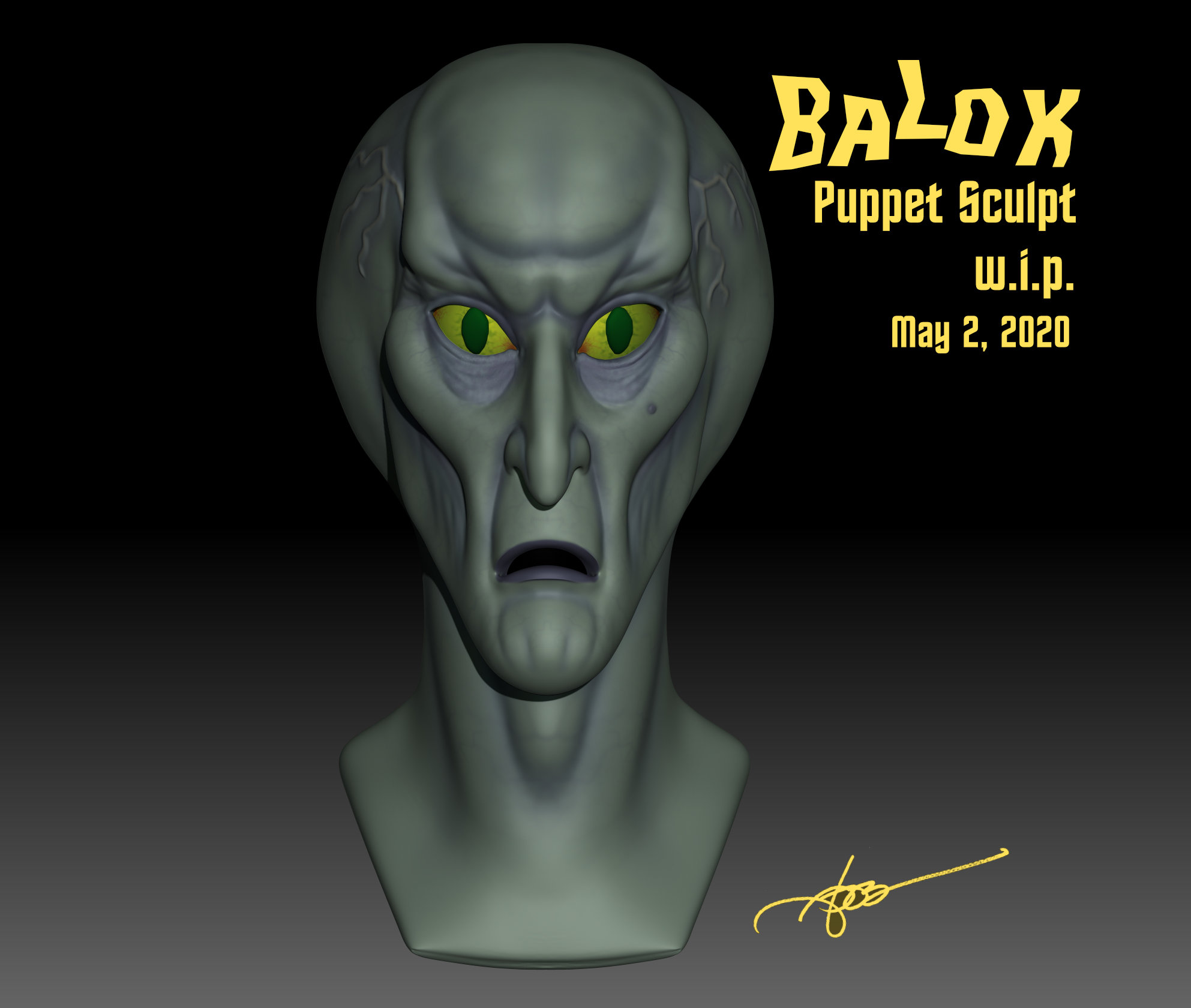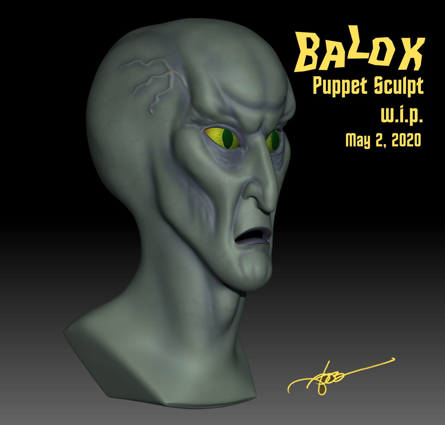 Here is the Balok head I created and printed up in 1:1 scale. 3D Trekker saw my work here on Modeler Magic, especially the Ceti eel and commissioned me to sculpt a Balok head. I naturally accepted the challenge and went to work. Working in the evenings, 10 hours later the Balok head was done and ready to go. I did some studies, looking at the actual prop head that has survived, though in a dilapidated state, I was able to get the shape of the head, vein patterns, etc. I even did some digital color renderings to get the colors right and to place in my portfolio.
