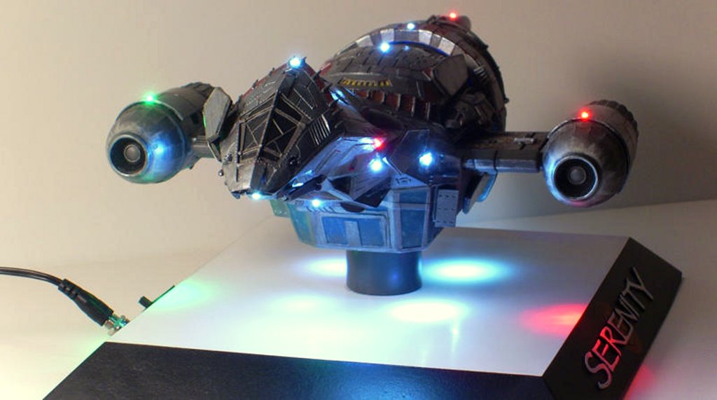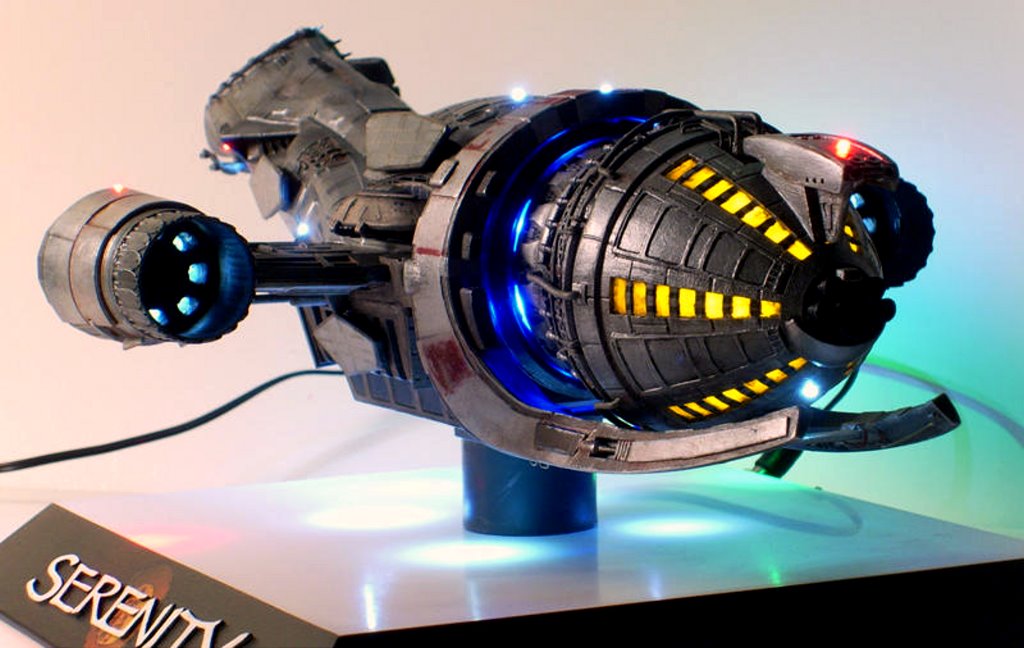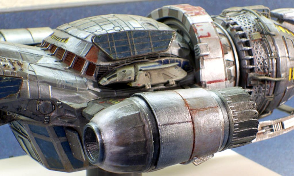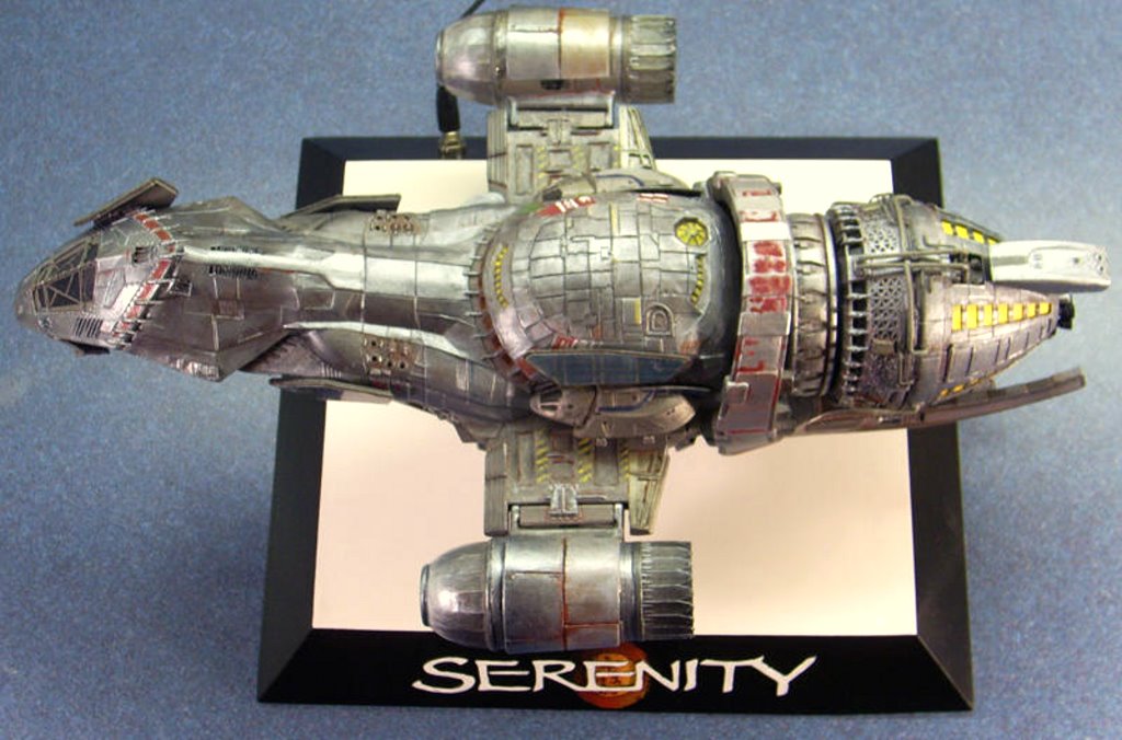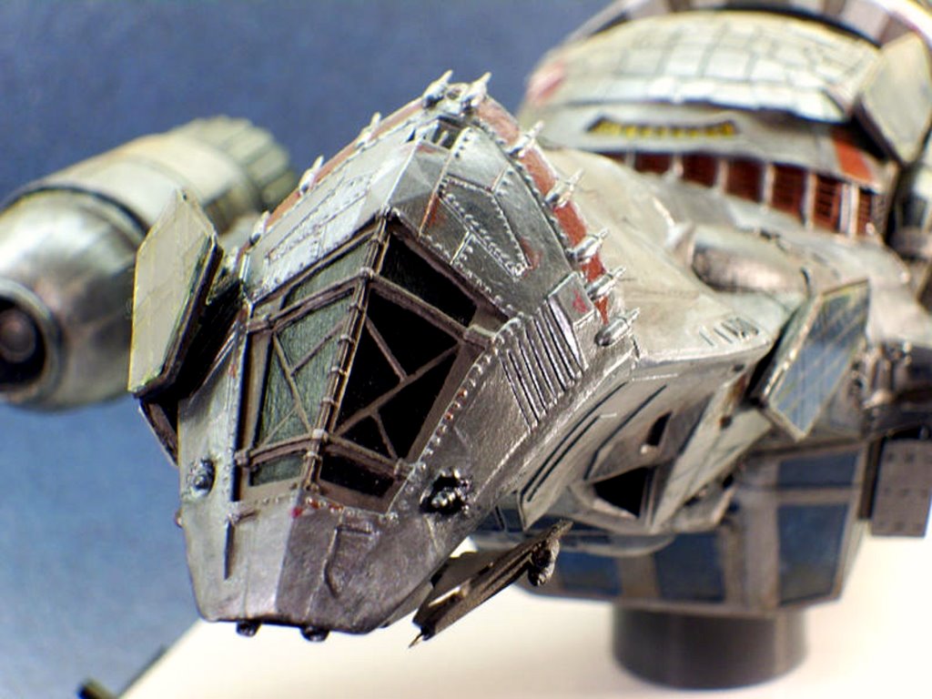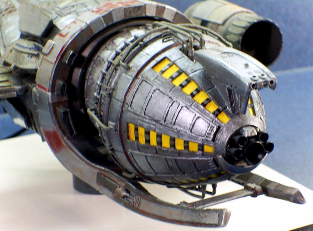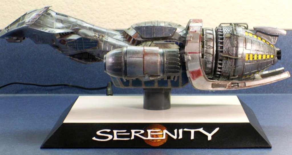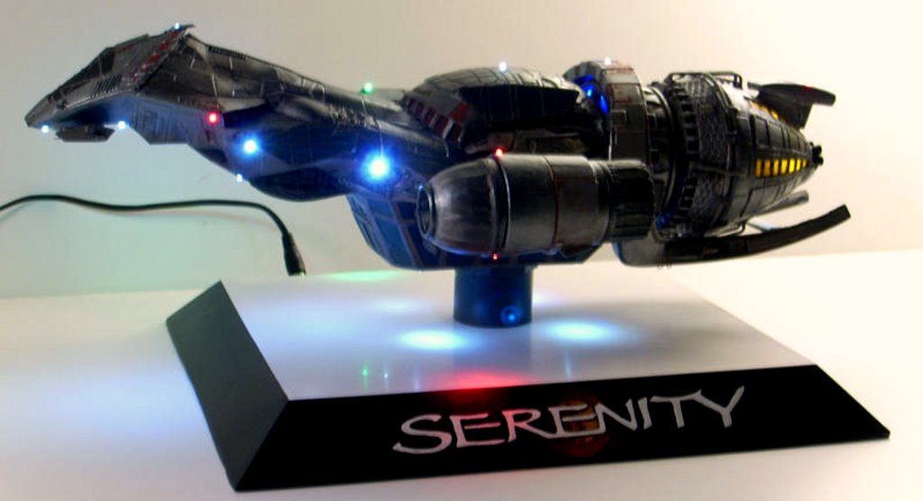 Here’s my 2009 Firefly Serenity build from the kit once offered years ago by Tony Lamb (Hunk of Junk Productions). It is no longer available. This was originally shown here on Modeler Magic back on January 31, 2011. On this one I added some extra details, like paneling and the rivets around the cockpit. The main thing I also added was the lighting, which was difficult since most of the model was solid. I got the electronic parts from Voodoo FX and they work quite well. The lights on the gravity wheel are on a chaser chip similar to the QMx replica, although this uses few lights. The ship is about 14″ long.