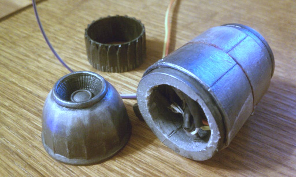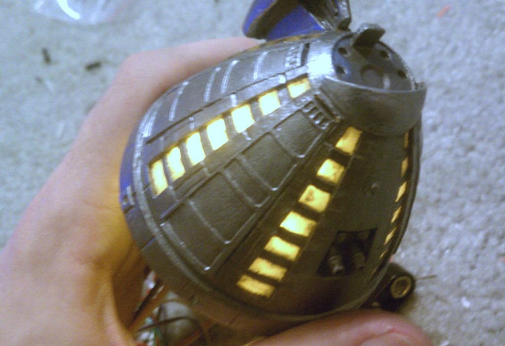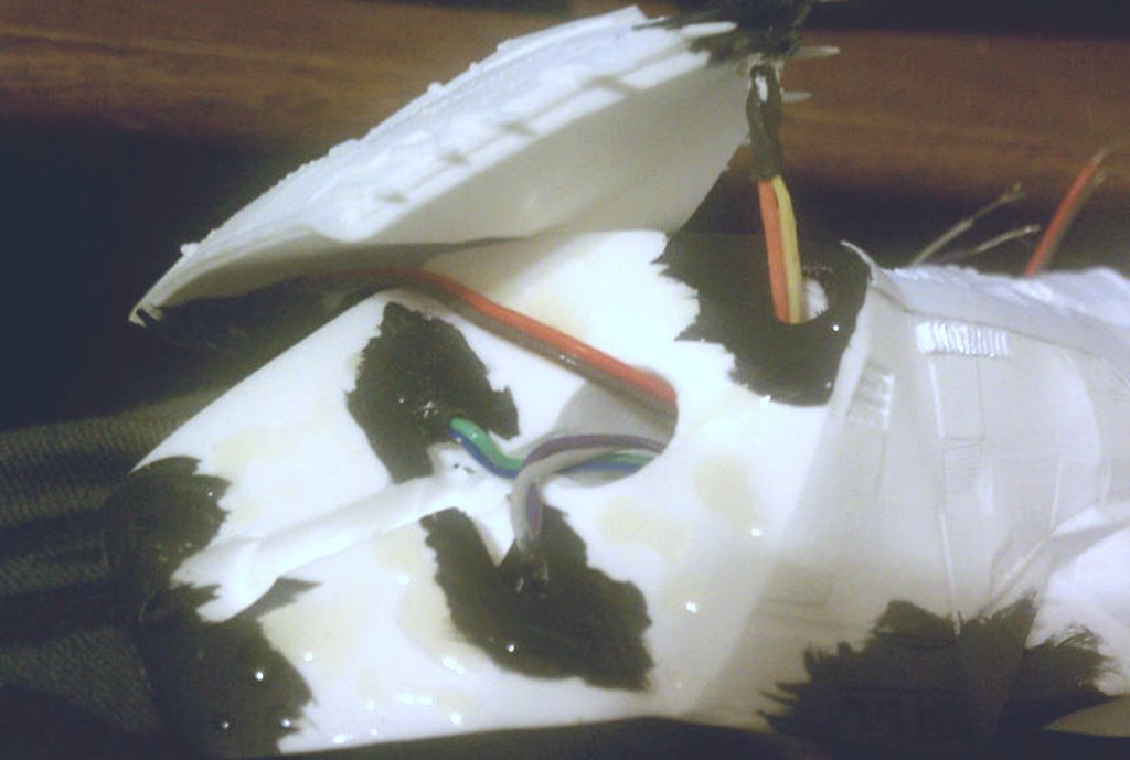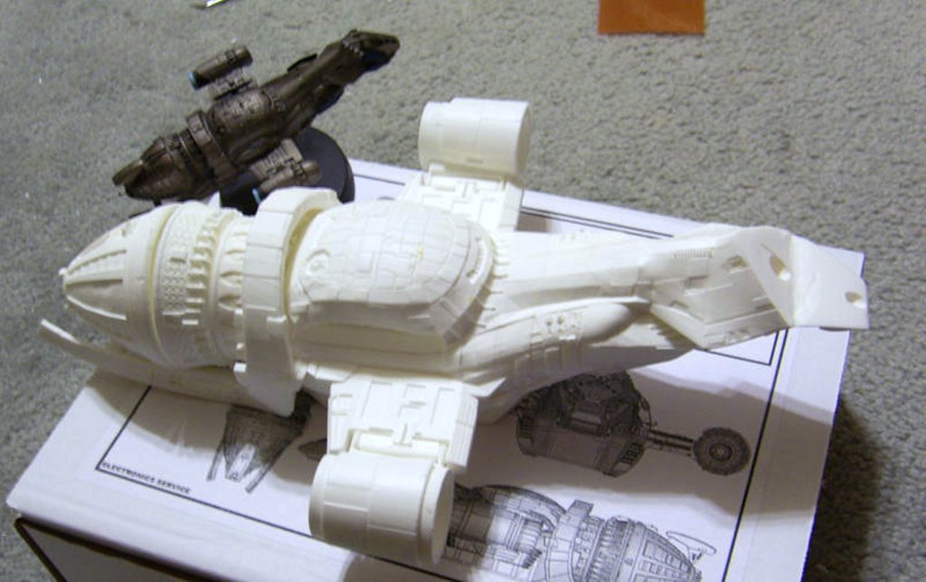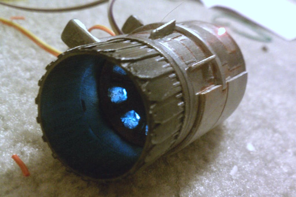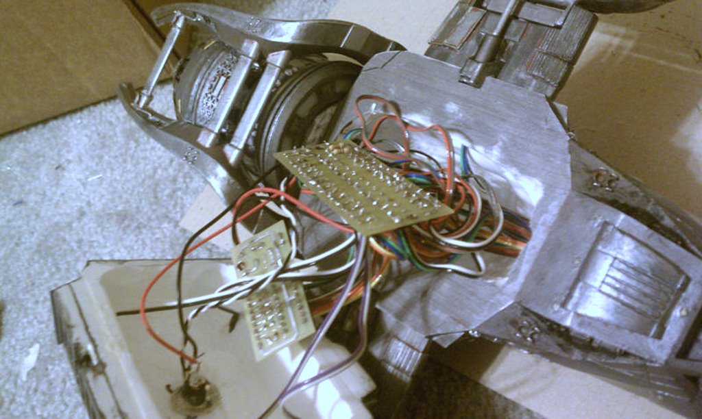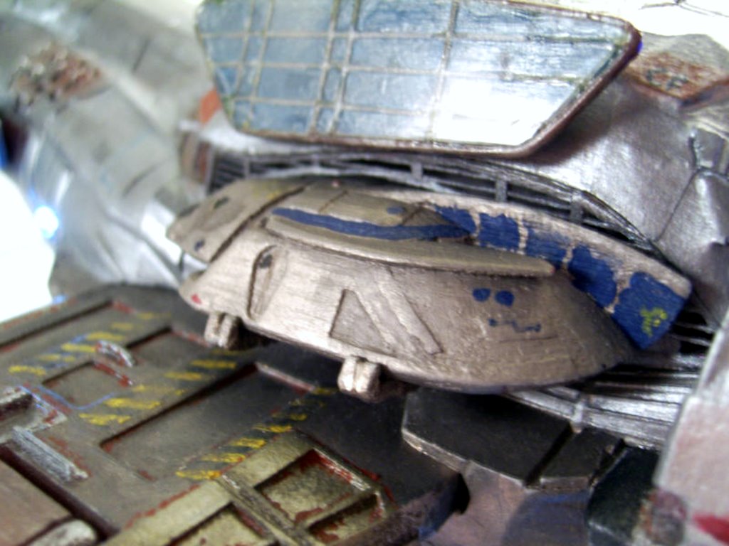 Here’s my 2009 Firefly Serenity build from the kit once offered years ago by Tony Lamb (Hunk of Junk Productions). It is no longer available. This was originally shown here on Modeler Magic back on January 31, 2011. On this one I added some extra details, like paneling and the rivets around the cockpit. The main thing I also added was the lighting, which was difficult since most of the model was solid. I got the electronic parts from Voodoo FX and they work quite well. The lights on the gravity wheel are on a chaser chip similar to the QMx replica, although this uses few lights. The ship is about 14″ long.
