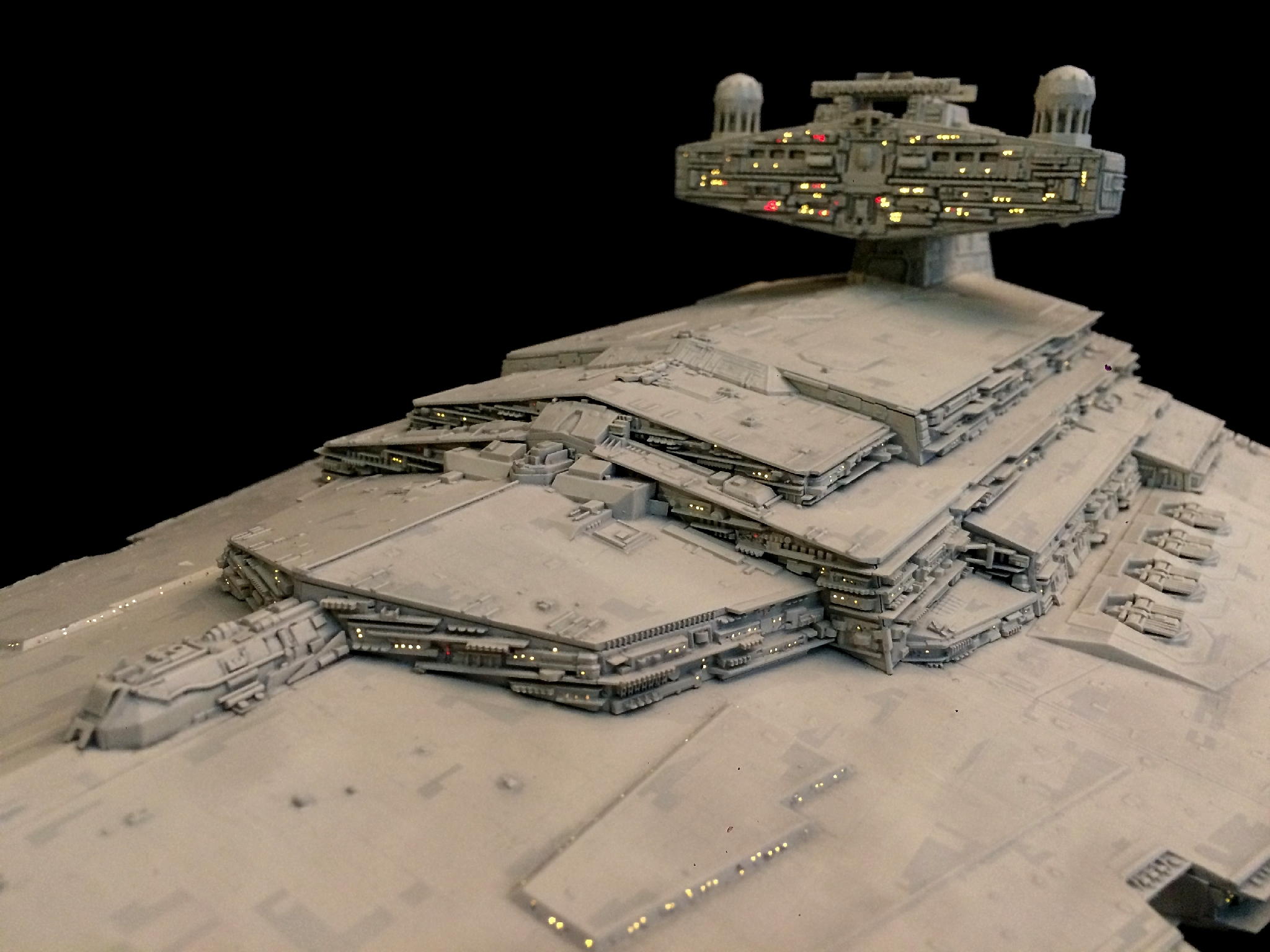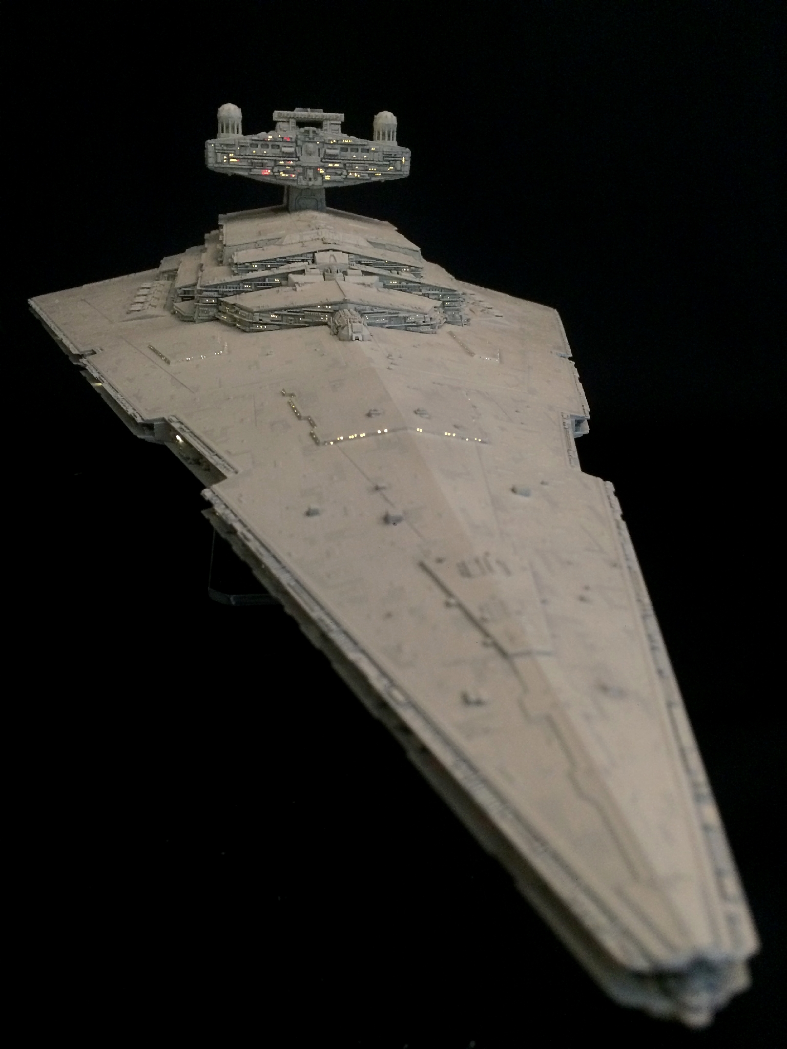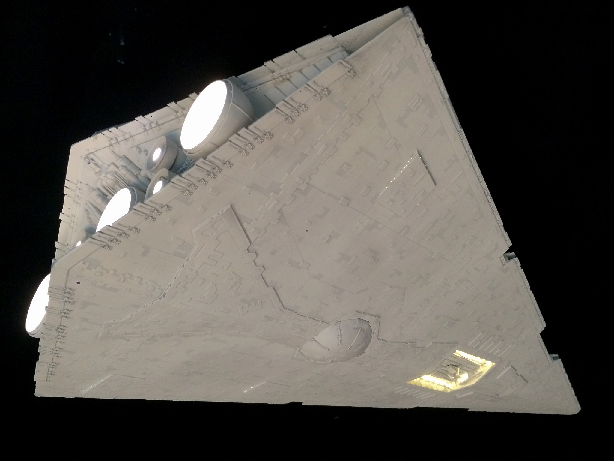 This is my StarDestroyer from Zvezda. On this one, I added a lot of greebles / missing details with styrene. I also redone the hangar bay and scratched the “waste dump” on the main tour. I choose some very warm white leds to be accurate to the studio model. The tiny Falcon is 3D printing…