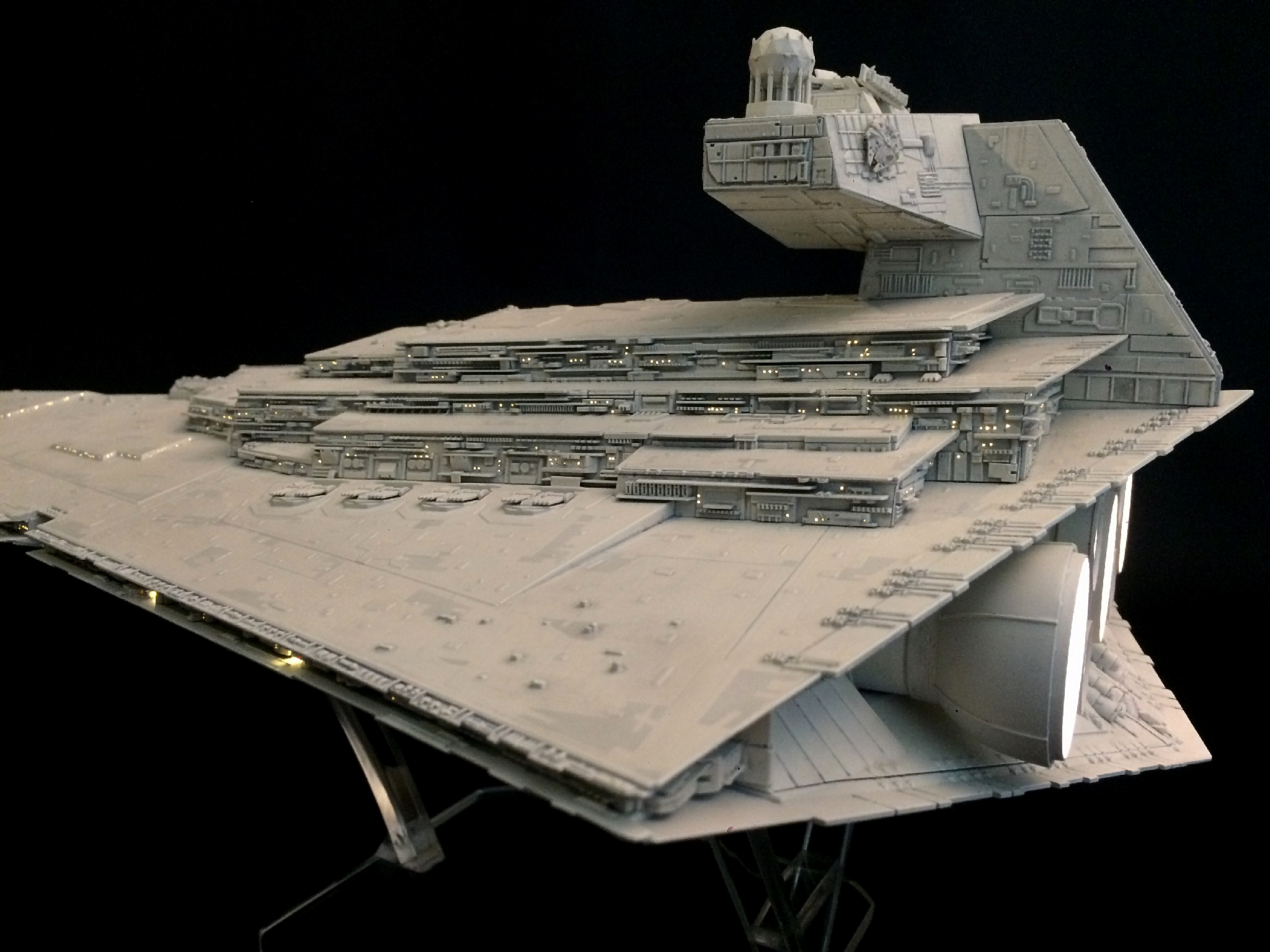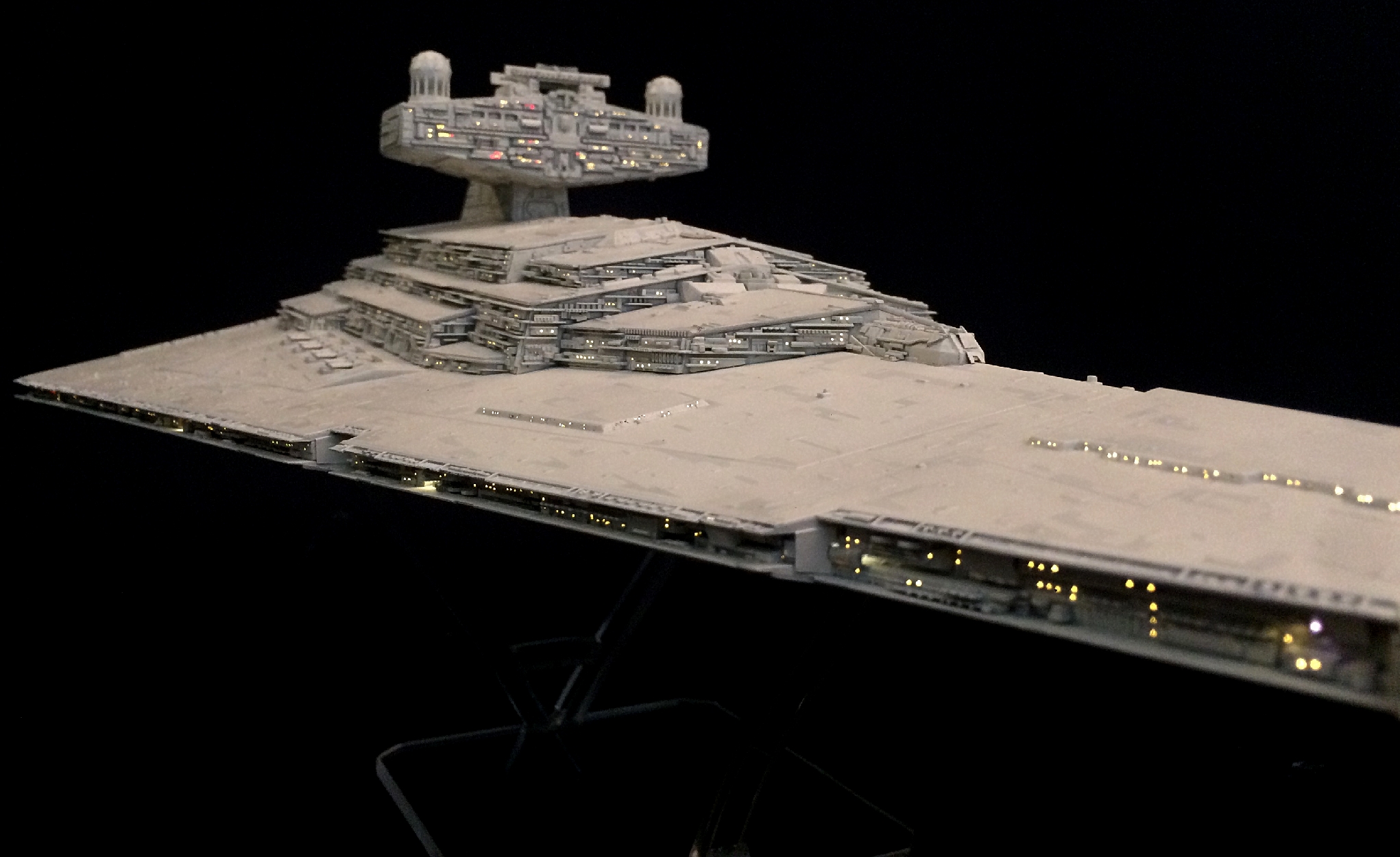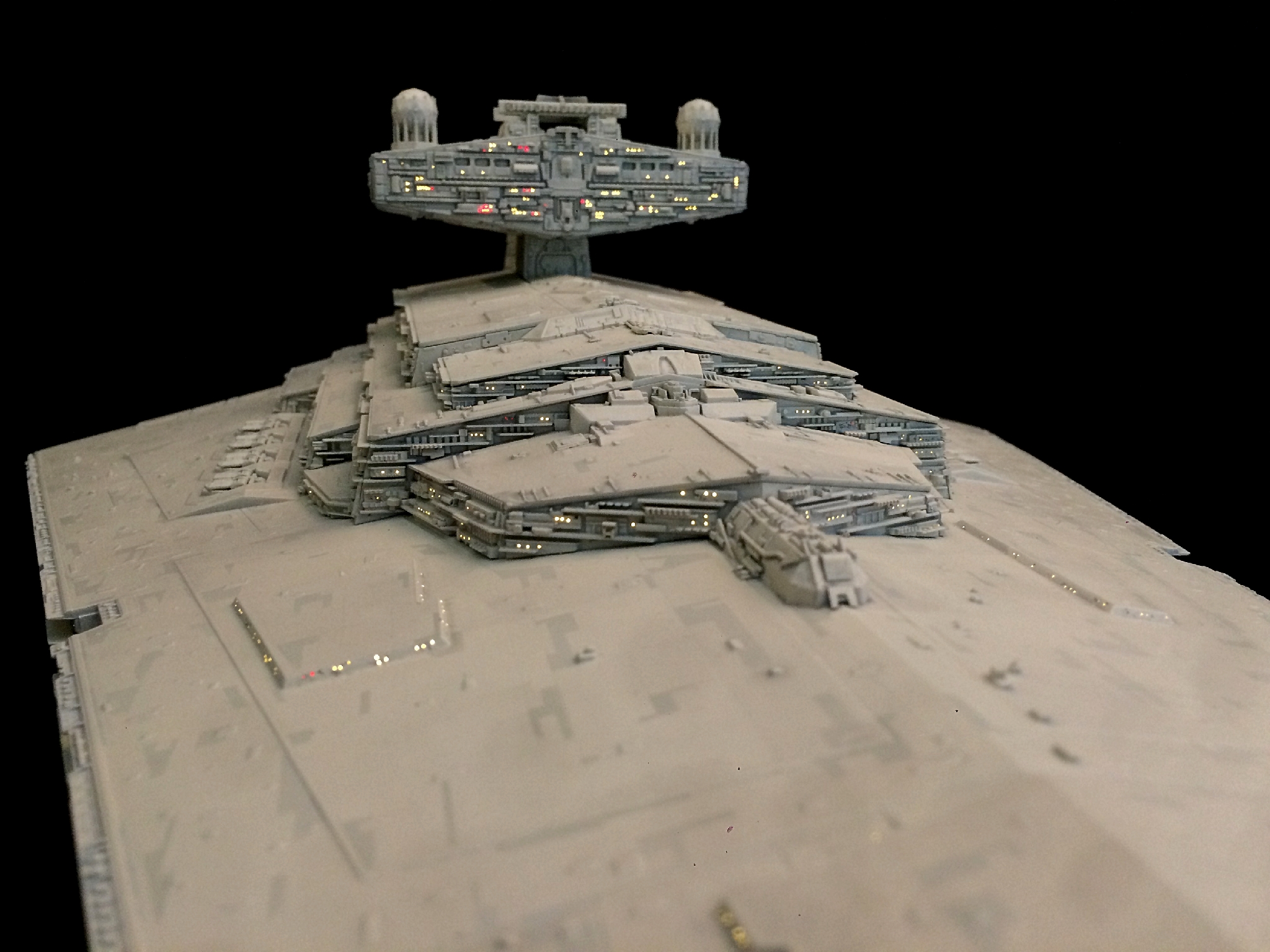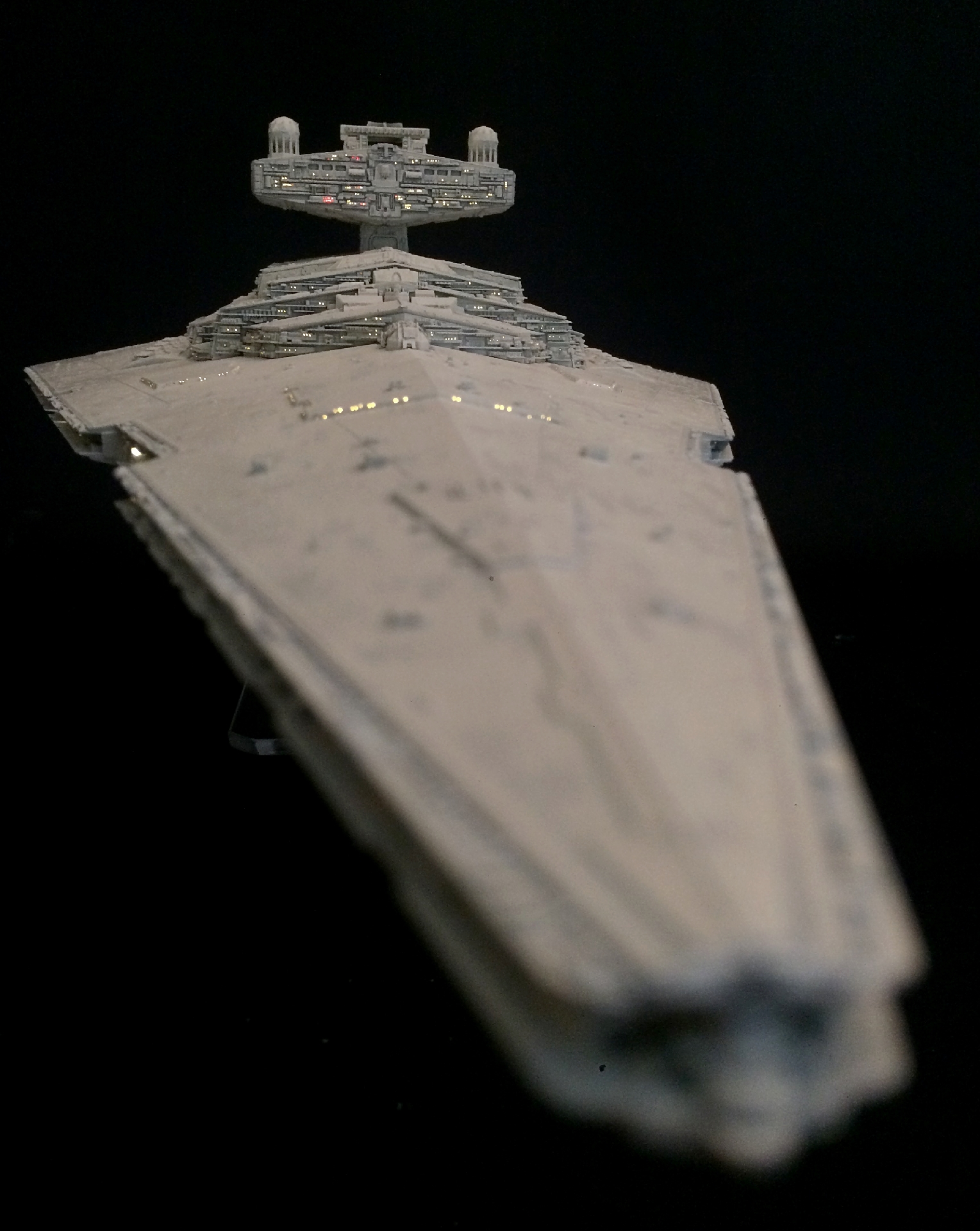 This is my StarDestroyer from Zvezda. On this one, I added a lot of greebles / missing details with styrene. I also redone the hangar bay and scratched the “waste dump” on the main tour. I choose some very warm white leds to be accurate to the studio model. The tiny Falcon is 3D printing…